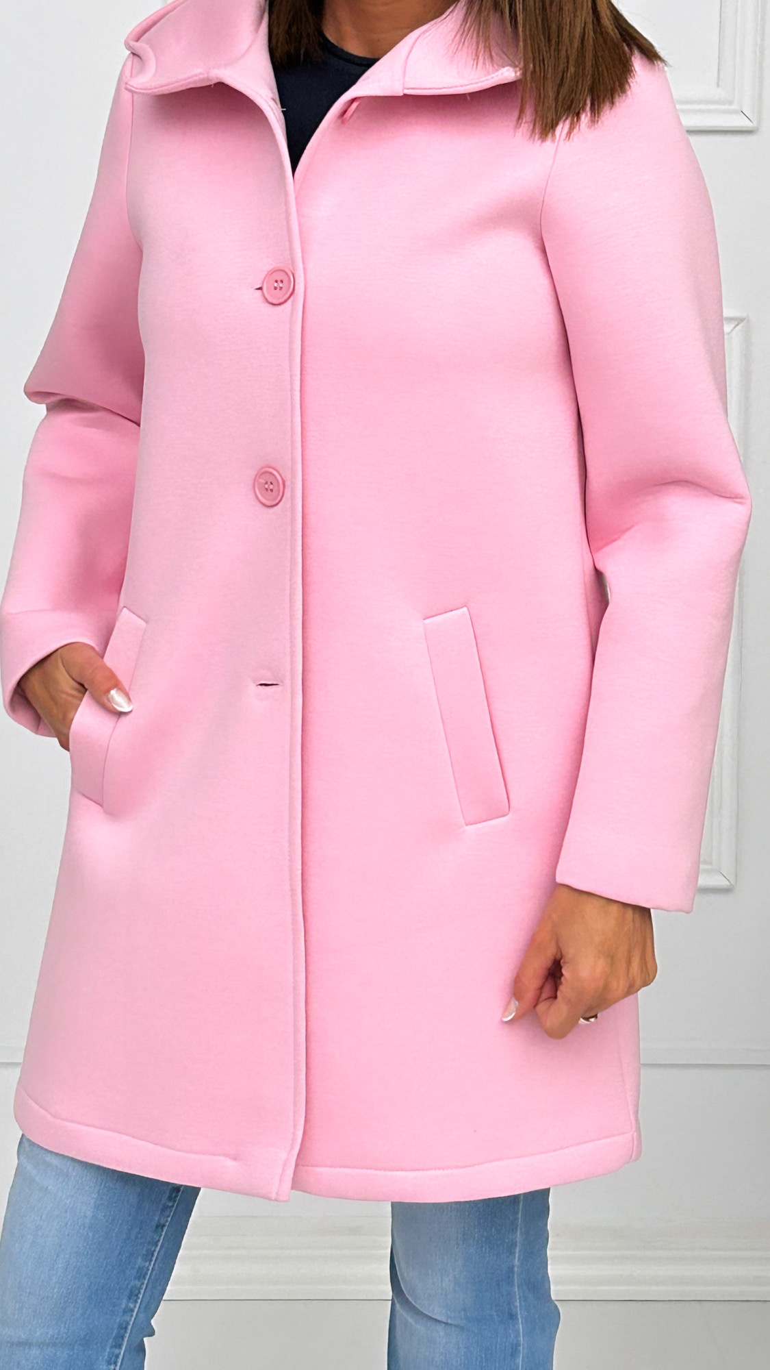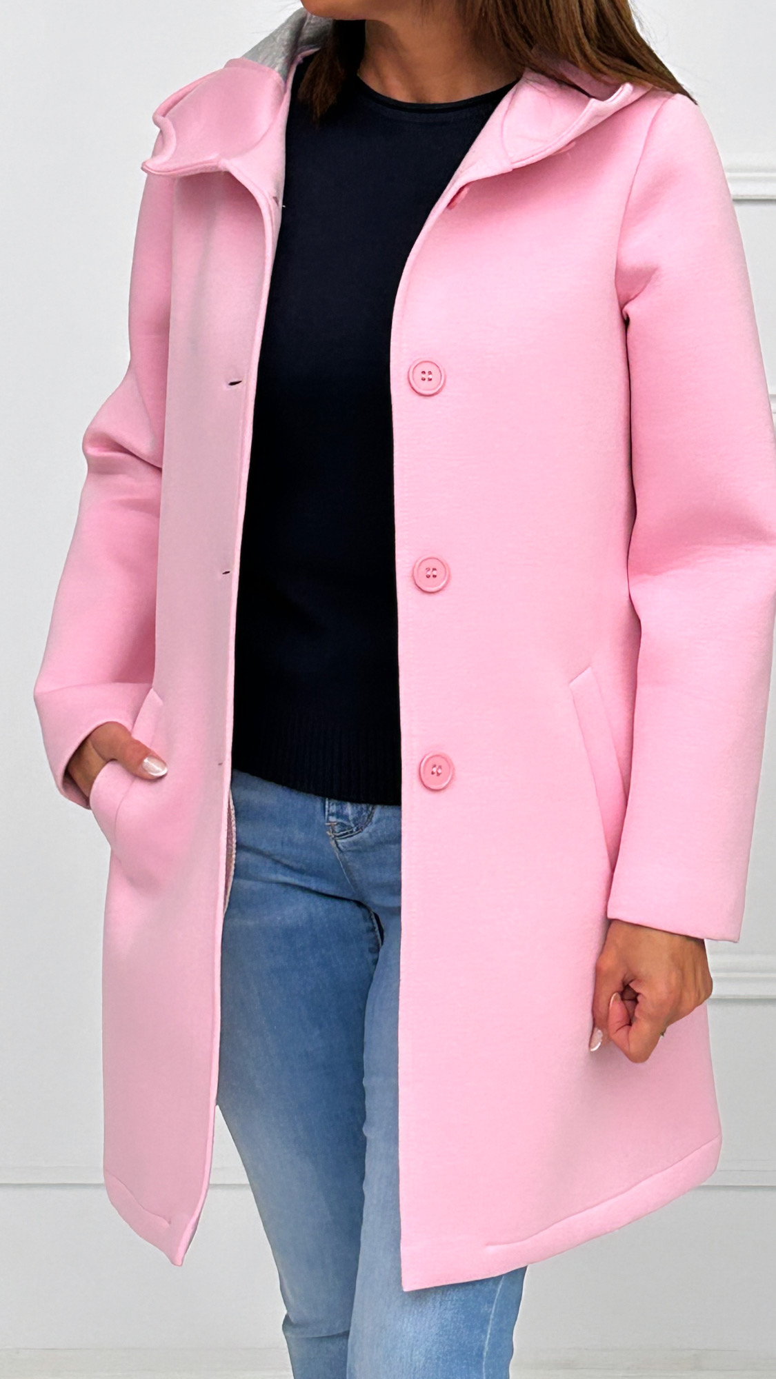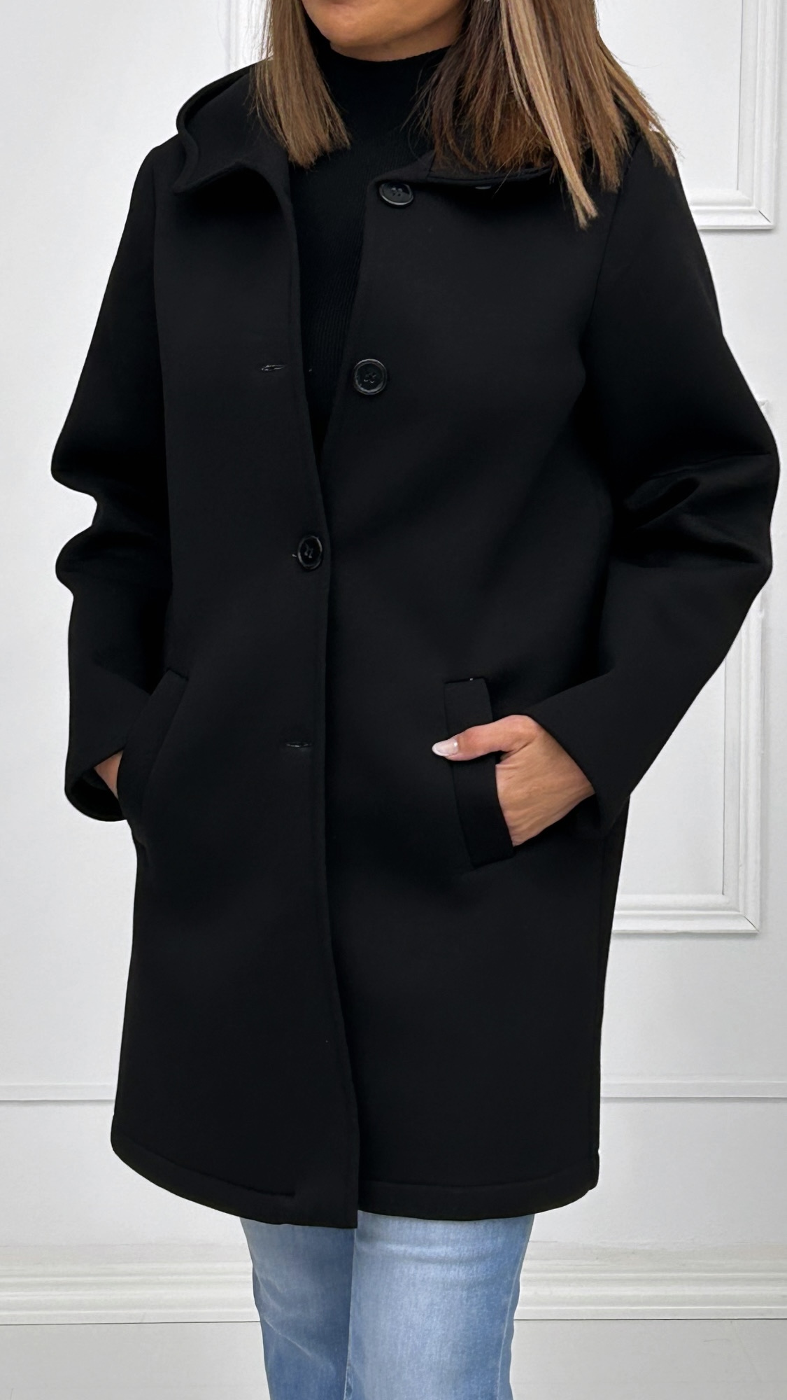 Abrigo fabricado en tela de neopreno con forro. Lleva capucha y bolsillos laterales combinado con botones automáticos para facilitar el cierre los días más fríos.