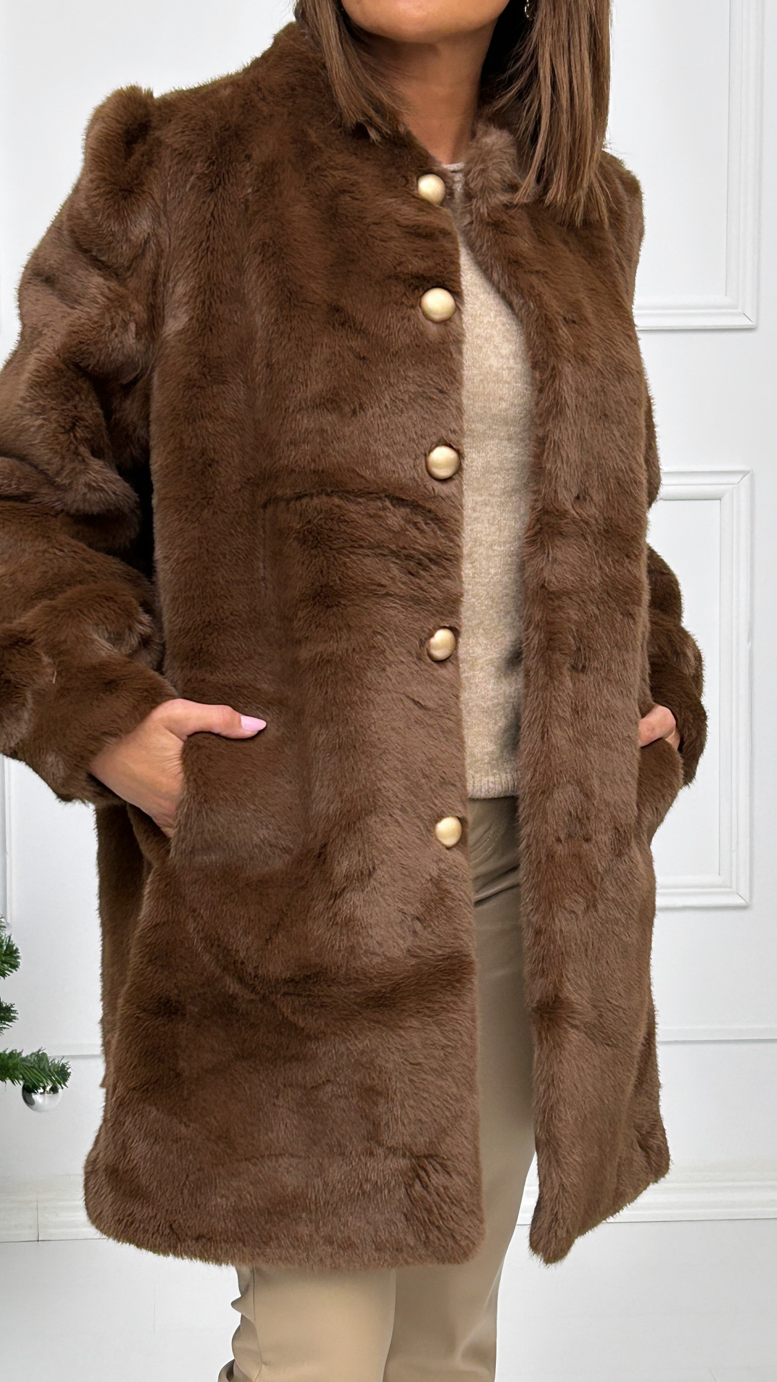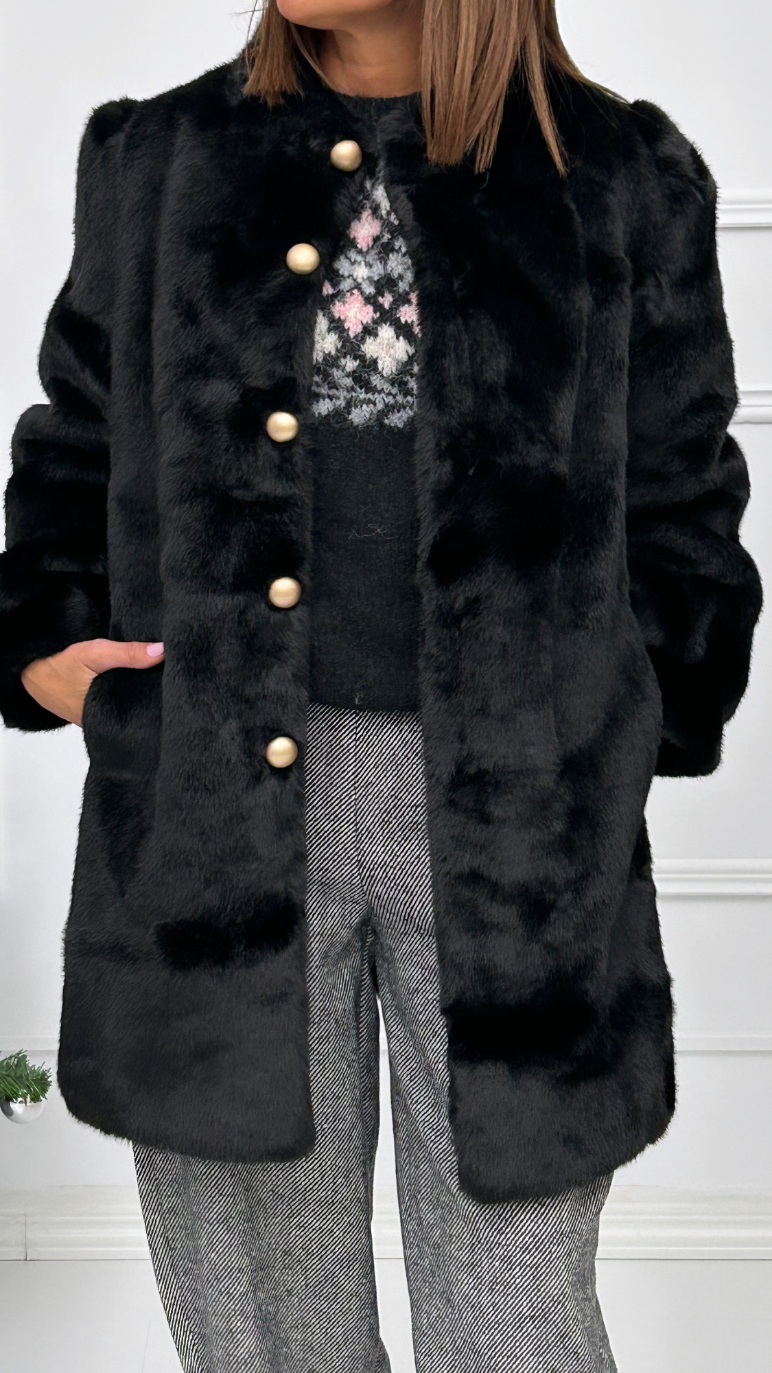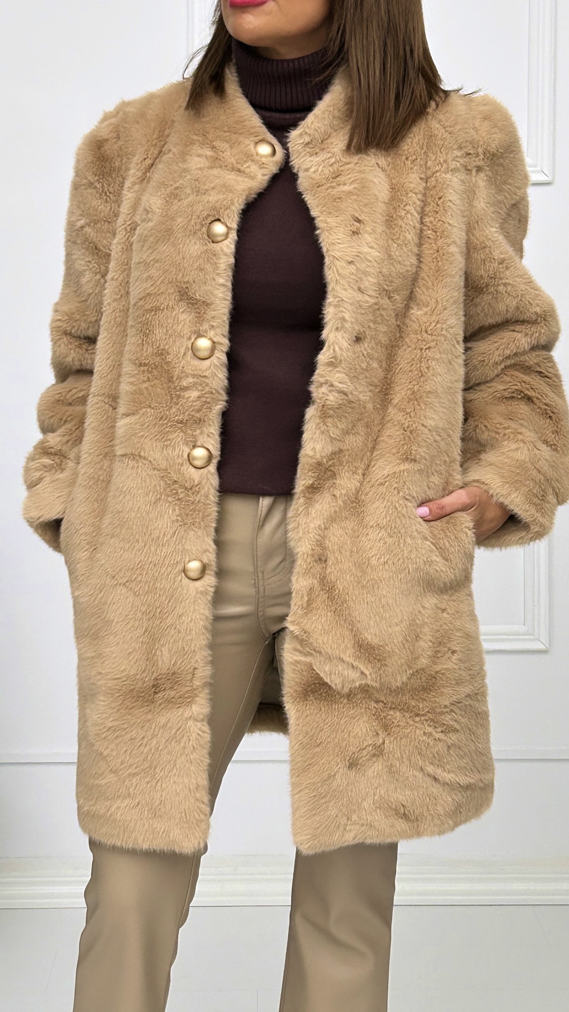 Abrigo de pelo disponible en varios colores básicos que te darán mucho juego a la hora de combinar con cualquier outfit que elijas. Tiene bolsillos laterales invisibles y cuello mao. Lleva cierre de botones en dorado y corte ligeramente acampanado.