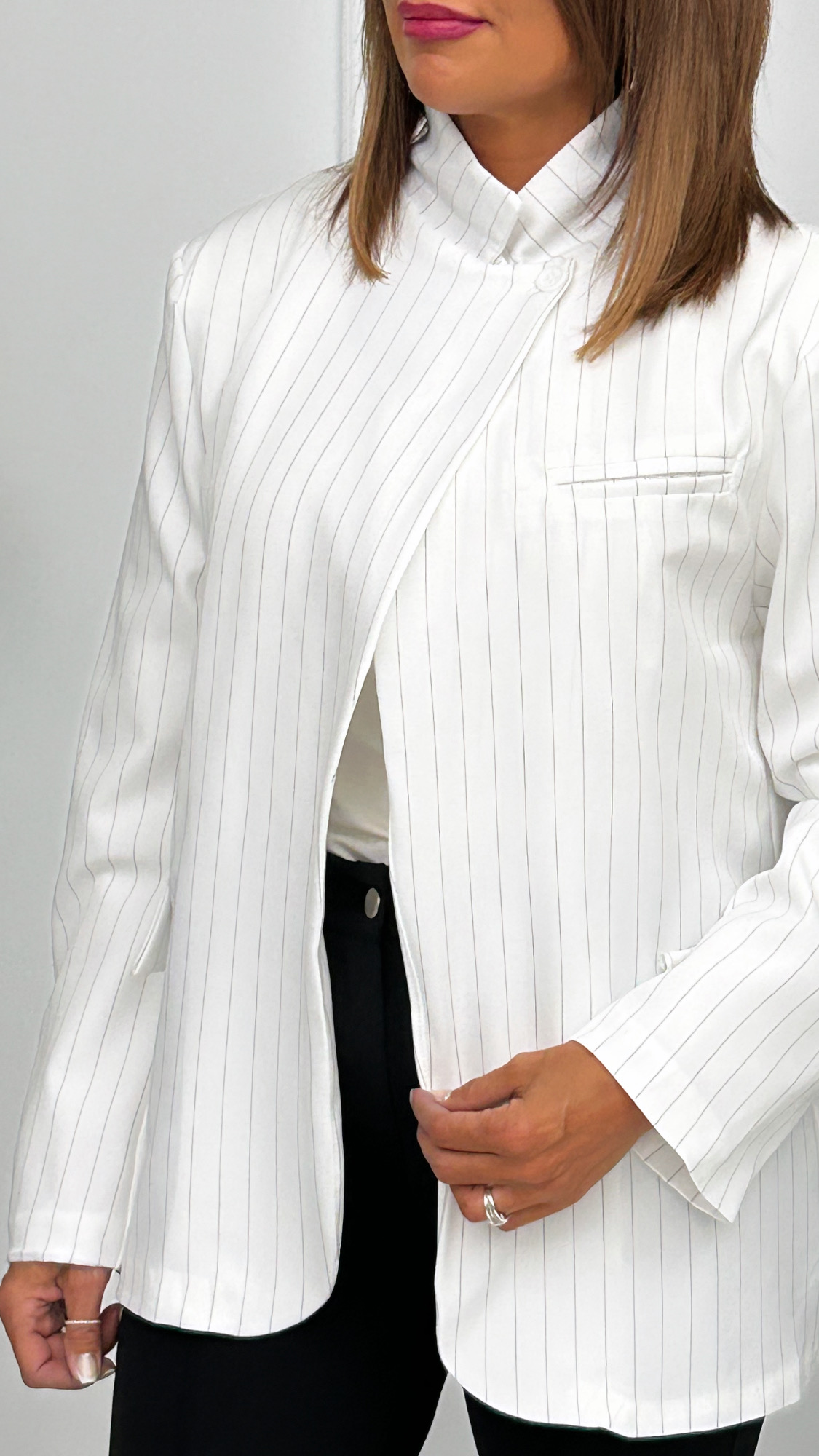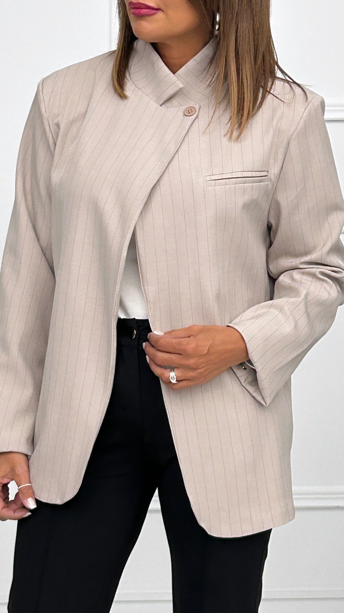 Con forro interior, corte recto y hombreras que estructuran tu figura. Manga larga y falsos bolsillos laterales con tapa. Cuello mao alto con botón para cerrar. Estampado de raya fina. Modelo muy elegante que le aportará estilo propio a cualquier look.