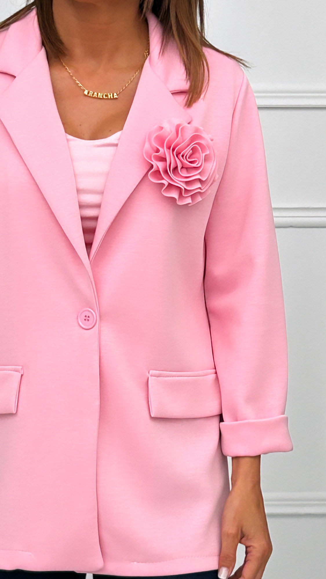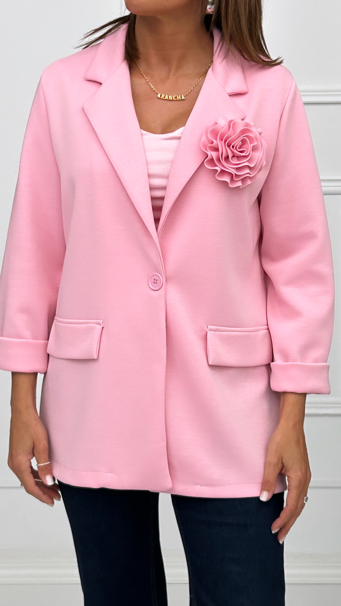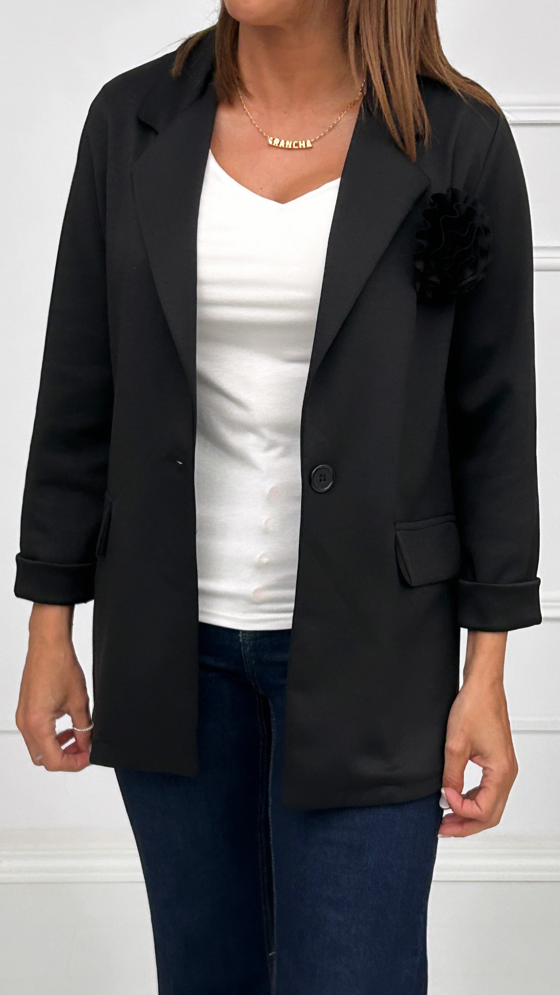 Americana en tejido de capa de aire disponible en varios colores. Un modelo básico, de corte recto. Tiene falsos bolsillos laterales con tapa y cierre de botón en el mismo color de la prenda. Su detalle especial es un broche de flor de la misma tela que puedes poner y quitar según prefieras.
