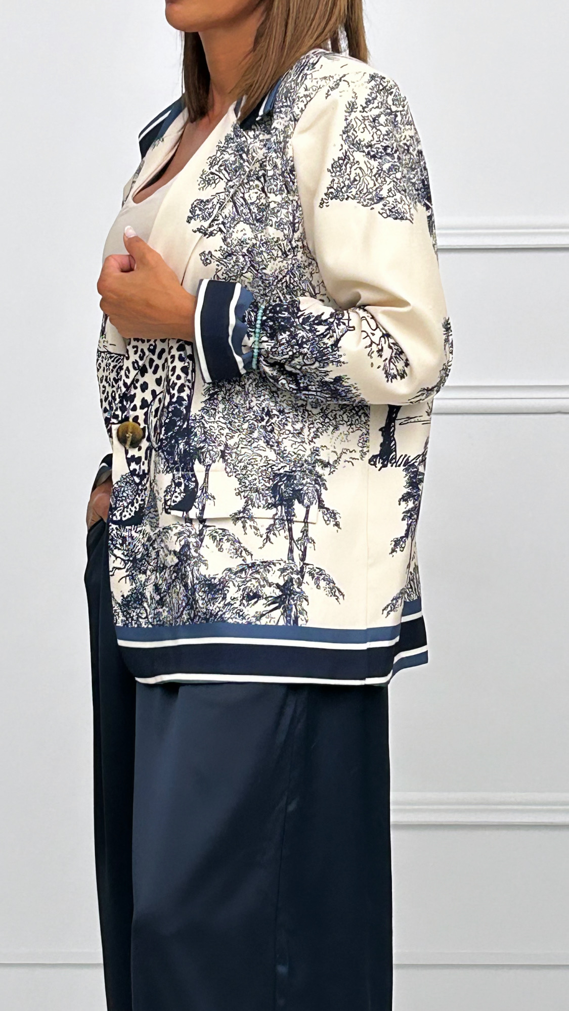 Americana estampada con forro interior y hombreras. Cierre de botón. Tiene falsos bolsillos con tapa en la parte delantera. Disponible con el estampado en varios colores con el beige como color de fondo. El motivo principal es un leopardo tanto en la parte delantera como en la espalda. Doble raya en puños, bajo y cuellos en diferente tonalidad del color del estampado.