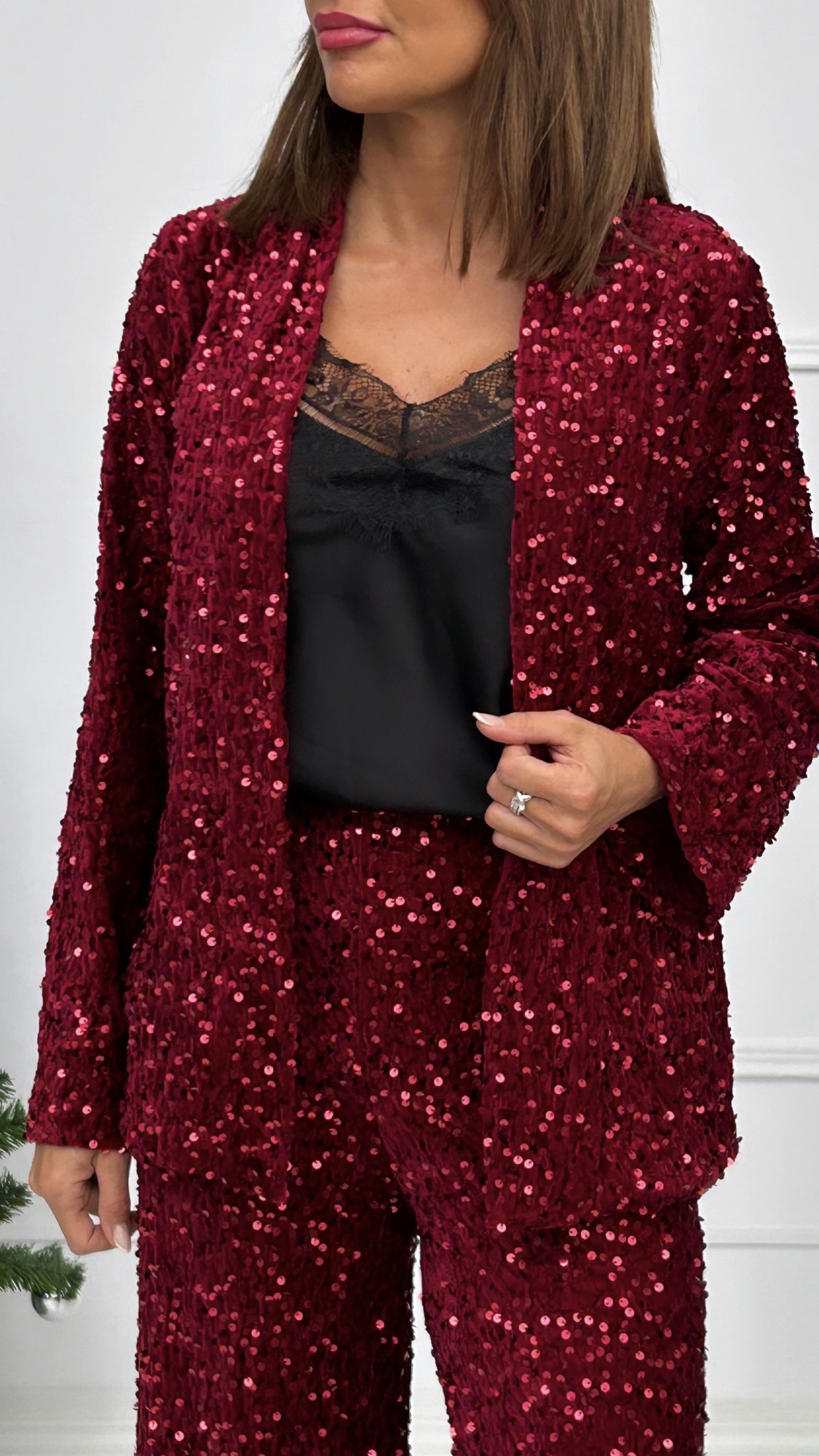 Blazer de manga larga diseñada en terciopelo todo ella cubierta de lentejuelas del mismo color. Perfecta para éstas fiestas para lucir súper elegante con una simple combinación.