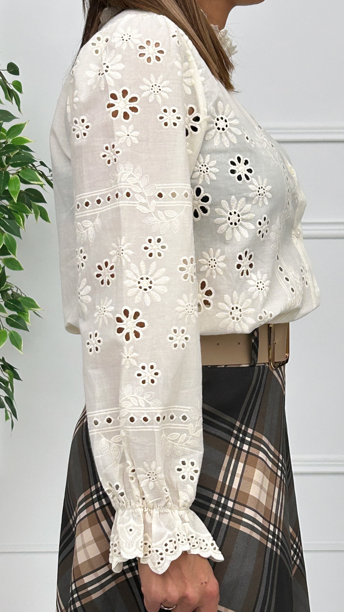 Camisa en tono beige con bordado ingles en cuerpo y mangas. Cuello mao y goma en el puño con un acabado precioso en el final de la manga.