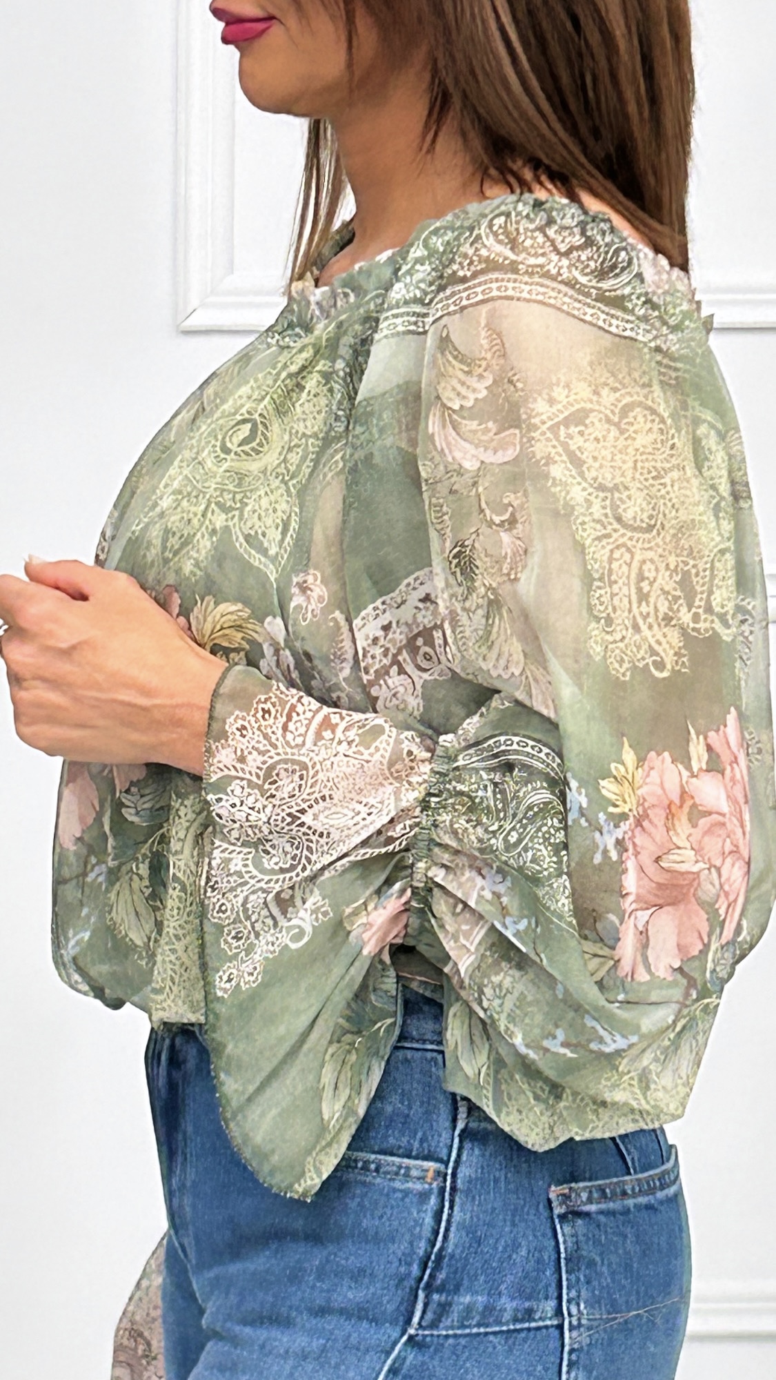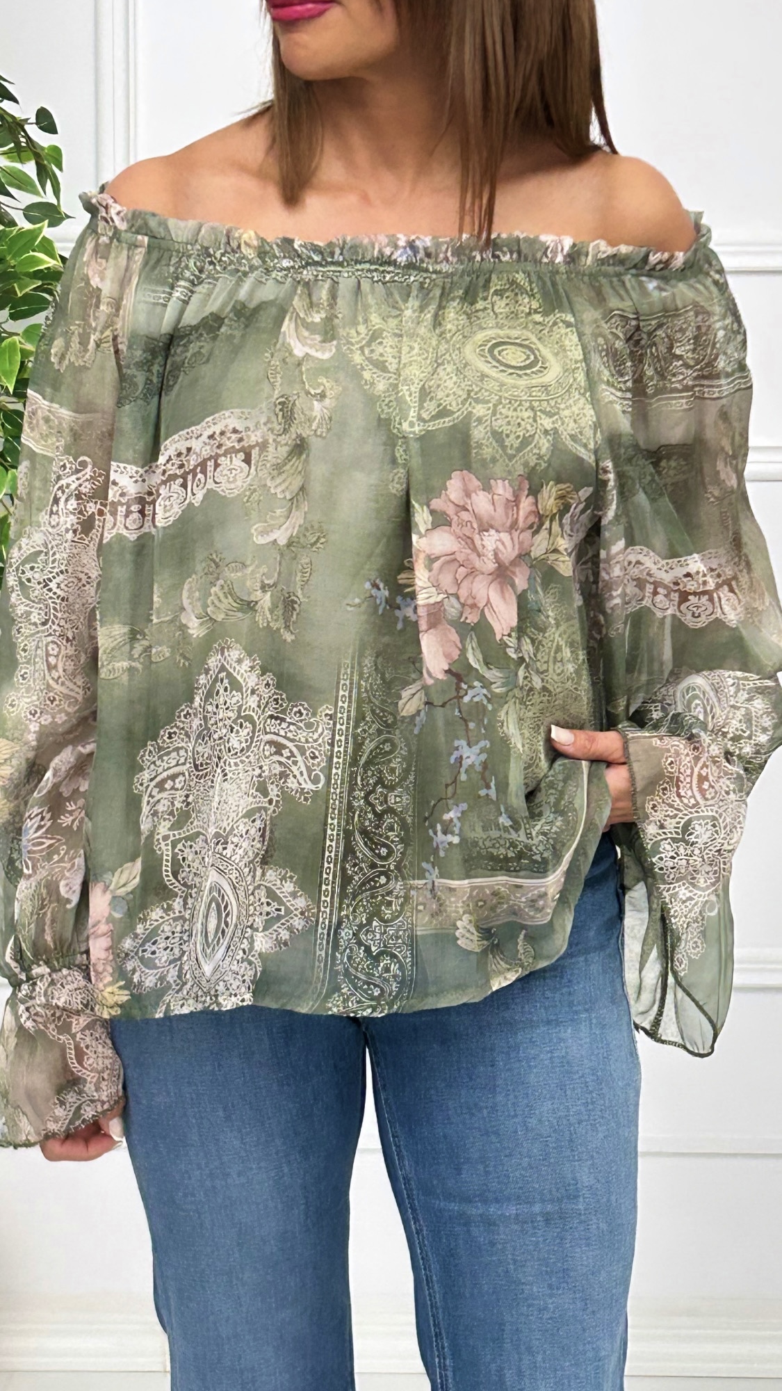 Blusa con escote barco engomado que puedes poner enseñando los hombros o si te gusta más de forma convencional. Tiene forro interior en la parte del cuerpo y manga transparente con goma en el puño y pequeño volante. Corte suelto, con vuelo y estampado alegre y colorido. Disponible en dos colores con el mismo estampado.