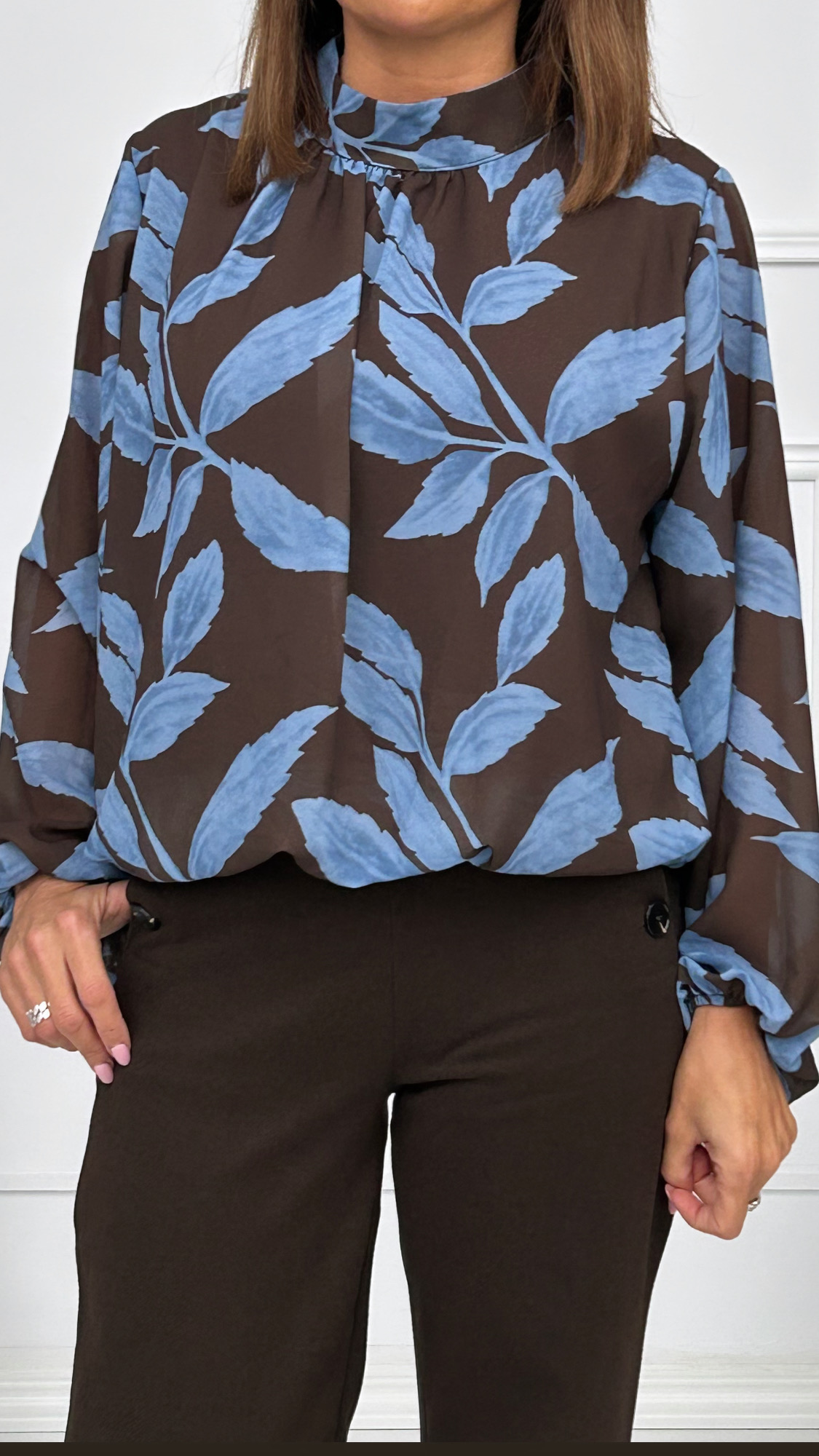 Blusa de cuello redondo pegadito con botones en la parte trasera. Manga transparente y cuerpo con doble tela que no deja transparentar. Tiene goma en los puños aportándole el efecto abullonado a la maga. También en el bajo para que se sujete a la altura que tu quieras. Estampado de hojas en un tono que contrasta y un color de base con un brillo muy sutil. Blusa elegante tanto para unos vaqueros como para un pantalón más serio.