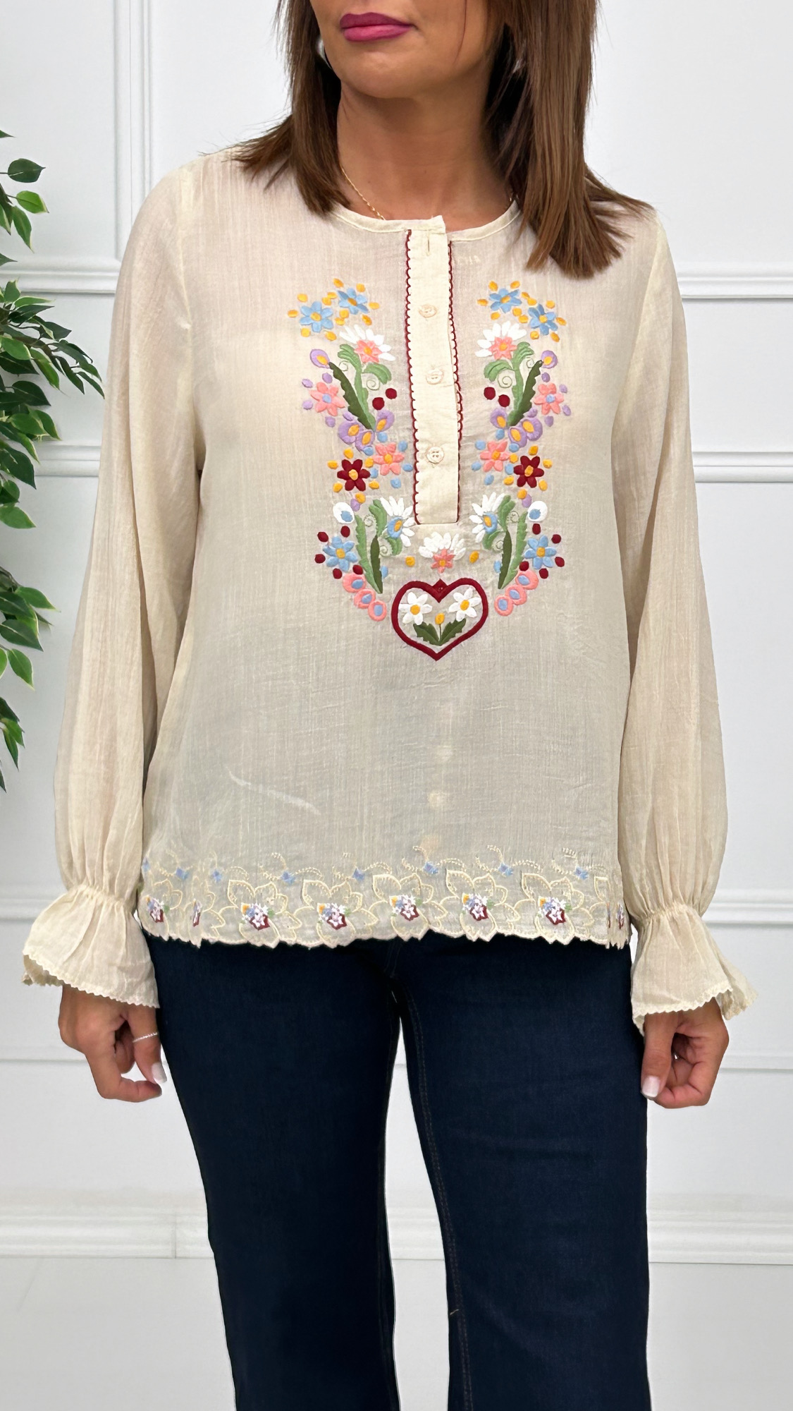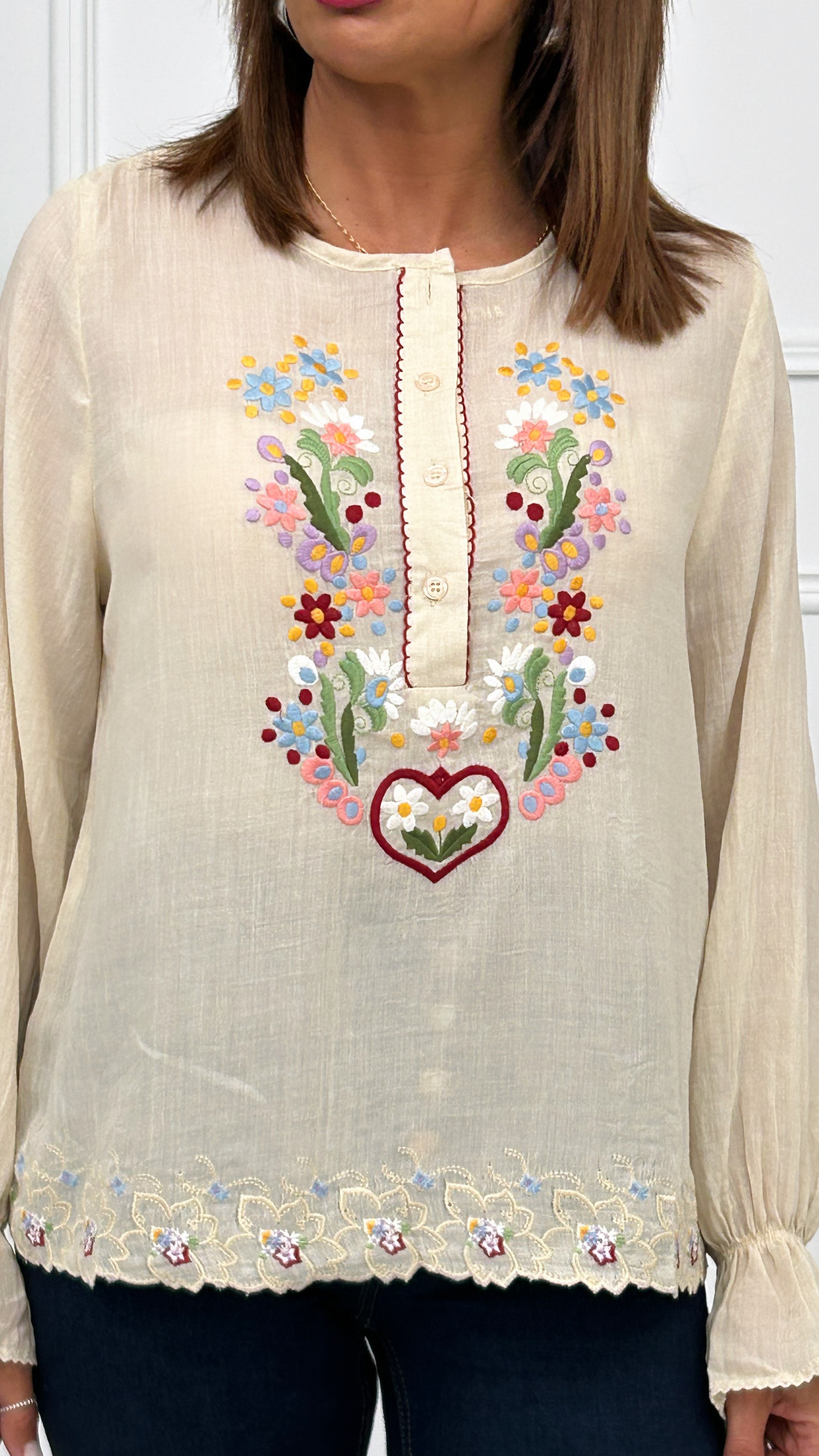 Blusa semi transparente en tono beige, súper combinable. Con goma en el puño y un pequeño volante. Tiene cuello redondo y cierre de cuatro botones en el mismo tono de la blusa. Bordados coloridos y alegres de flores en la parte del pecho y en el bajo.