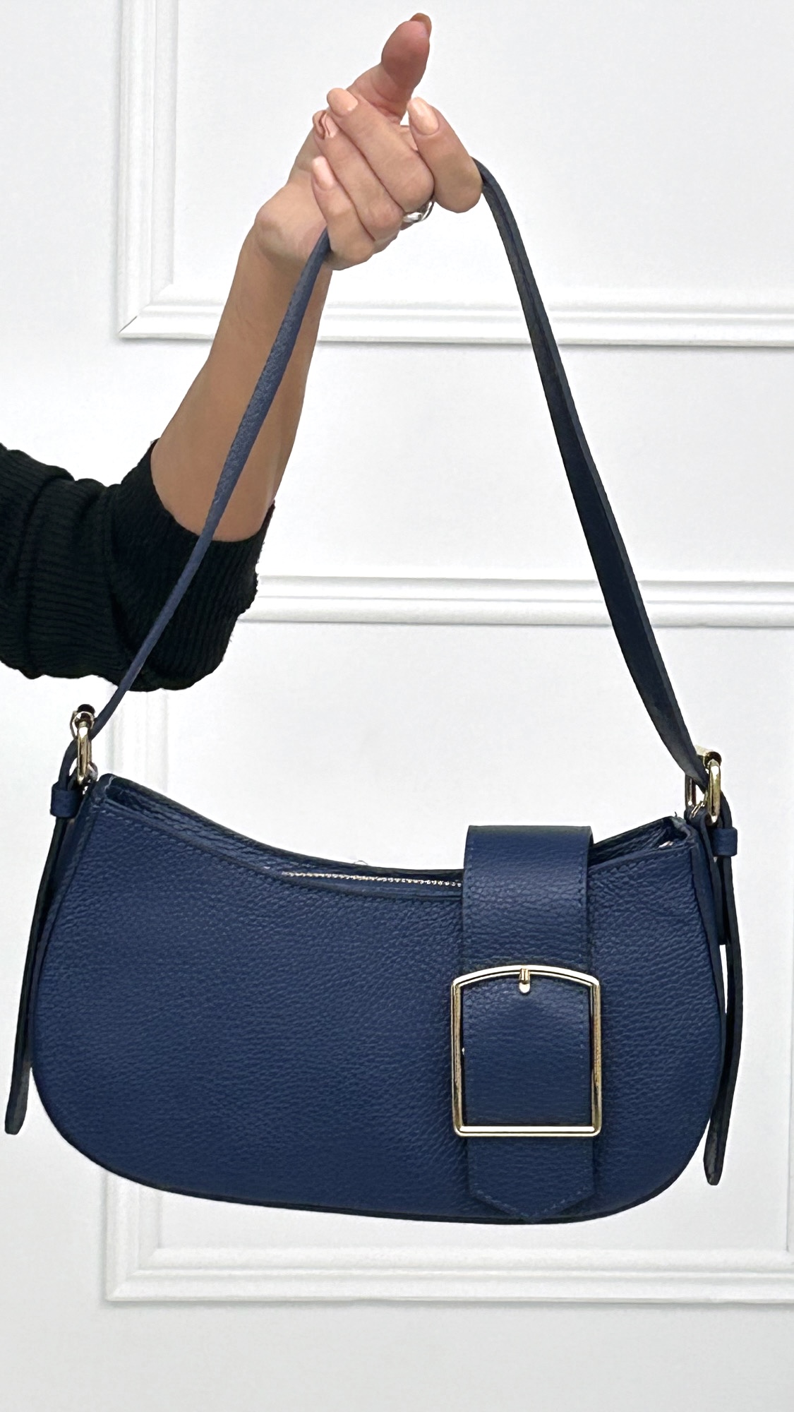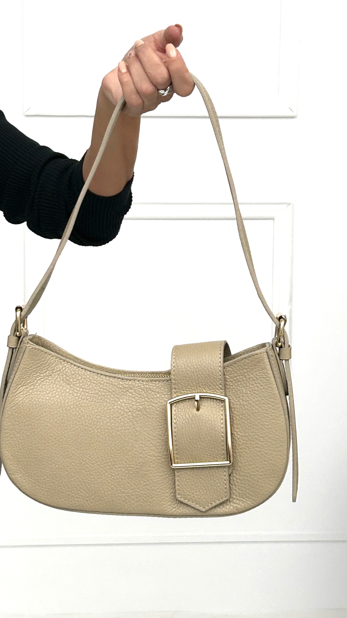 Bolso de piel con los laterales redondeados y asa de mano con agujeros para alargar y acortar a la medida que más te guste. Tiene forro interior y compartimento con cremallera. Cierre exterior de cremallera y maxi hebilla con botón de imán en un lateral. Detalles en dorado. También dispone de correa larga. Disponible en varios colores para elegir en función de tu look.