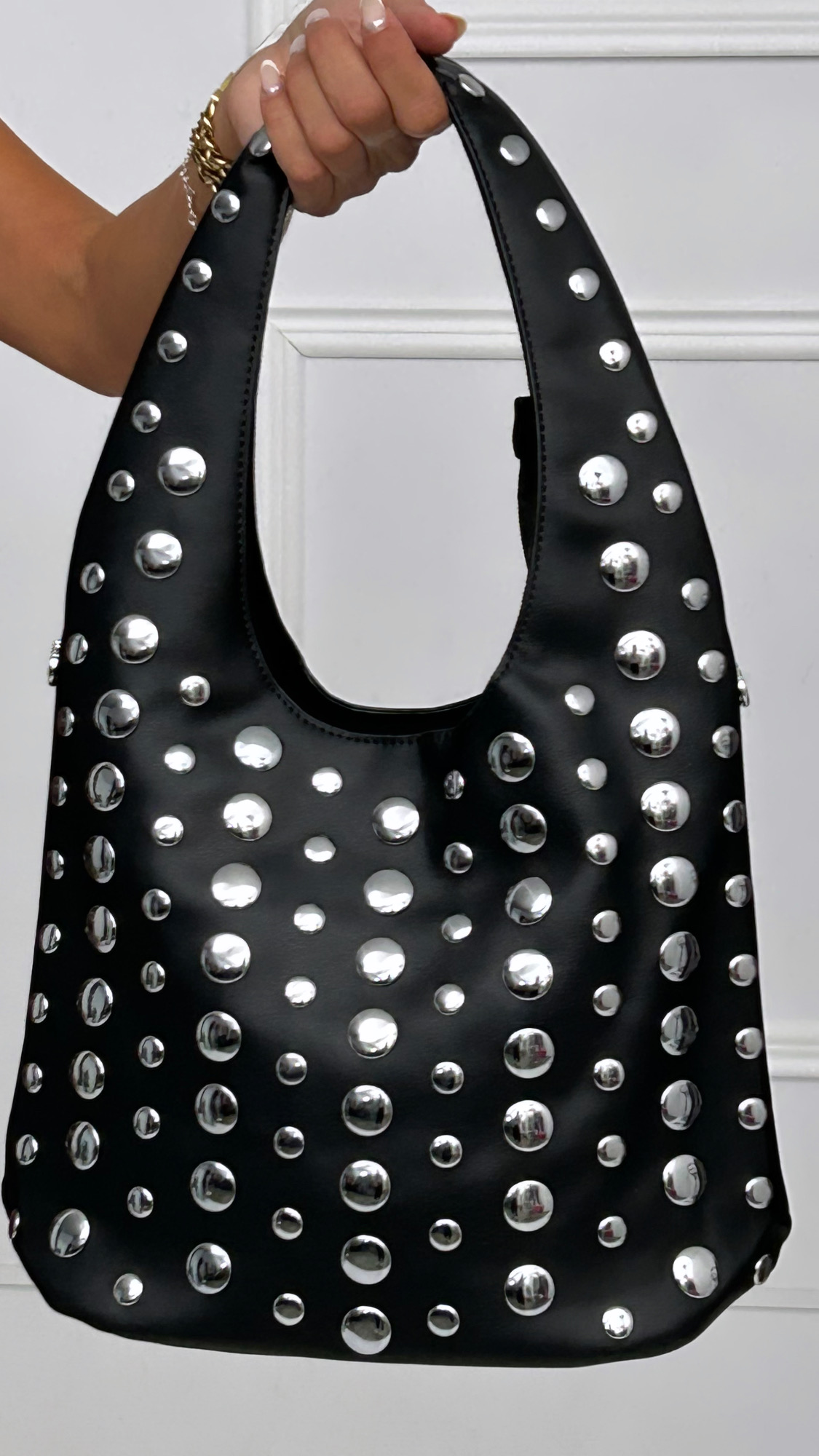 Bolso efecto piel con tachuelas en plata planas de tamaños desiguales. Tiene asa de mano y correa para colgar a modo de bandolera si te parece más cómodo. Esta forrado y tienes dos departamentos interiores, uno porta móvil y otro con cremallera. Departamento exterior y cierre superior también de cremallera.