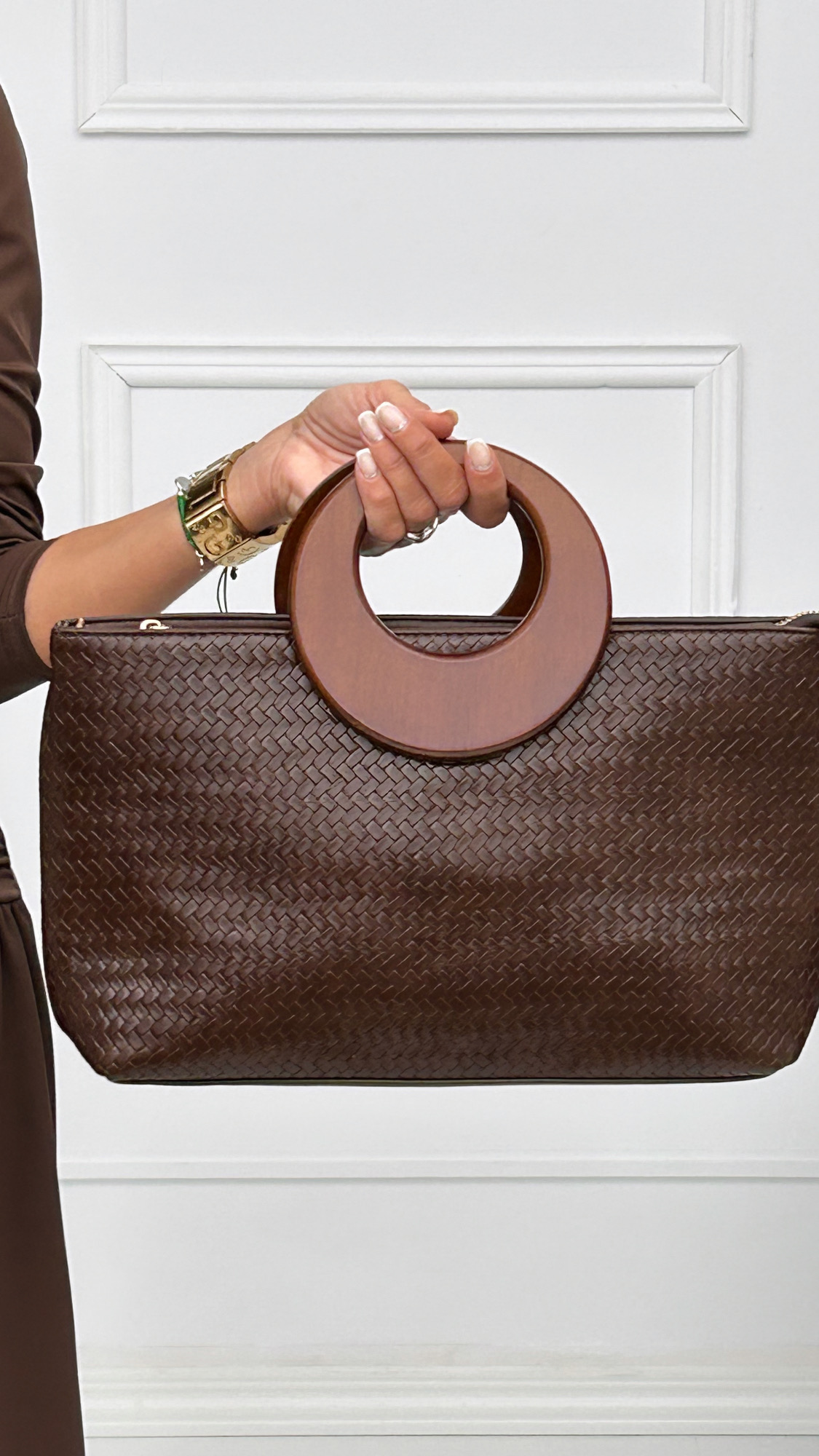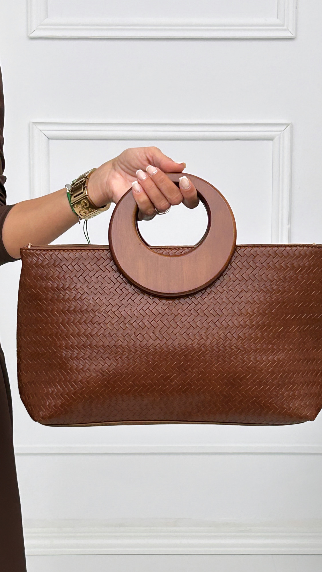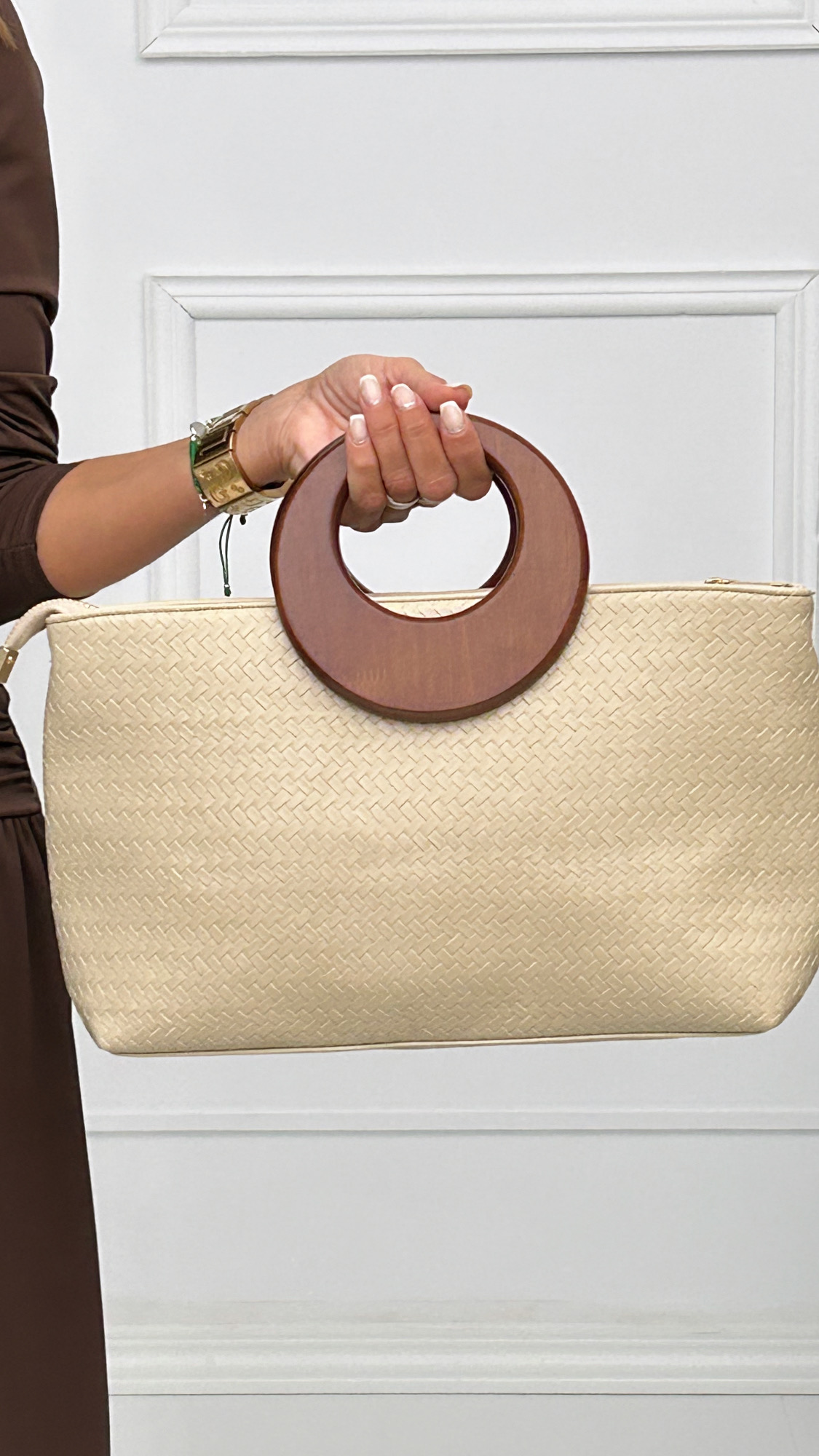 Bolso de mano con forma rectangular trenzado en tejido de piel. Está disponible en diferentes colores aptos para cualquier look. Tiene forro interior y departamento con cremallera. Su asa es el detalle especial que le aporta el toque elegante al modelo. Un asa de madera con forma de luna que lo hace muy cómodo de llevar. Si lo prefieres, incluye correa larga en el mismo color del bolso para llevar colgado en el hombro. Cierre de cremallera exterior en dorado.