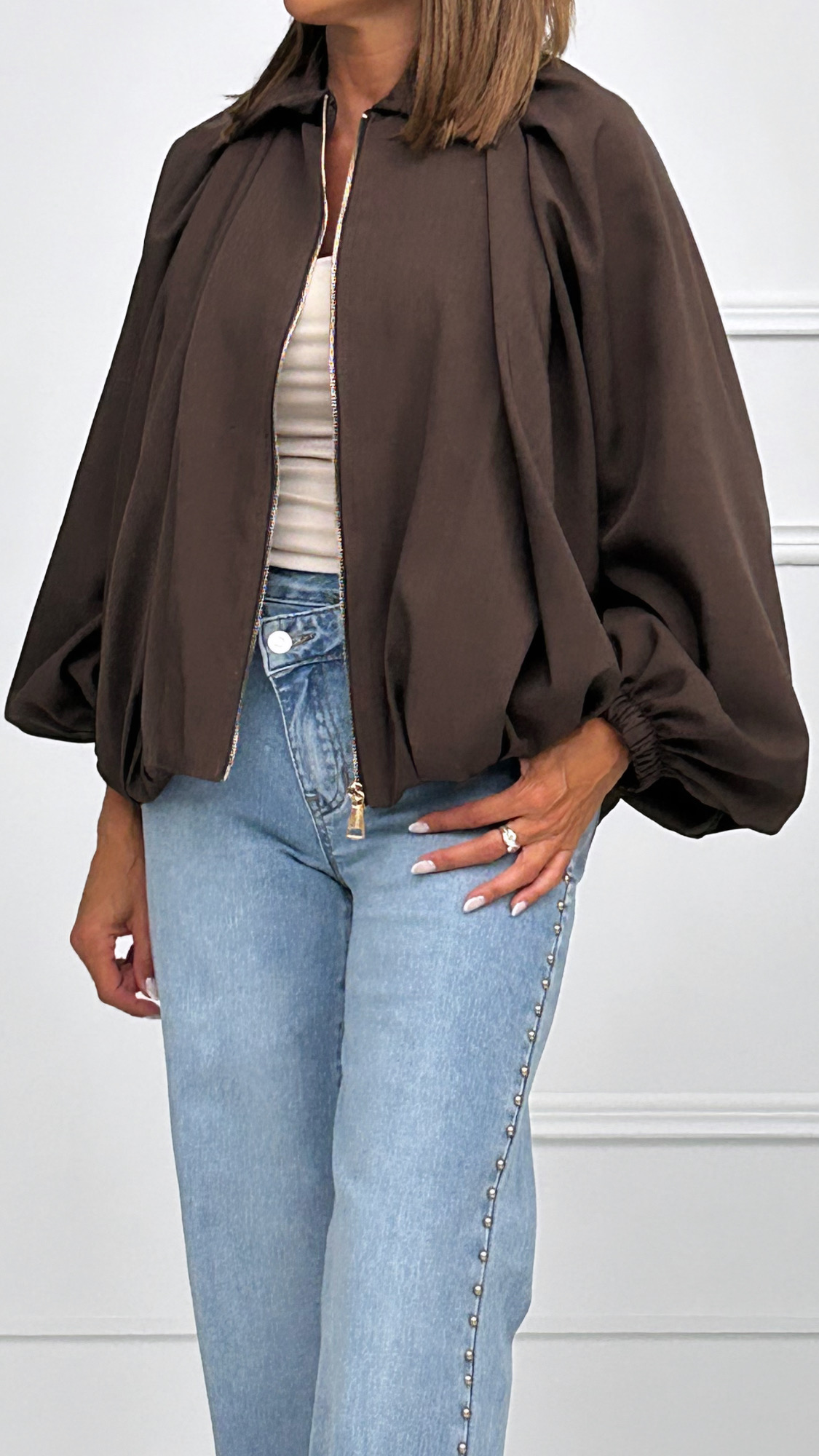 Chaqueta de estilo bomber con corte oversize. De bajo recto y efecto plisado que va desde el hombro hasta el bajo. Mismo efecto plisado en la parte de la espalda desde el cuello. Tiene manga murciélago con goma en el puño y cierre de cremallera en dorado. Disponible en varios colores.