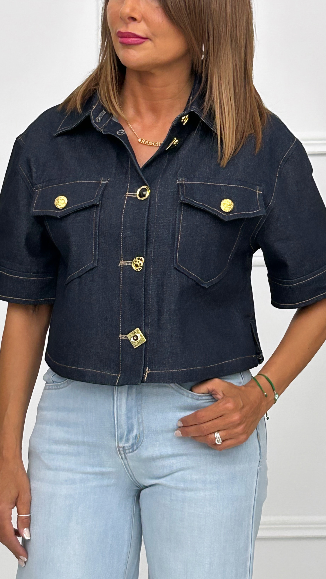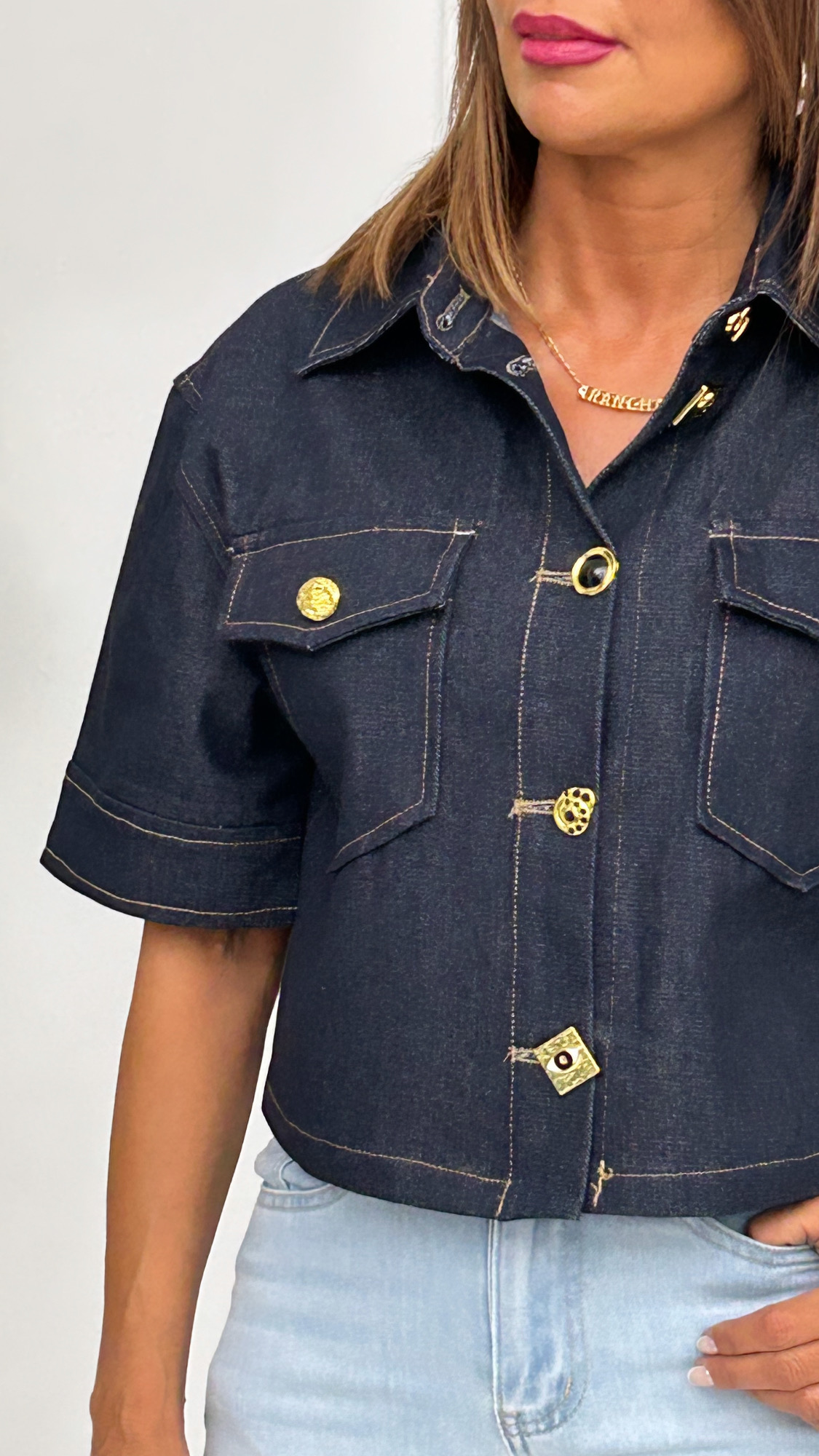 Camisa vaquera de manga corta y corte recto con pinzas en la espalda. Tiene unas pequeñas aberturas en los laterales y bolsillos cuadrados con botón y solapa en la parte delantera. Los botones en dorado con diferentes formas y motivos le dan el toque especial y elegante que la hace destacar. Tejido no elástico.