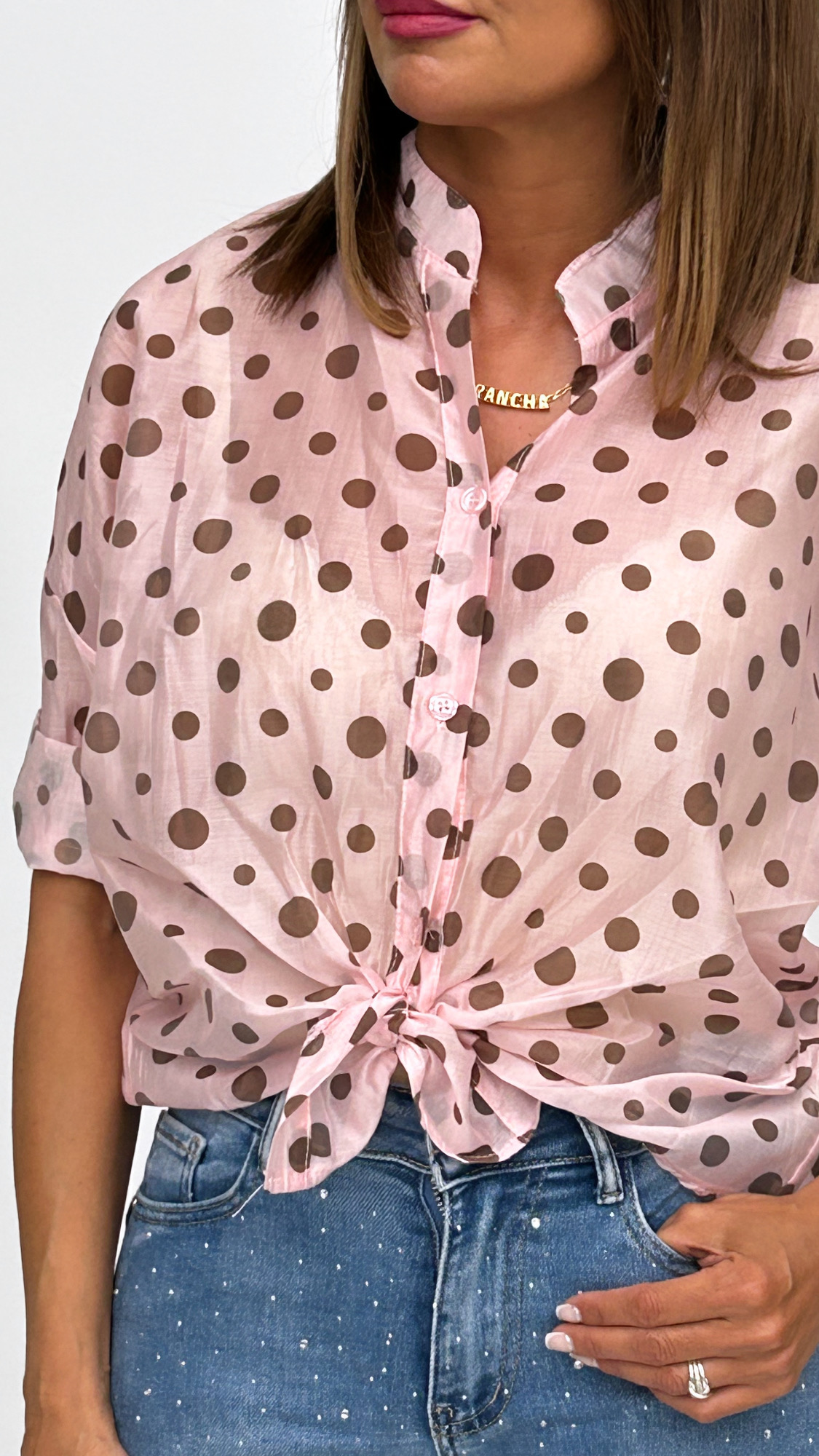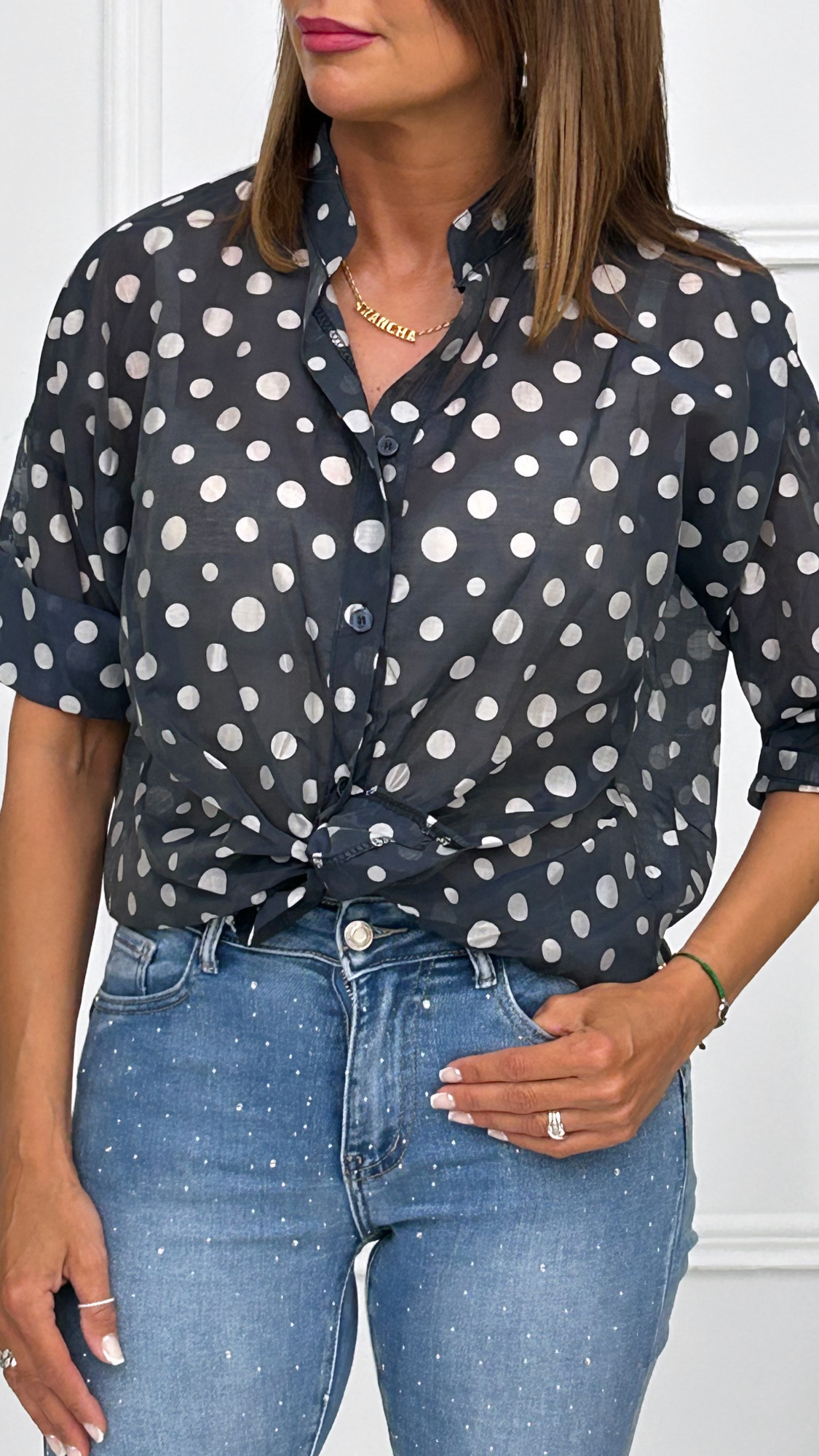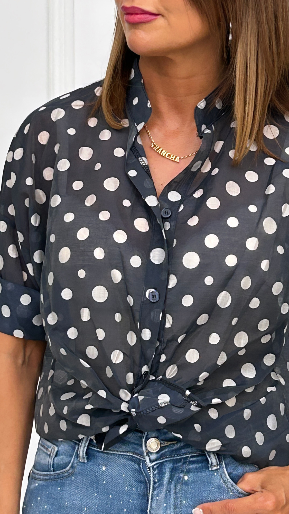 Camisa de manga corta y cuello mao en tejido semi transparente. Estampado de moda con lunares en varios tamaños. Bajo redondeado ligeramente más largo en la espalda. Puedes atar un lazo en la parte frontal, llevarla suelta o si lo prefieres por dentro del pantalón.