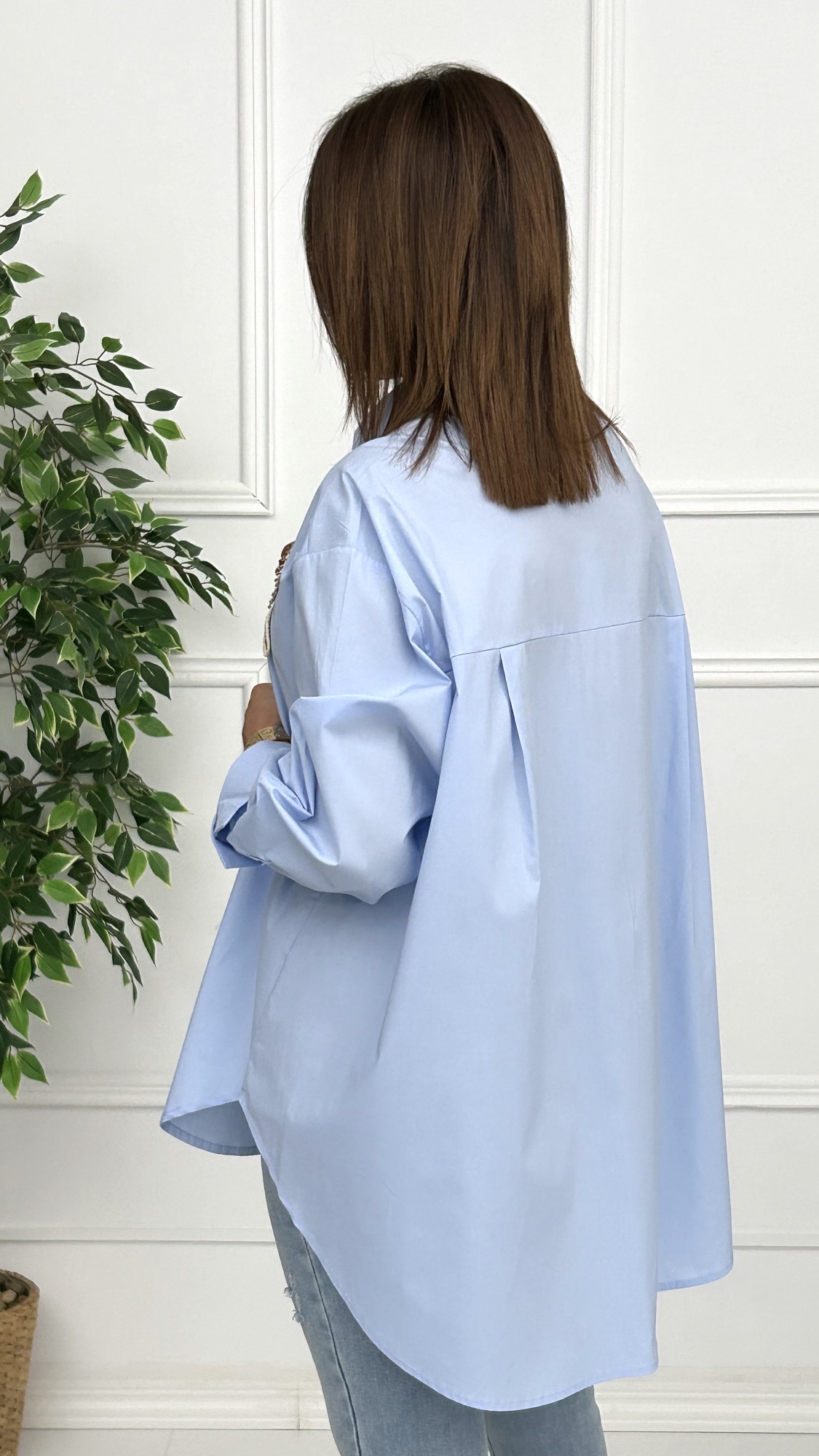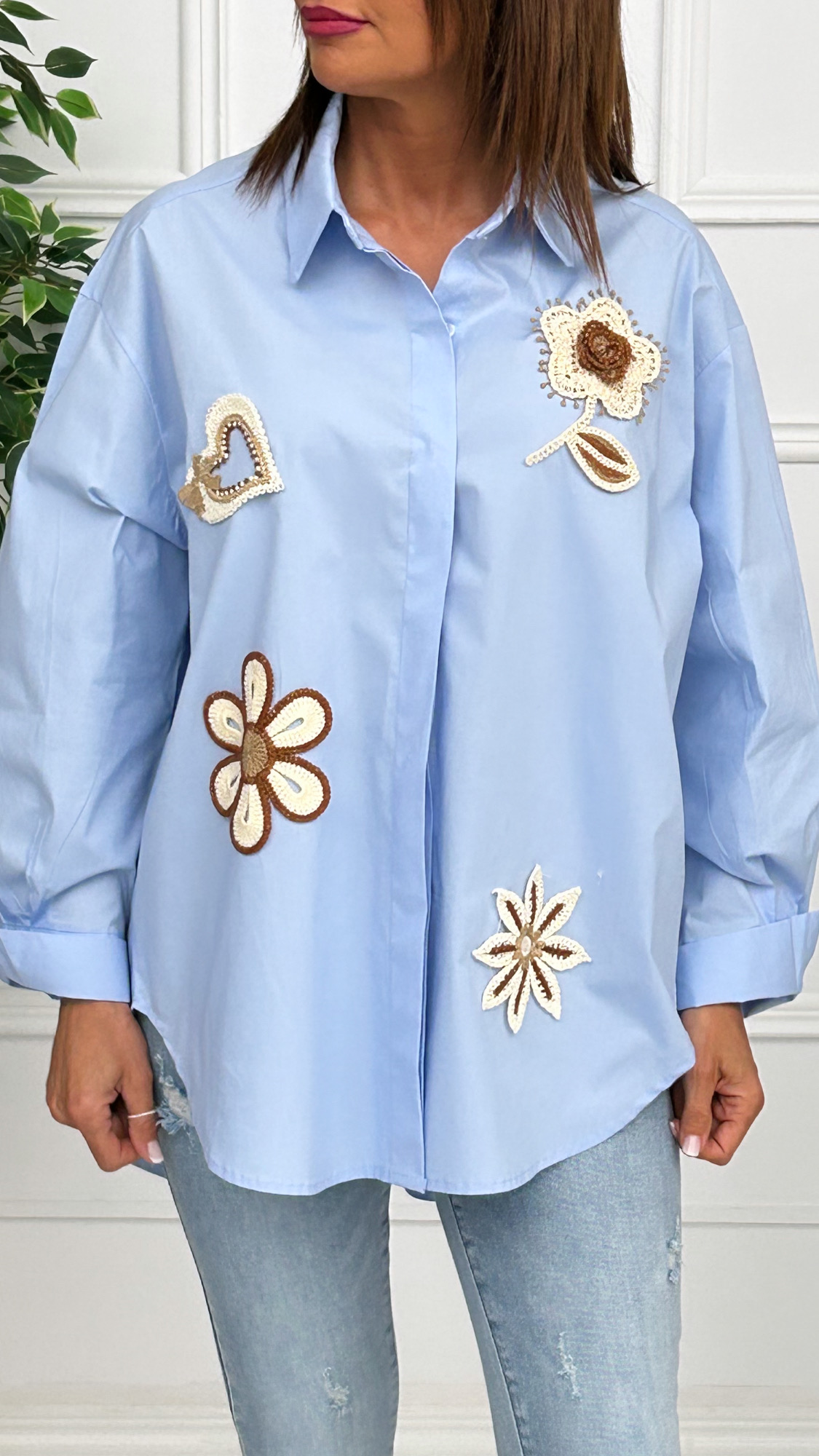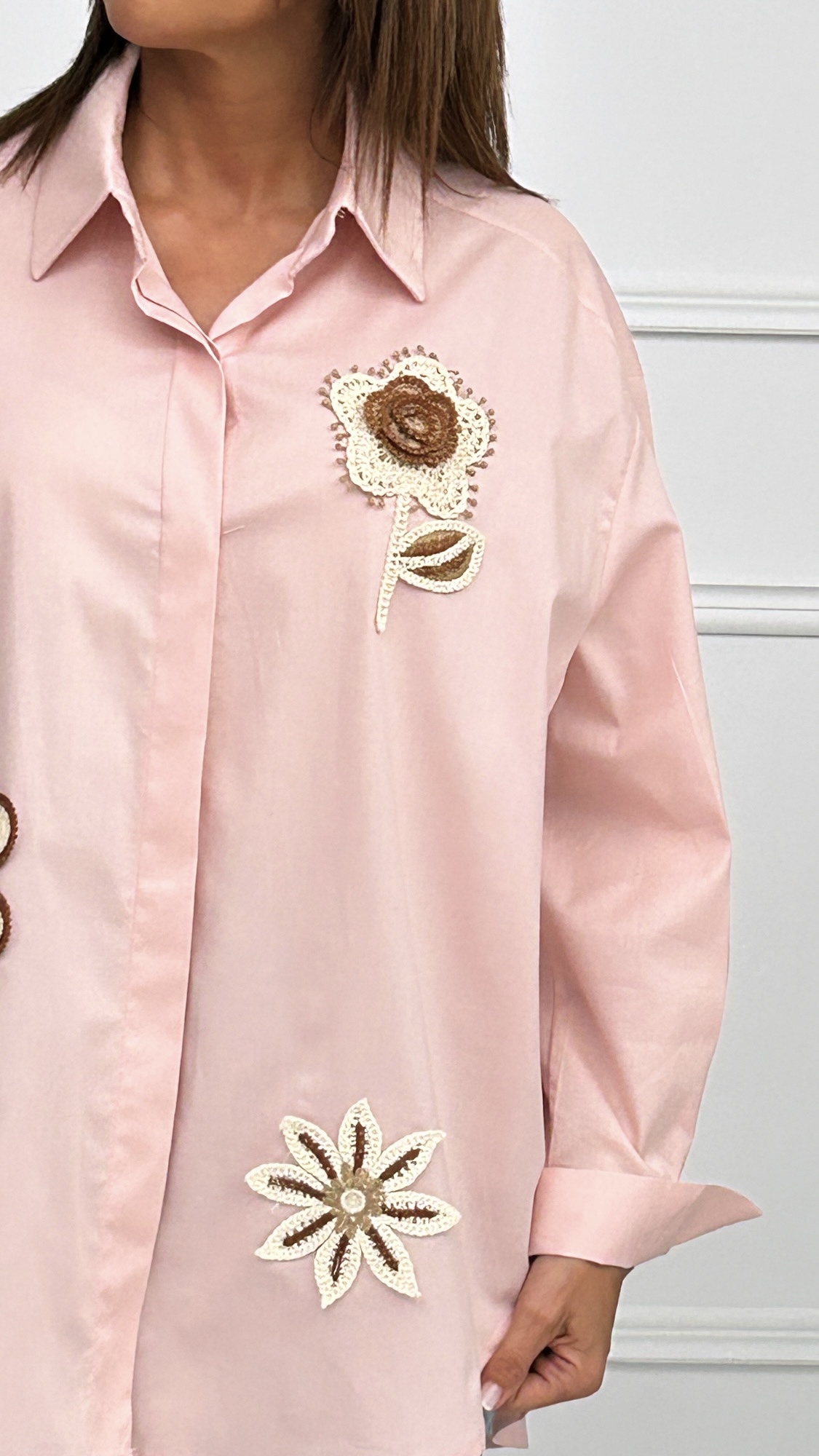 Camisa estilo oversize de corte masculino con pinzas en la espalda y manga larga. Botones ocultos en el mismo color de la prenda. Lleva motivos en crochet añadidos en la parte delantera en tonos beige y camel. Bajo redondeado y más corto en la parte delantera que en la espalda.