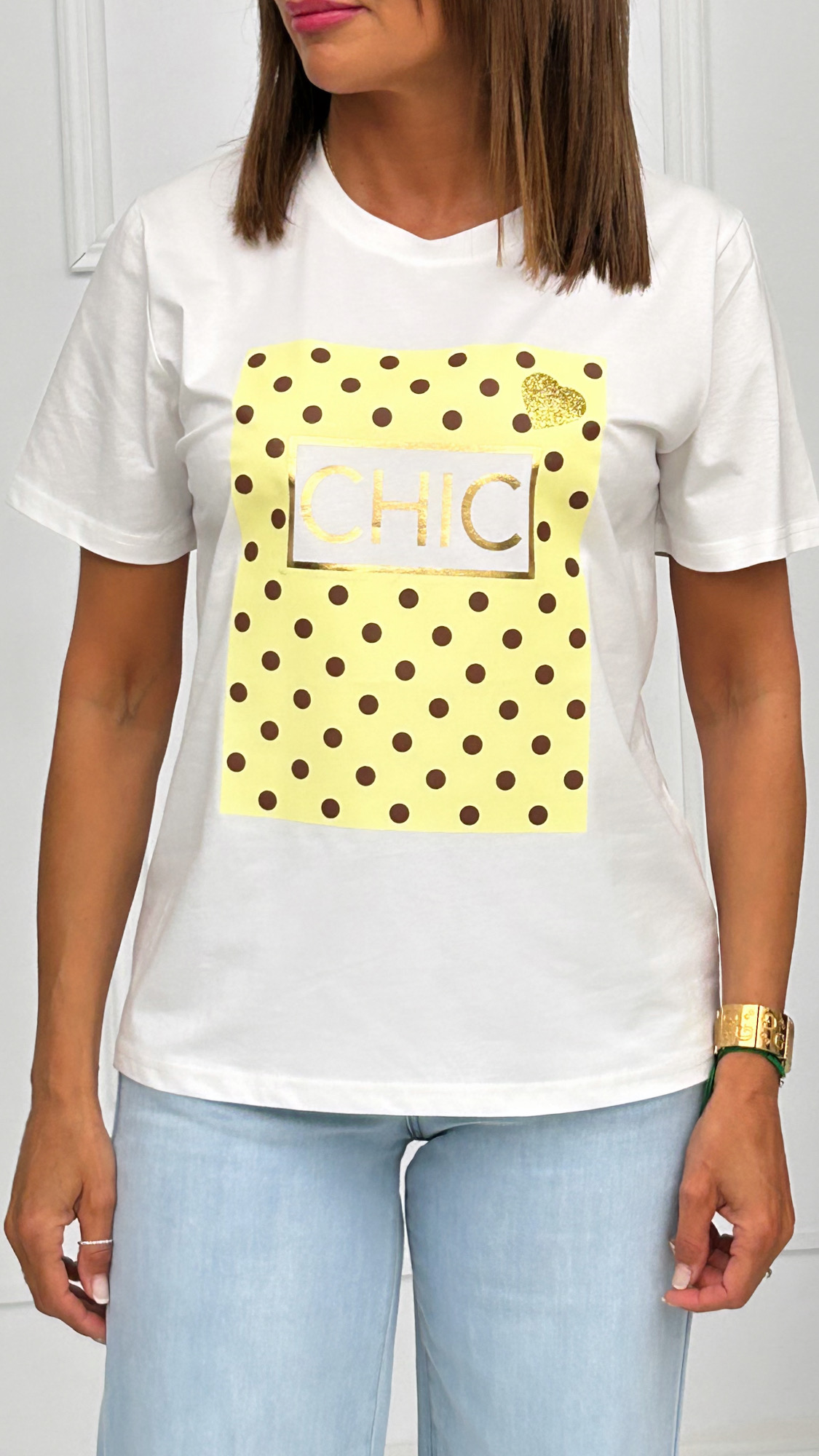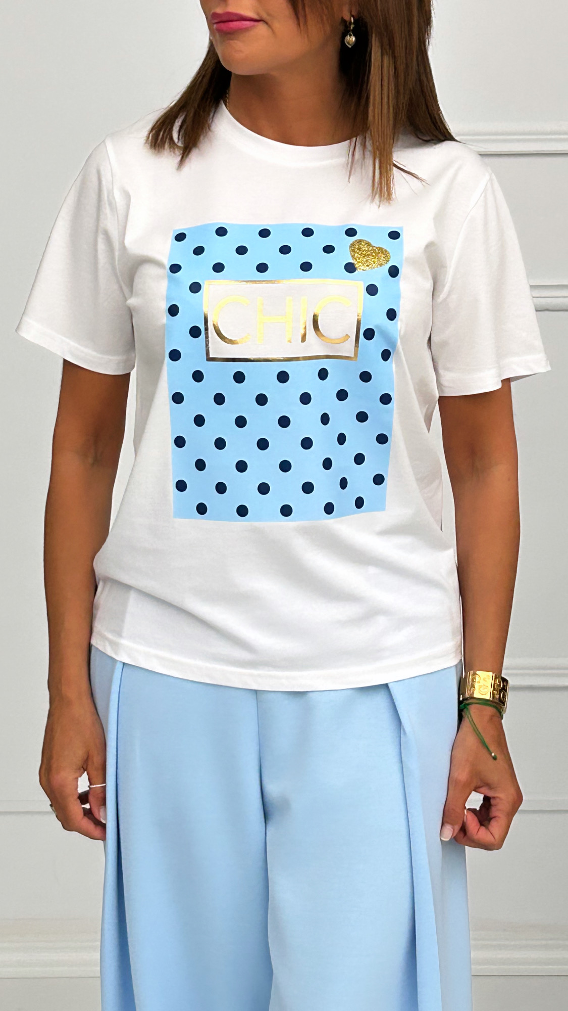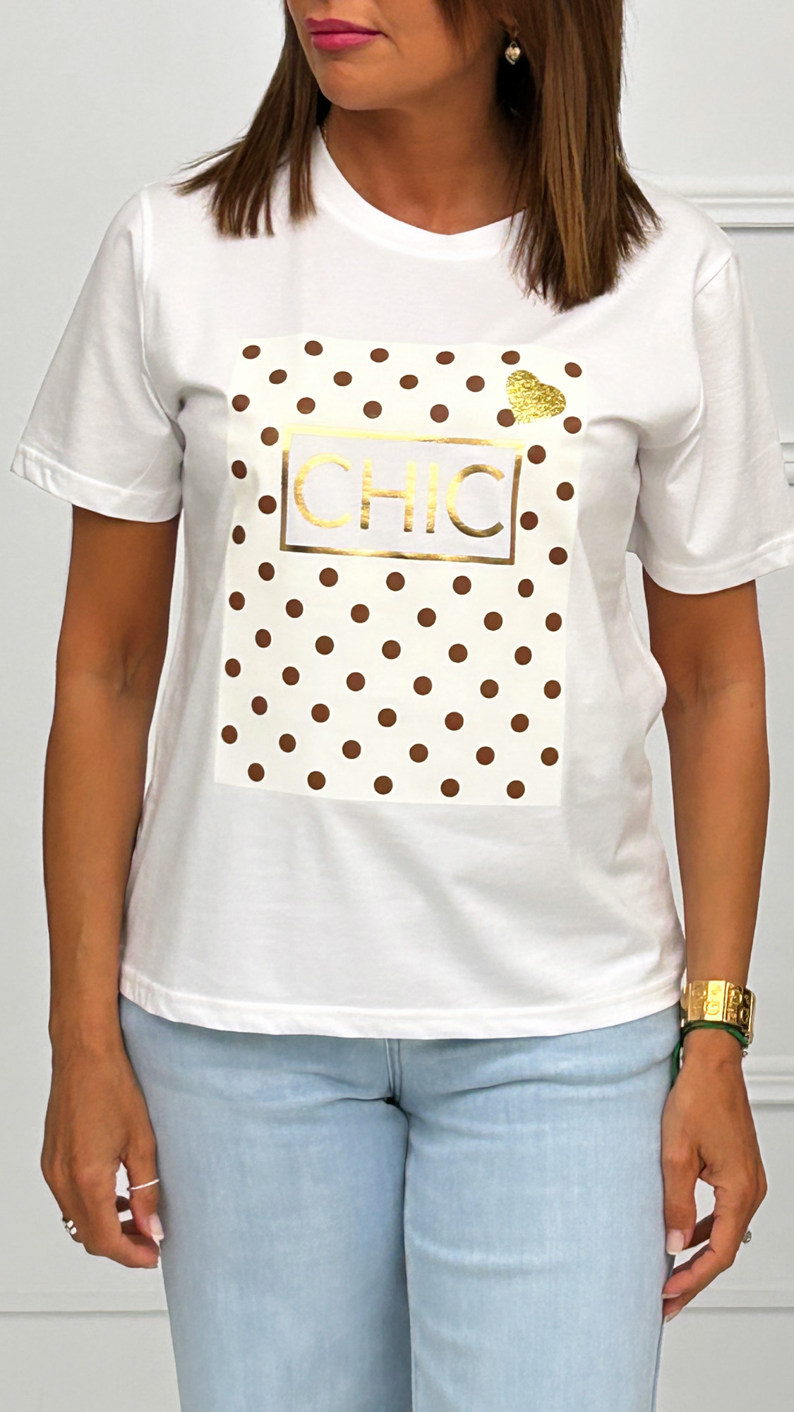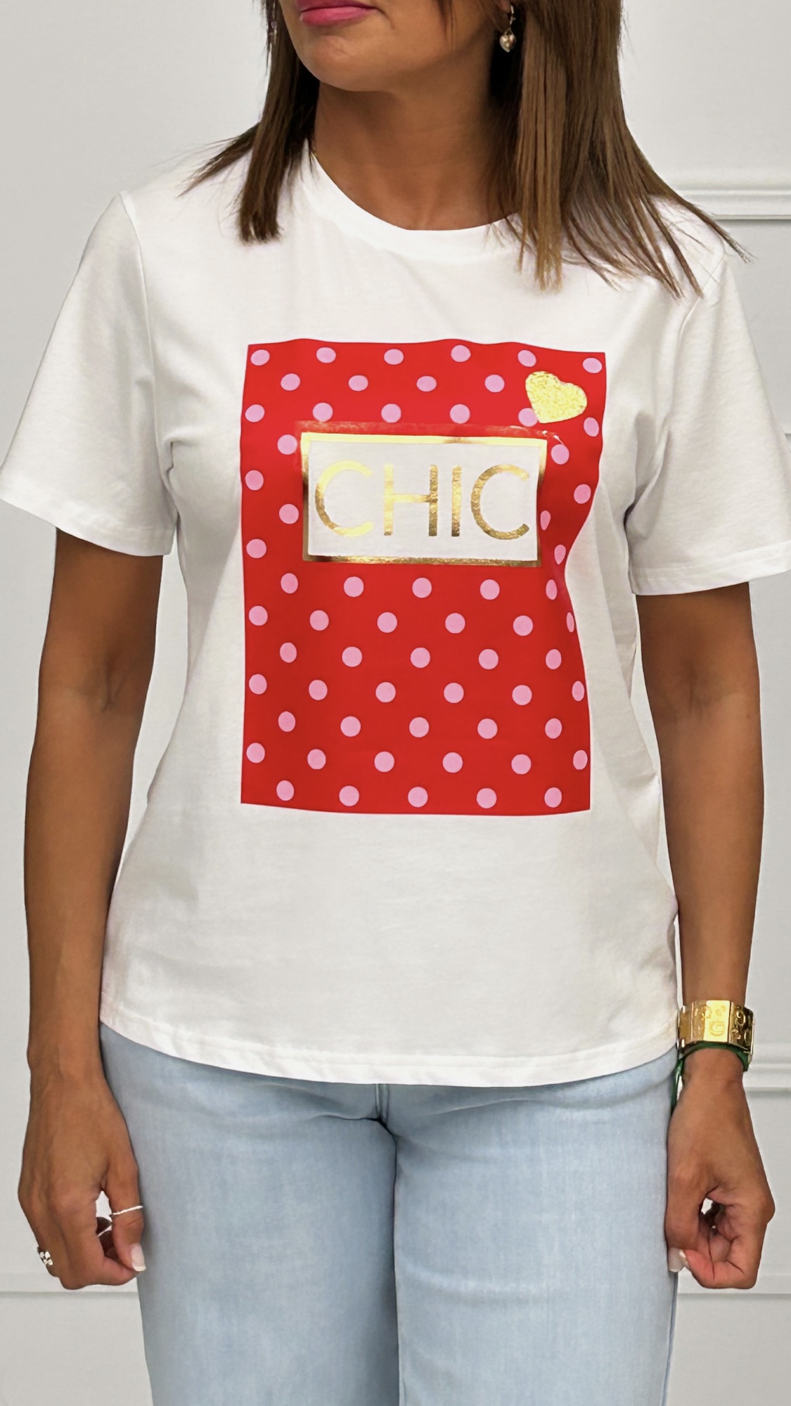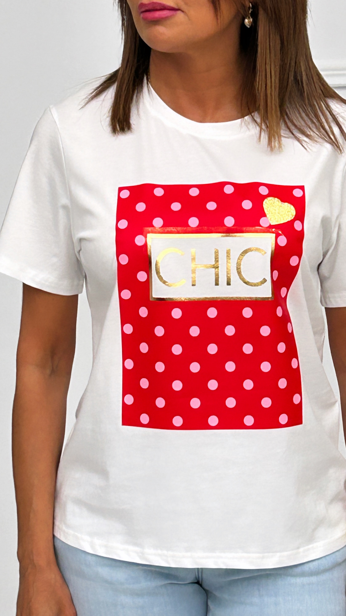 Camiseta de manga corta y cuello redondo. Una básica que lleva su detalle especial en el pecho. Un estampado de lunares disponible en varias combinaciones de colores con el toque dorado de un corazón y la palabra CHIC. El complemento perfecto para nuestras blazer de manga fruncida!