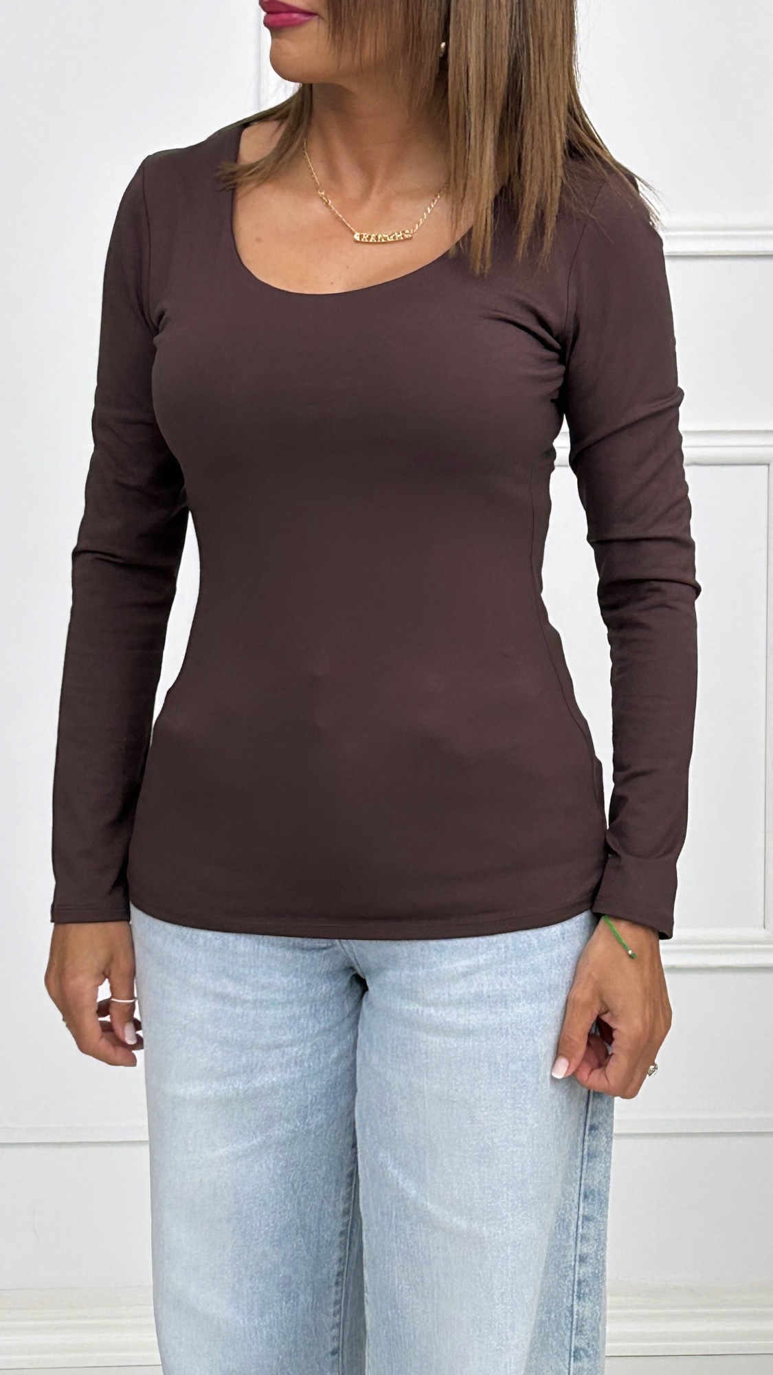 Llega el modelo de camiseta Elena en escote redondo. De manga larga y doble tela en la parte del pecho. Un básico que no puede faltarte en tu fondo de armario.