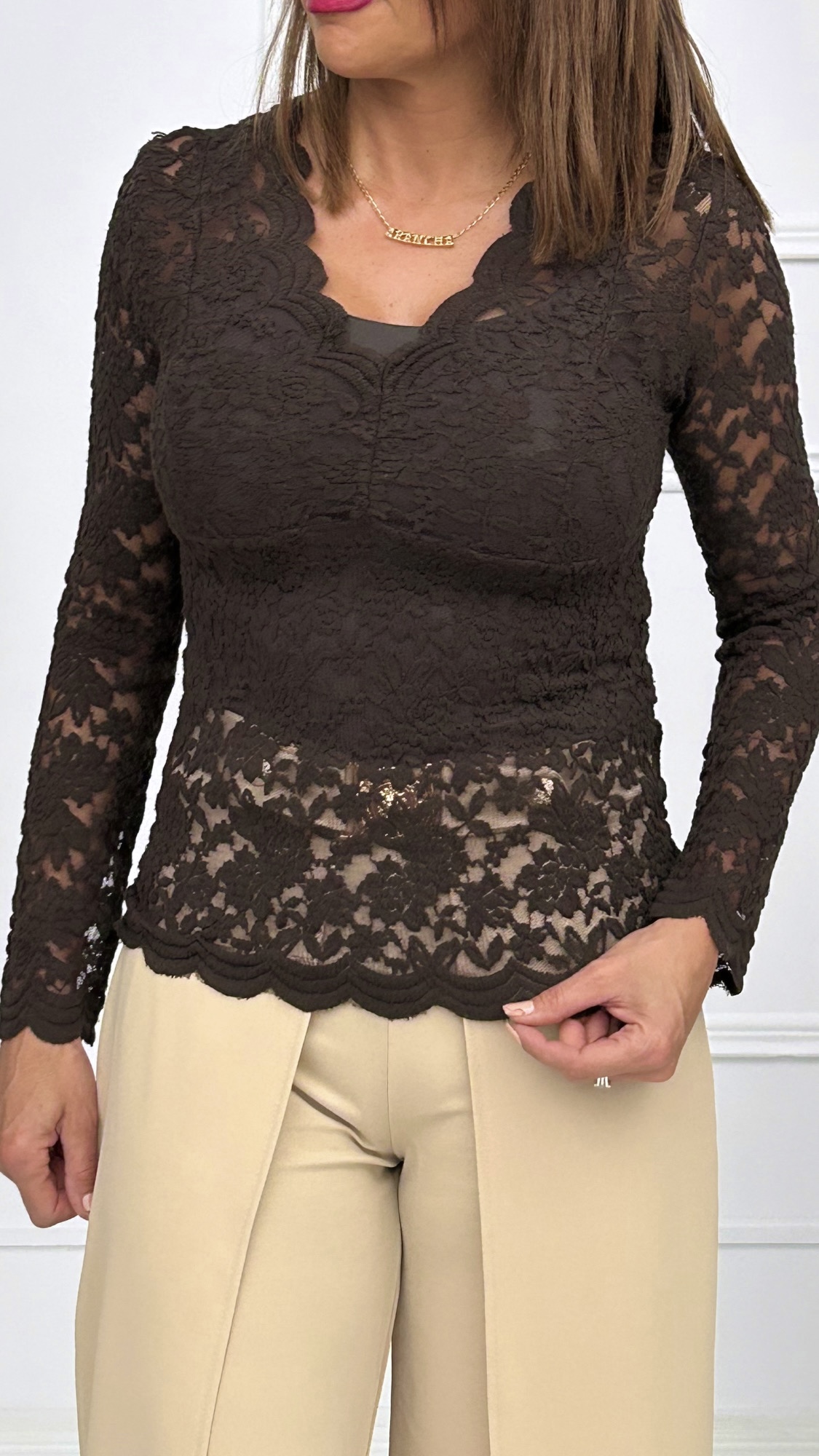 Camiseta diseñada en encaje transparente con cuello de pico para realzar nuestra silueta. De material elástico para ajustarse a nuestra talla.