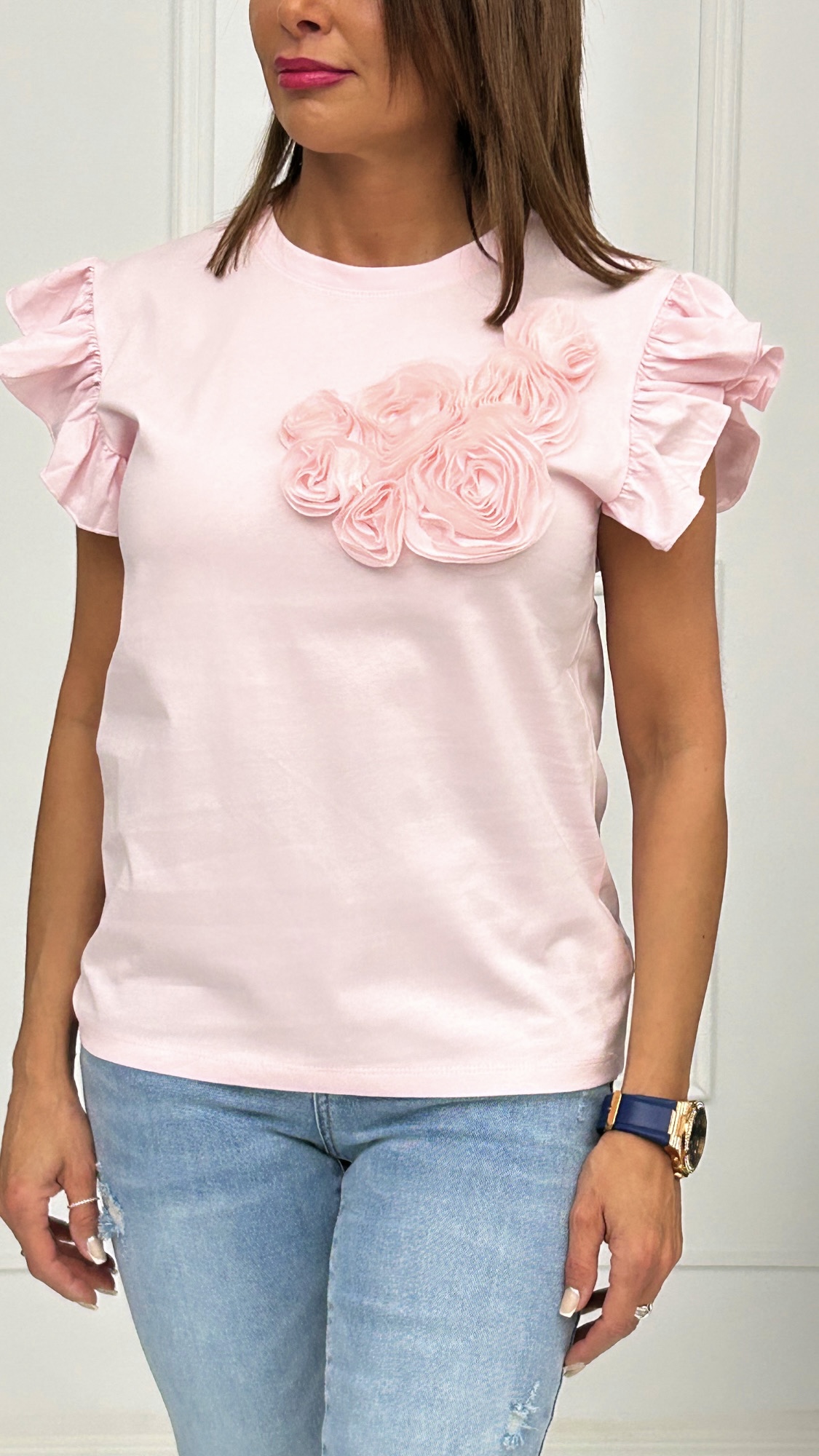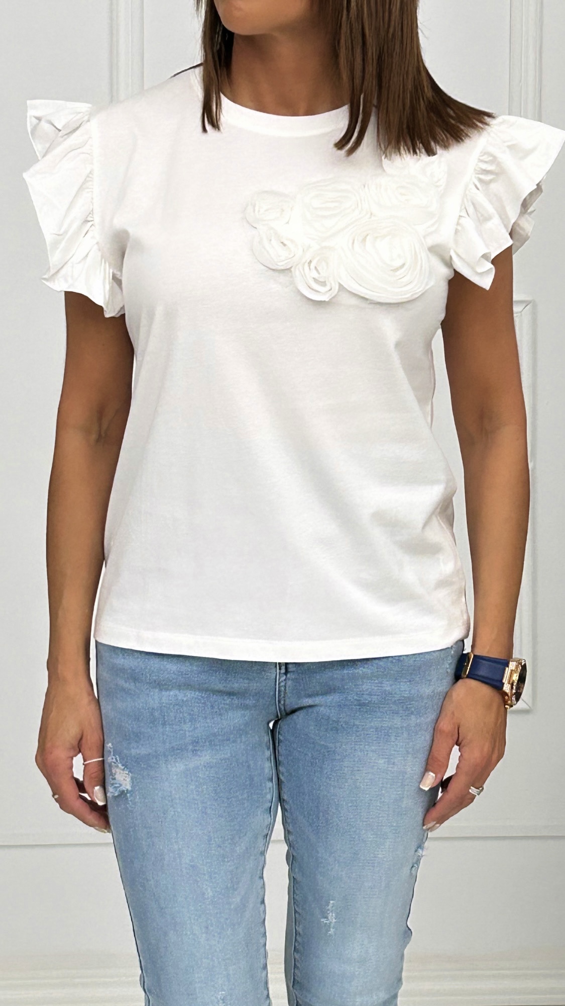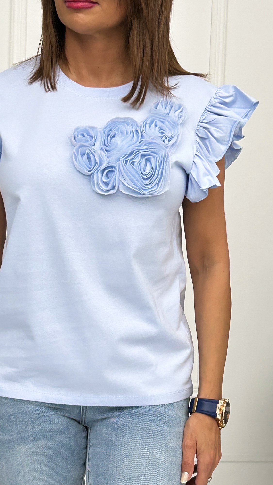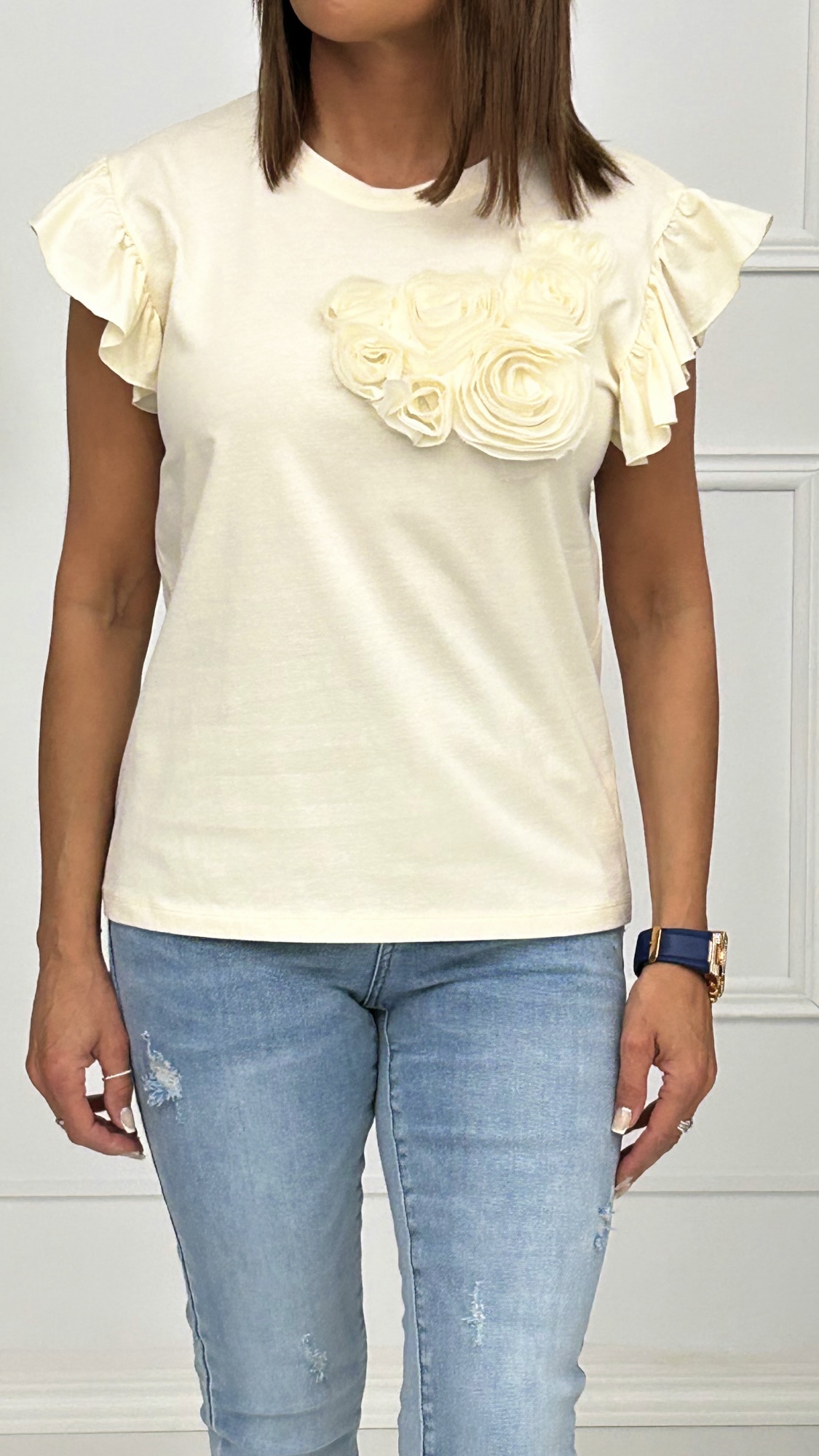 Camiseta de manga corta y cuello redondo disponible en varios colores ideales para la primavera. Lleva unido a los hombros un pequeño volante a modo de manga y como detalle a destacar lleva unas flores de tul en la parte del pecho en el mismo color de la prenda que le aportan el detalle más bonito. Combínala con tus skinny favoritos y luce ideal.