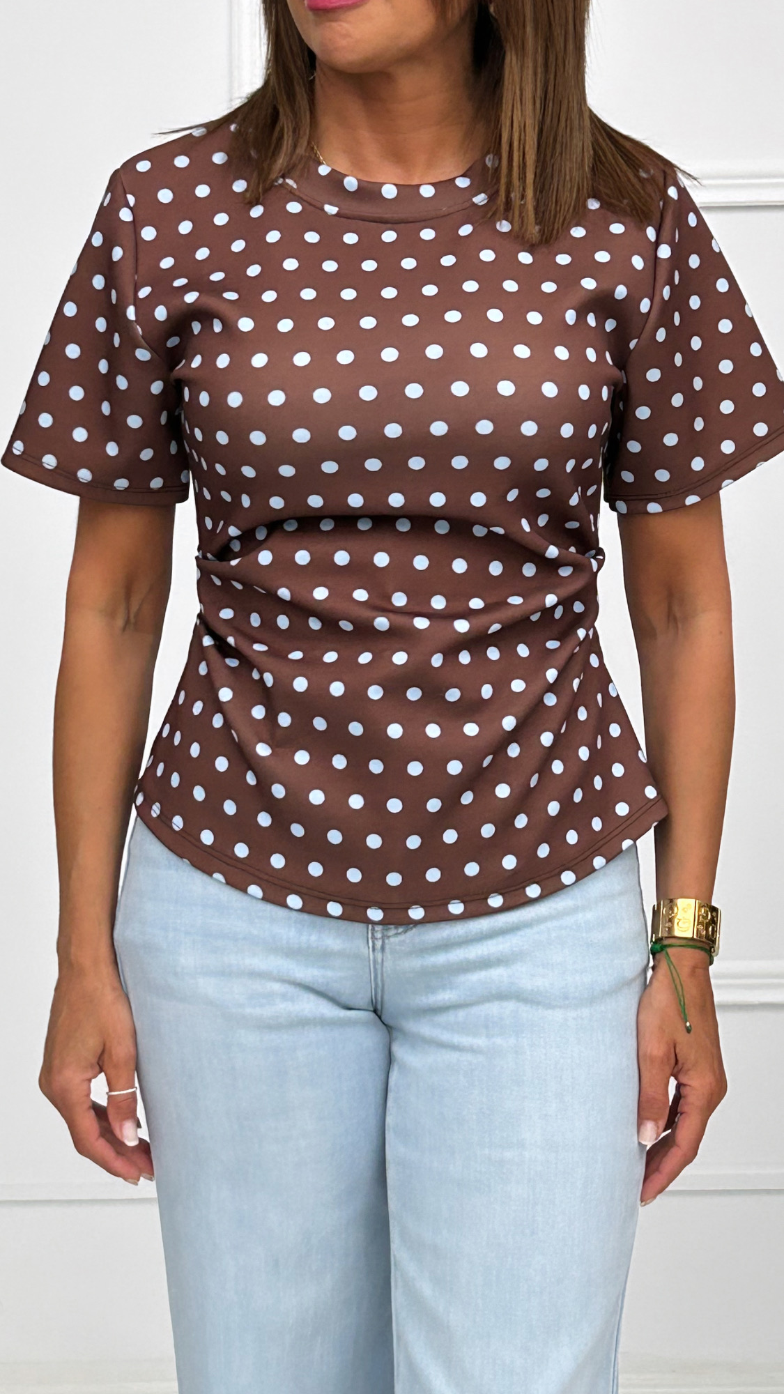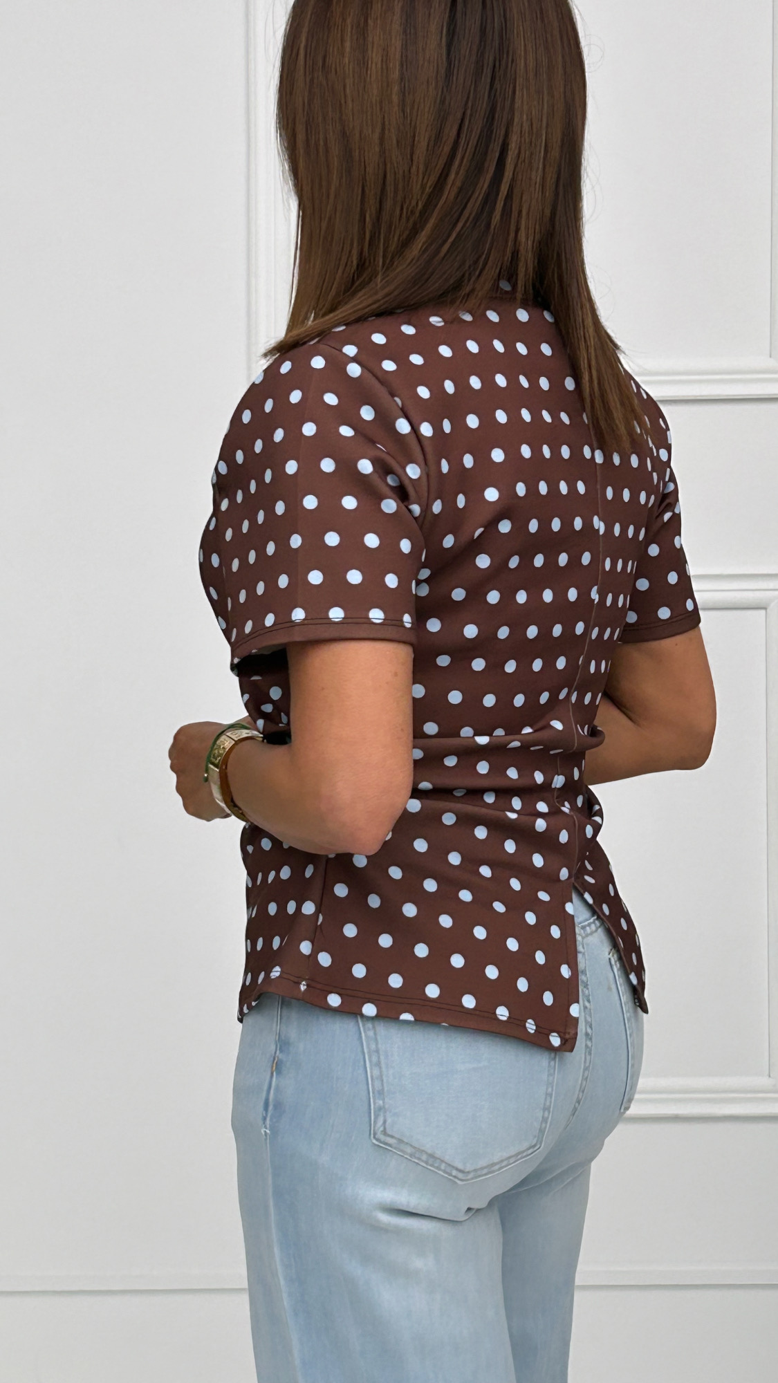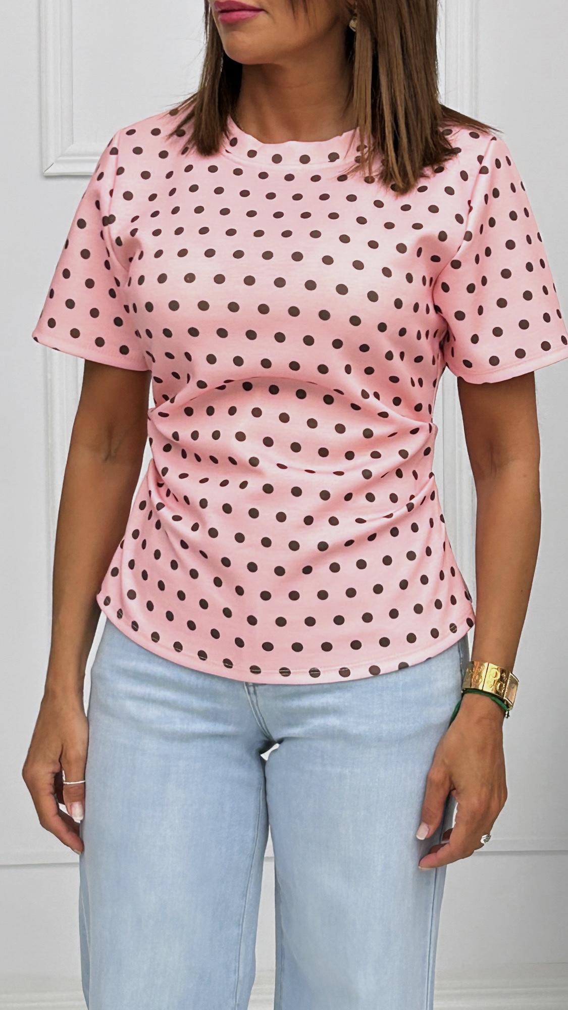 Camiseta de manga corta y cuello redondo en tejido de capa de aire. Estampado de lunares en dos combinaciones de colores diferentes con drapeado en ambos laterales. Tiene el bajo redondeado y en la parte de la espalda tiene una mini abertura en forma de triángulo que le aporta el toque especial y diferente.