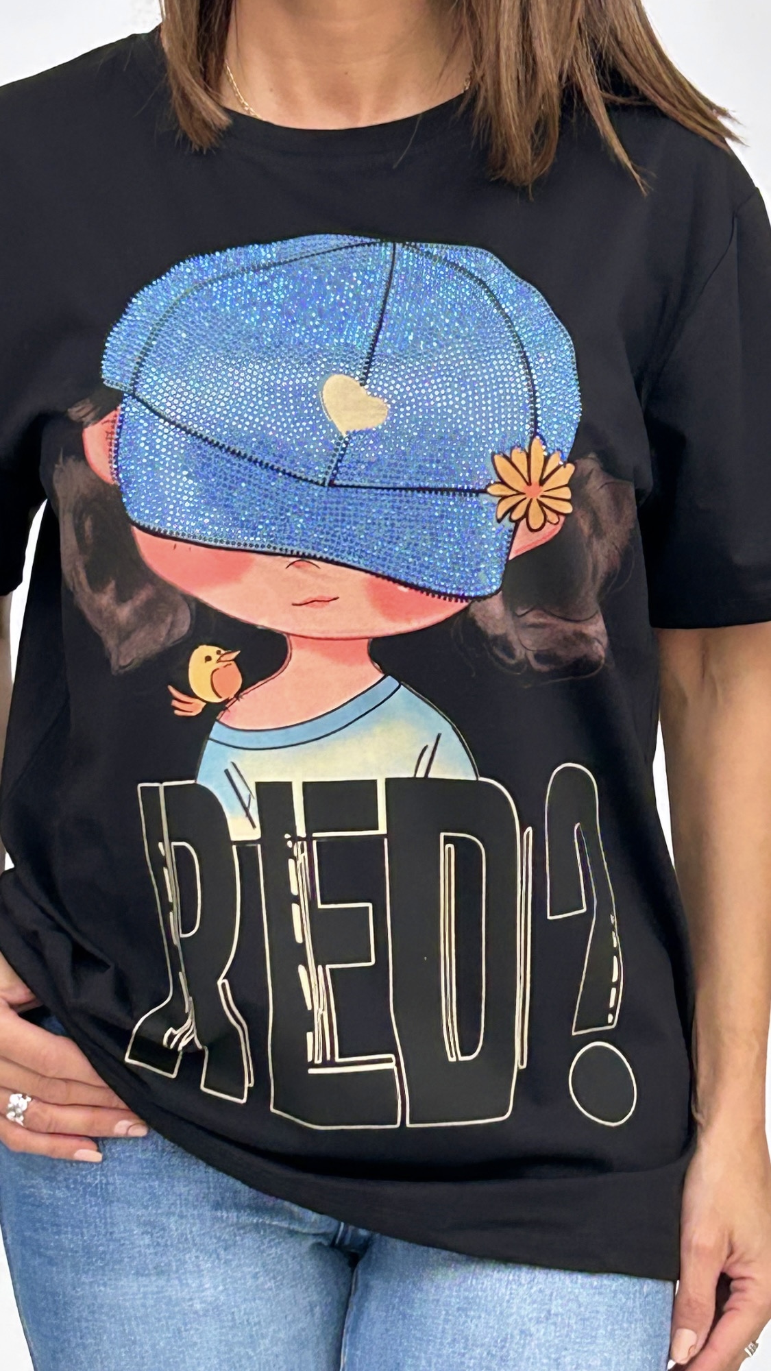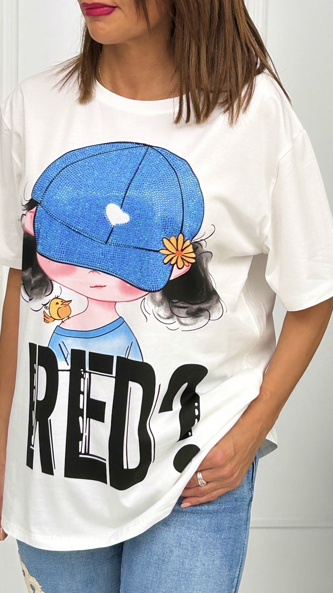 Camiseta estilo oversize de manga corta y cuello redondo con estampado de una niña con una preciosa gorra llena de brilli brilli. Disponible en dos colores y talla única.