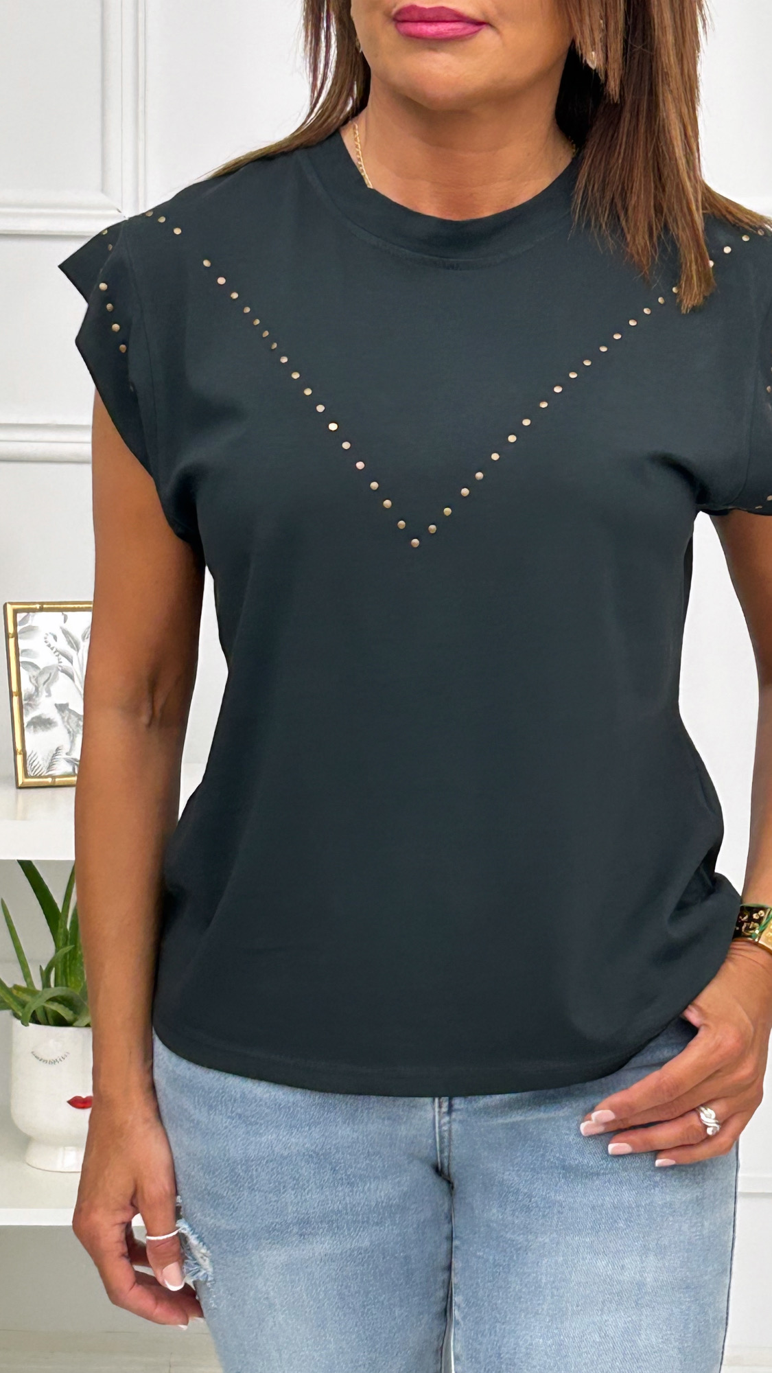 Camiseta básica sin mangas, con un pequeño añadido que cae sobre los hombros, y cuello redondo. Su detalle especial son las tachuelas pequeñas en tono dorado que lleva tanto en el hombro como en la parte del pecho con forma de triángulo.