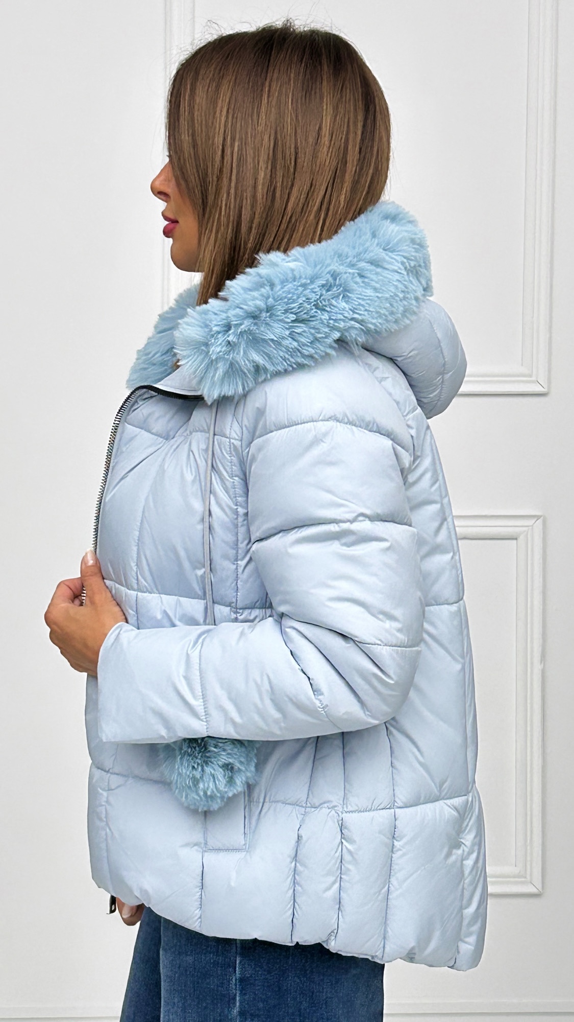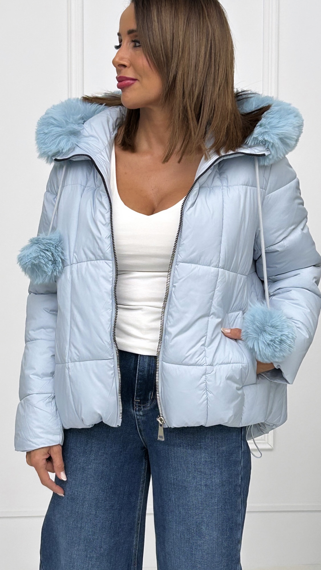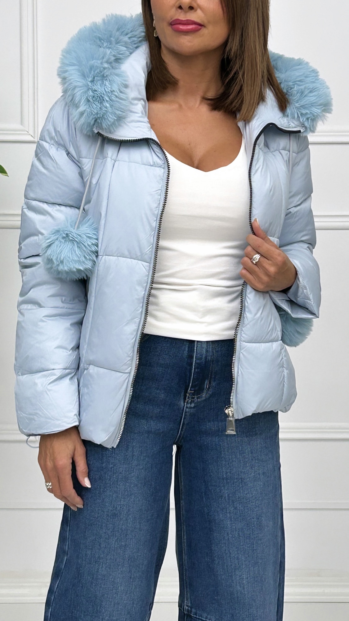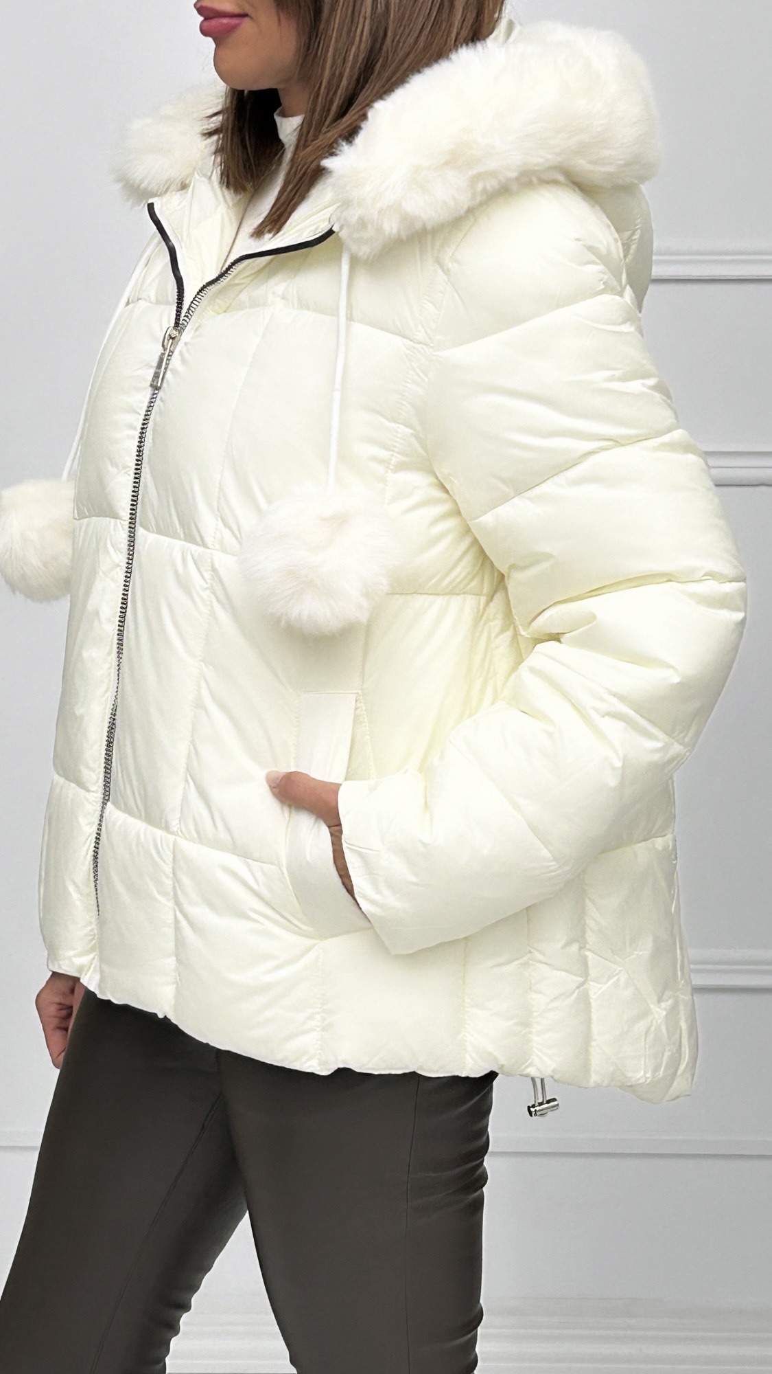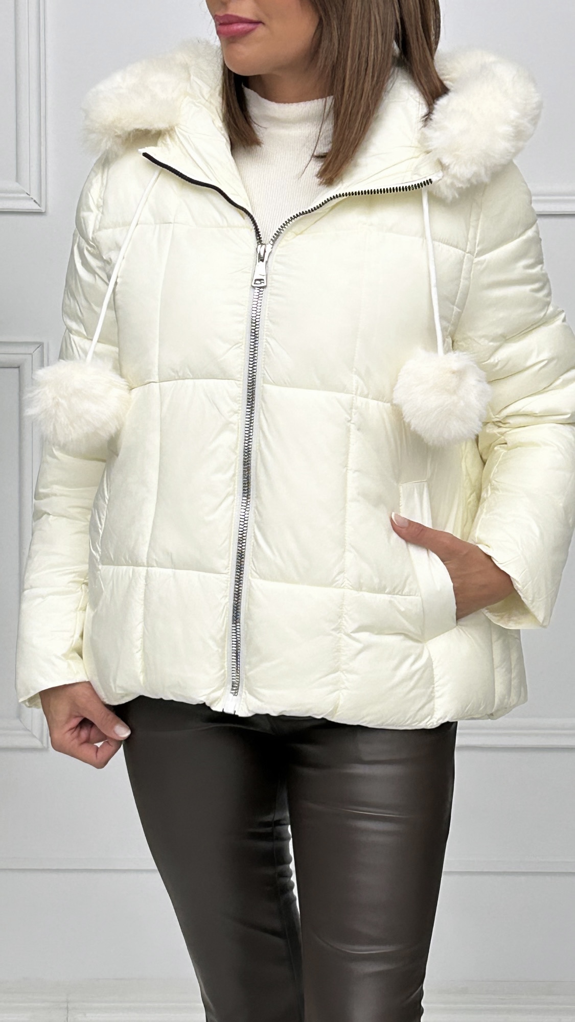 Cazadora corta acolchada con gorro unido a la prenda. Lleva cordón con dos pompones en pelito al igual que el gorro, que también lleva pelo solo que este con la opción de ponerlo o quitarlo según tus gustos. Tiene bolsillos y cordón para fruncir en los laterales y ajustarlo al cuerpo. Cremallera en plateado y ligeramente más largo en la espalda.