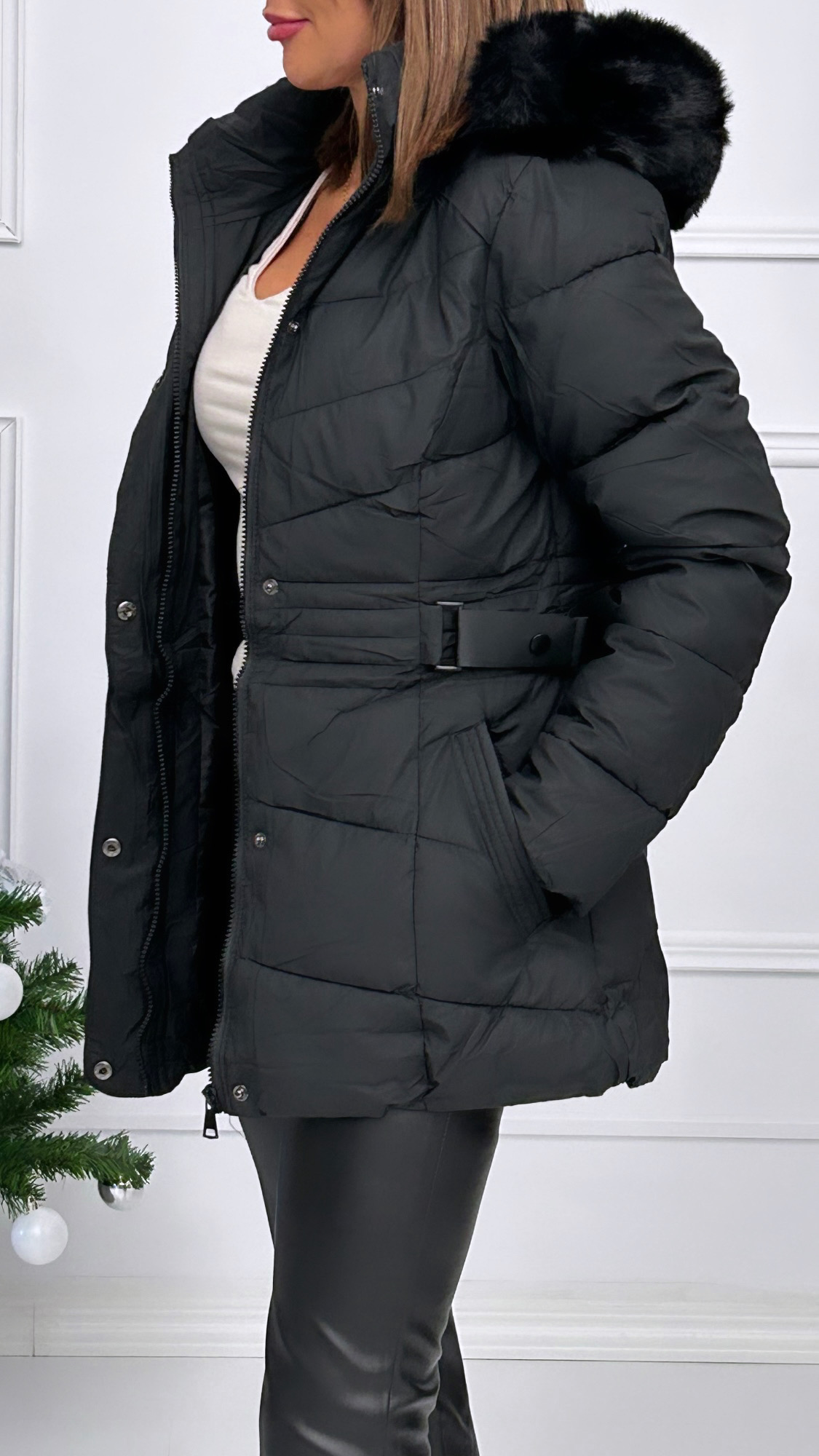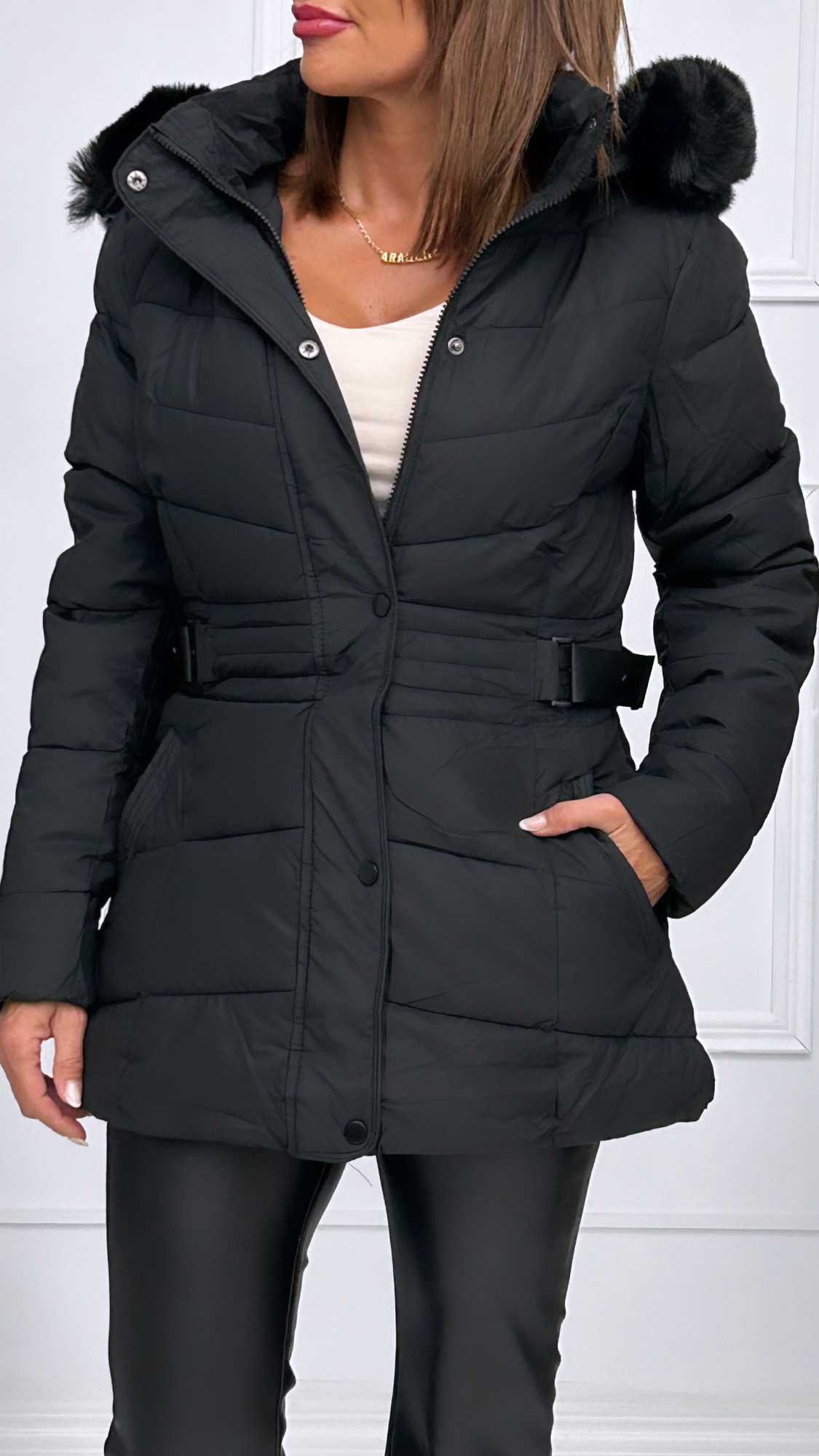 Plumas en tono marrón, de corte medio, perfectos para el invierno. Con capucha con borde de pelo totalmente desmontable. Con hebillas laterales para entallarlo y resaltar así nuestra figura.
