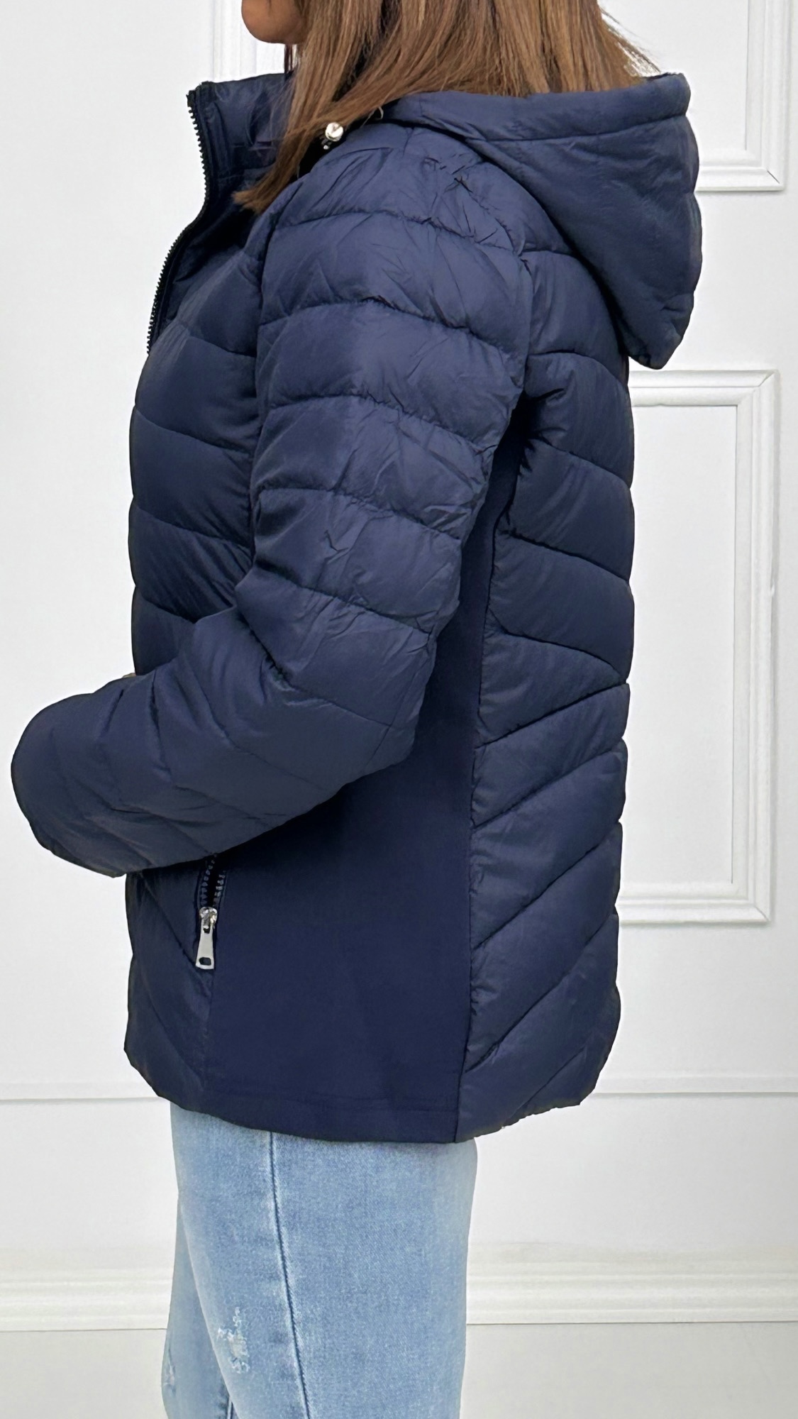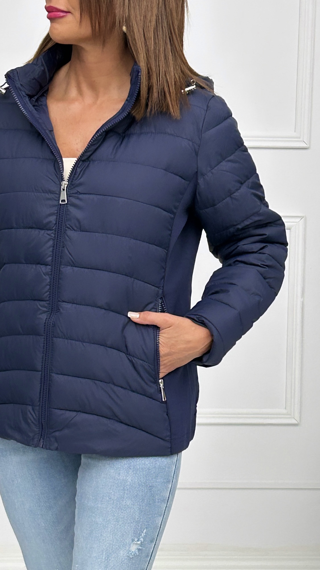 Chaqueta acolchada de entre tiempo con gorro unido a la prenda por una cremallera. Puedes quitar y poner, como más te guste. Tiene goma para ajustar si lo necesitas. Bolsillos laterales con cierre de cremallera, al igual que el cierre frontal, del mismo color que la prenda. Lleva tela con elástico en los laterales por lo que se ajusta mejor a la talla.
