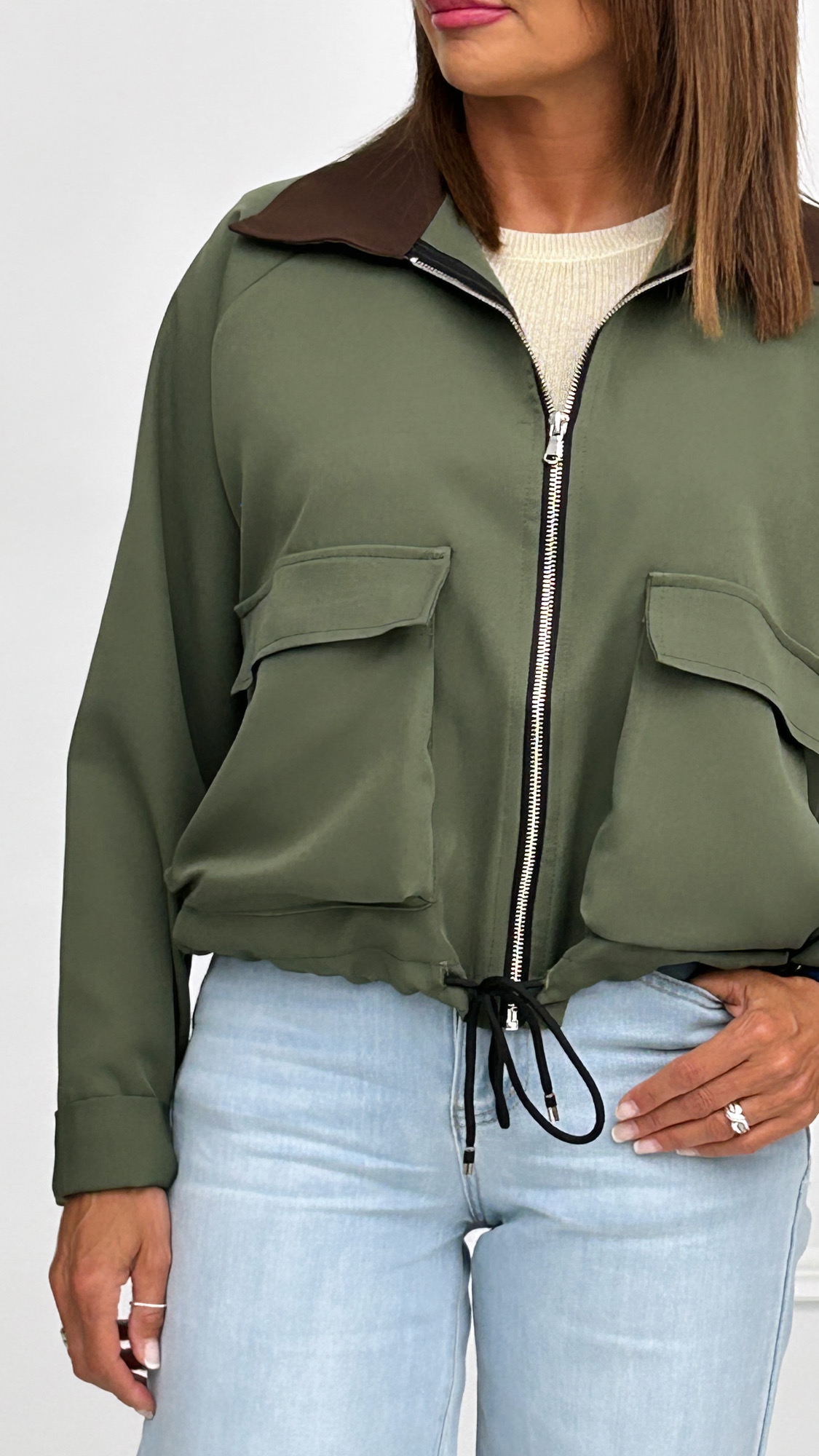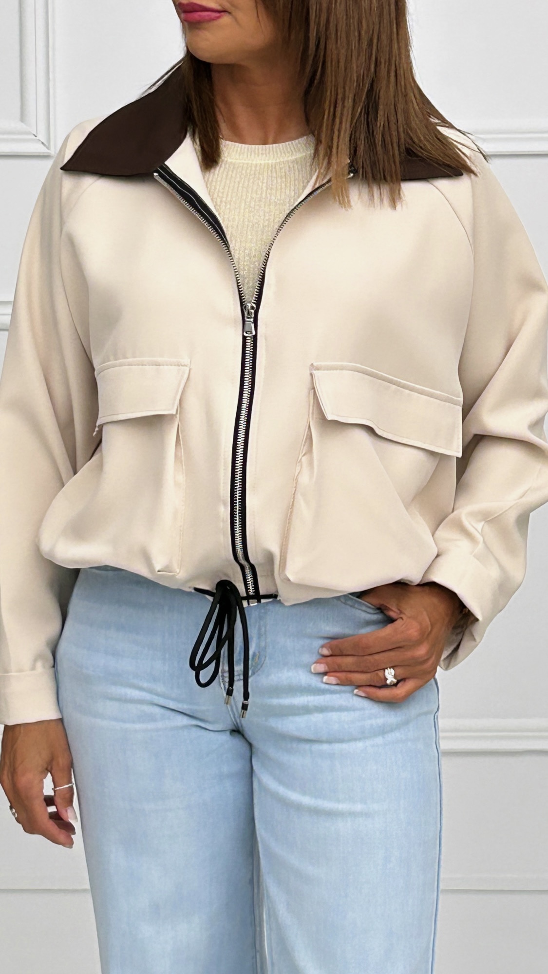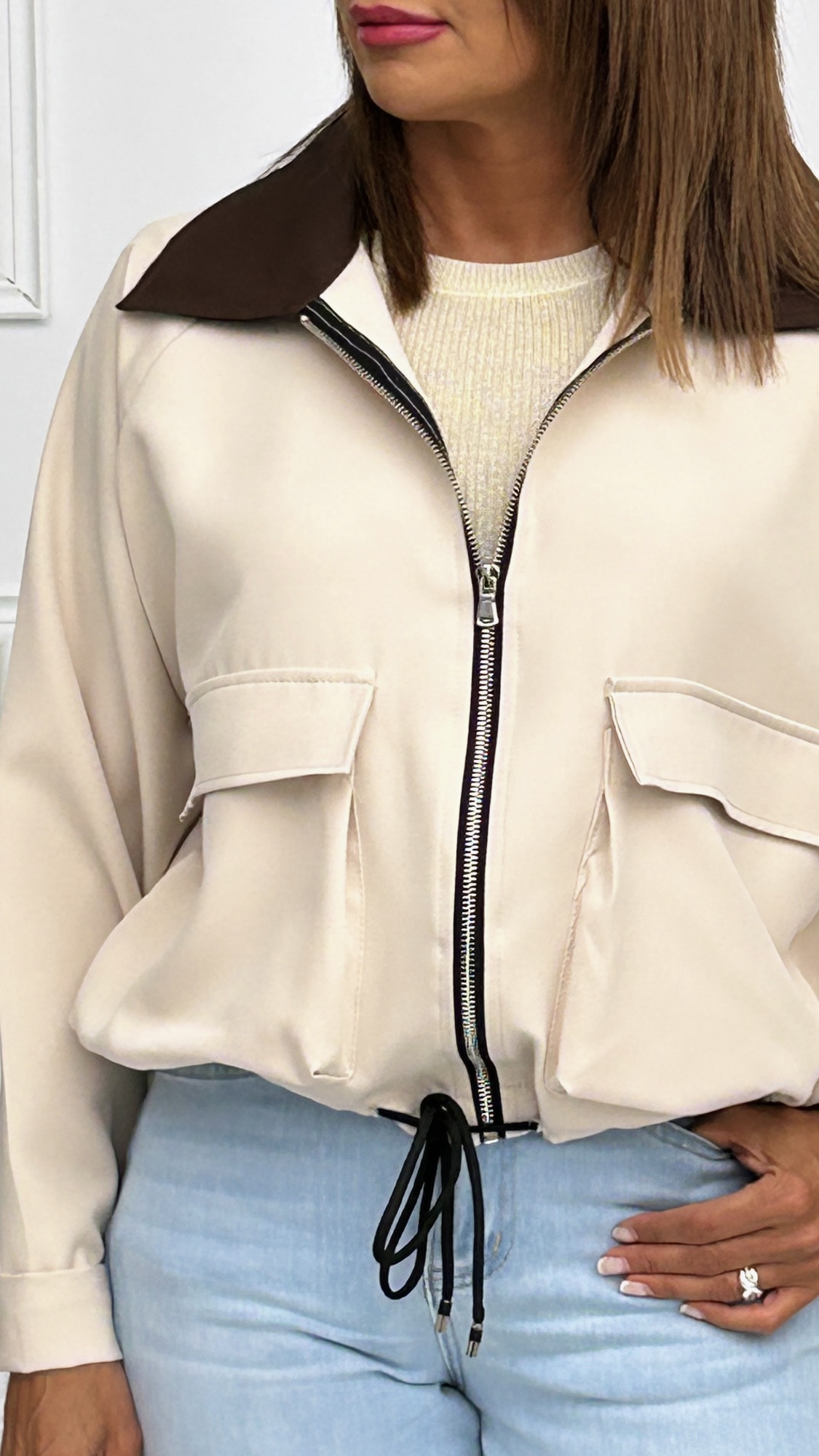 Chaqueta estilo bomber disponible en dos colores diferentes. De estilo oversize, con cordón en el bajo para fruncir y así ajustar y acortar. Bolsos cuadrados en los laterales con tapa. Ambos colores tienen el cuello en marrón y cremallera en plateado.
