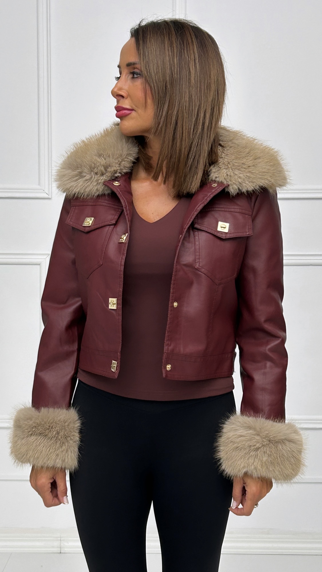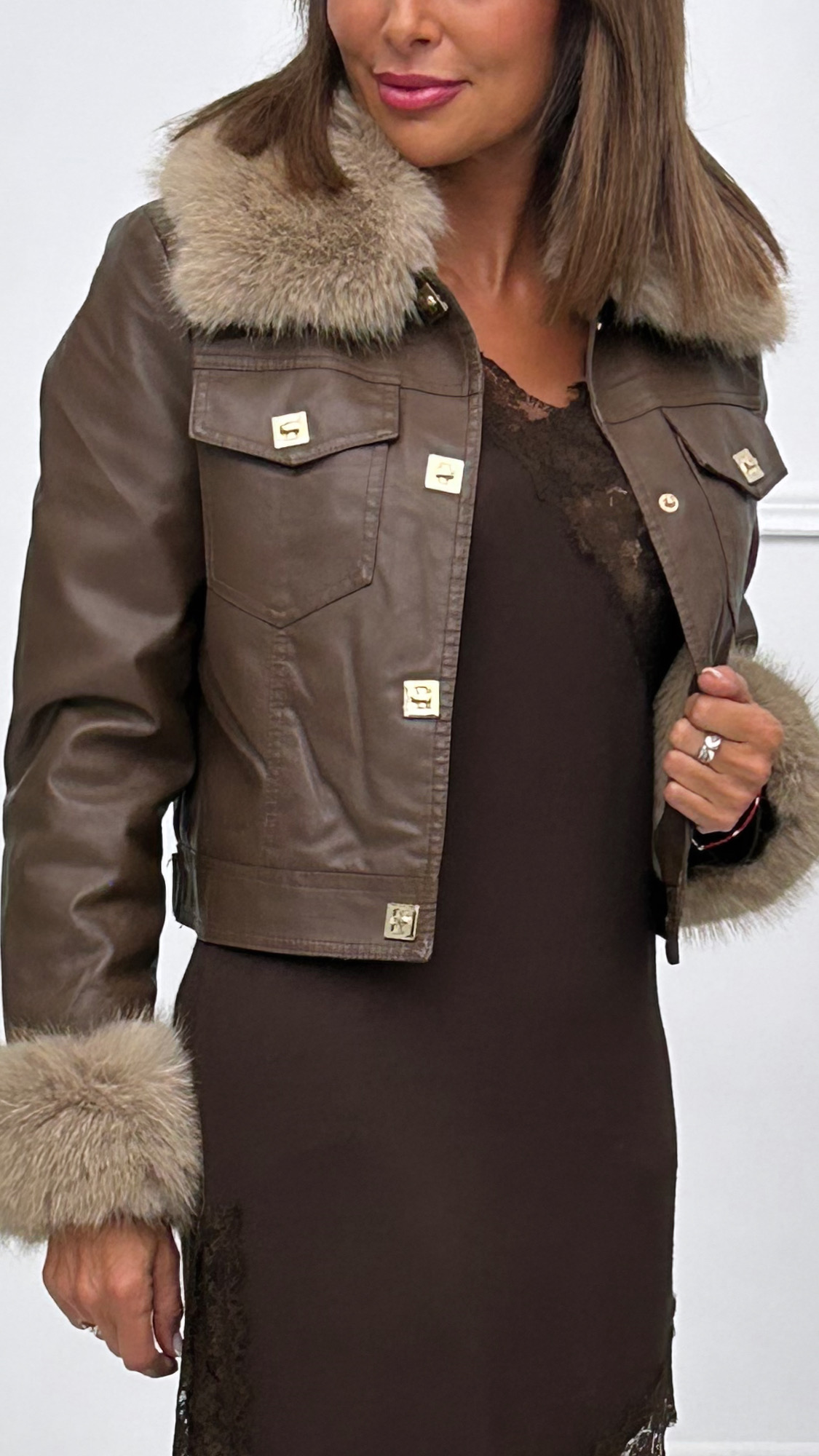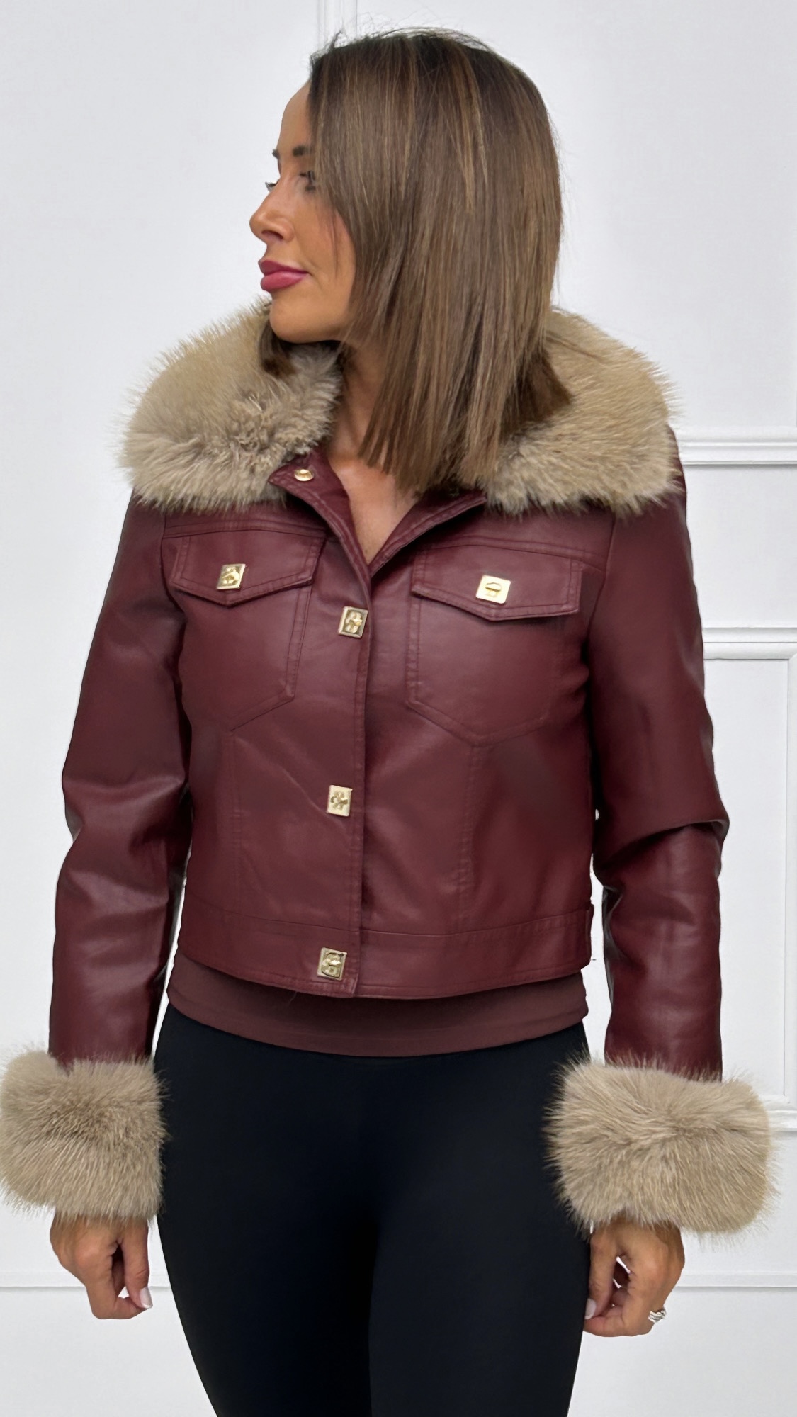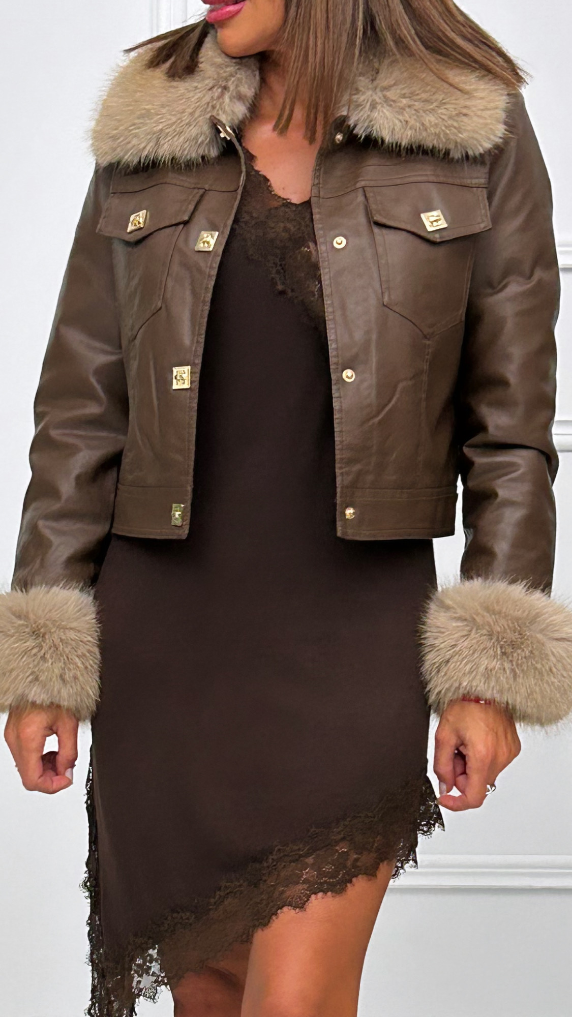 Chaqueta corta de piel con pelo tanto en el cuello como en los puños dándole ese toque elegante que la prenda reclama. Disponible en los colores de la temporada, marrón chocolate y burdeos con el pelo en beige haciendo contraste. Viene forrada por dentro de pelito para que aparte de bonita sea una prenda que abrigue. Sus botones automáticos en dorado tiene una forma especial cuadrada imitando a un cierre.