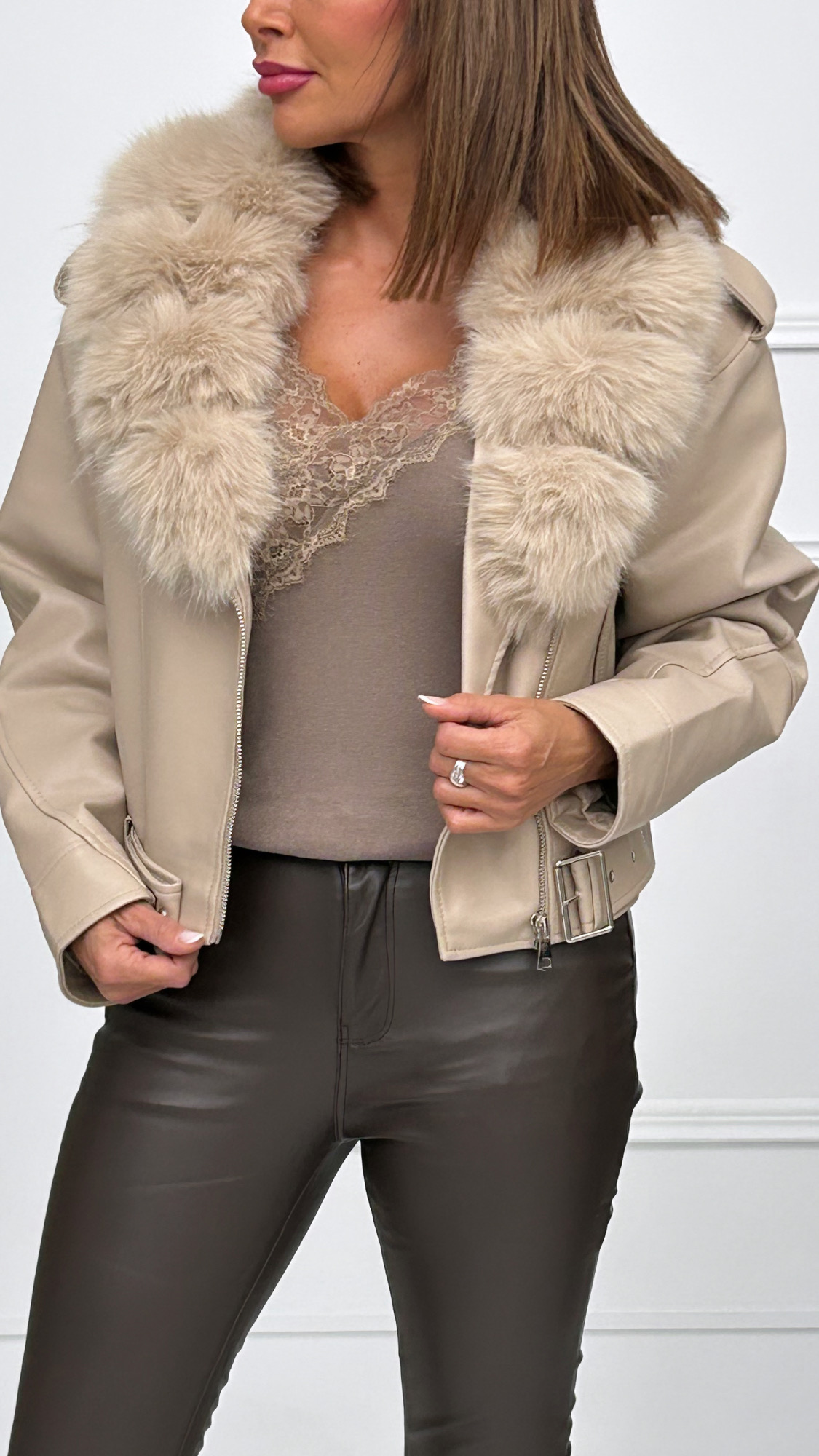 Chaqueta estilo biker de piel forrada de pelito por dentro. Tiene bolsillos laterales y cinturón en el mismo color y tejido. Presillas en los hombros con botón de presión. Lleva pelo en el cuello que puedes poner y quitar según tu gusto o según te apetezca ese día. Todos los detalles de la chaqueta son en plata. Cierre de cremallera delantera.