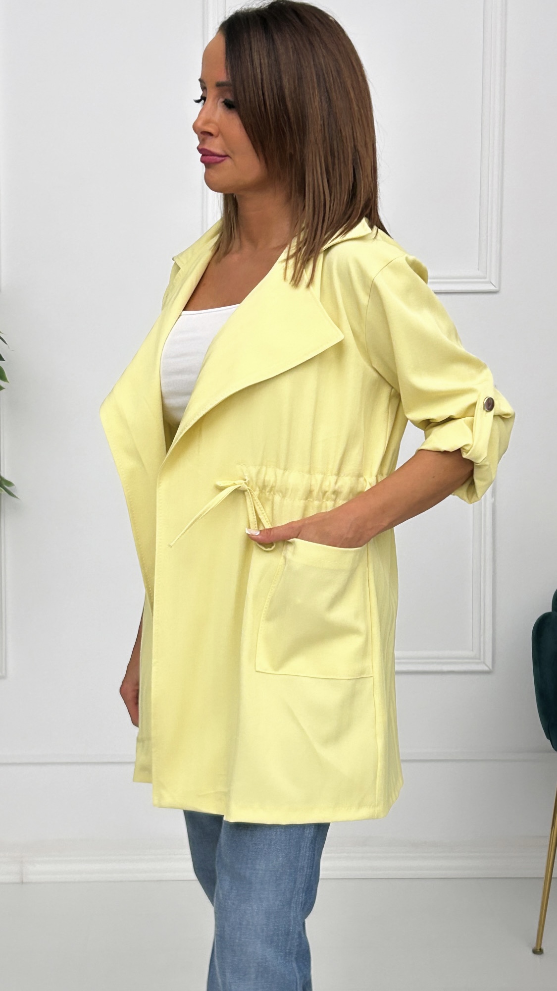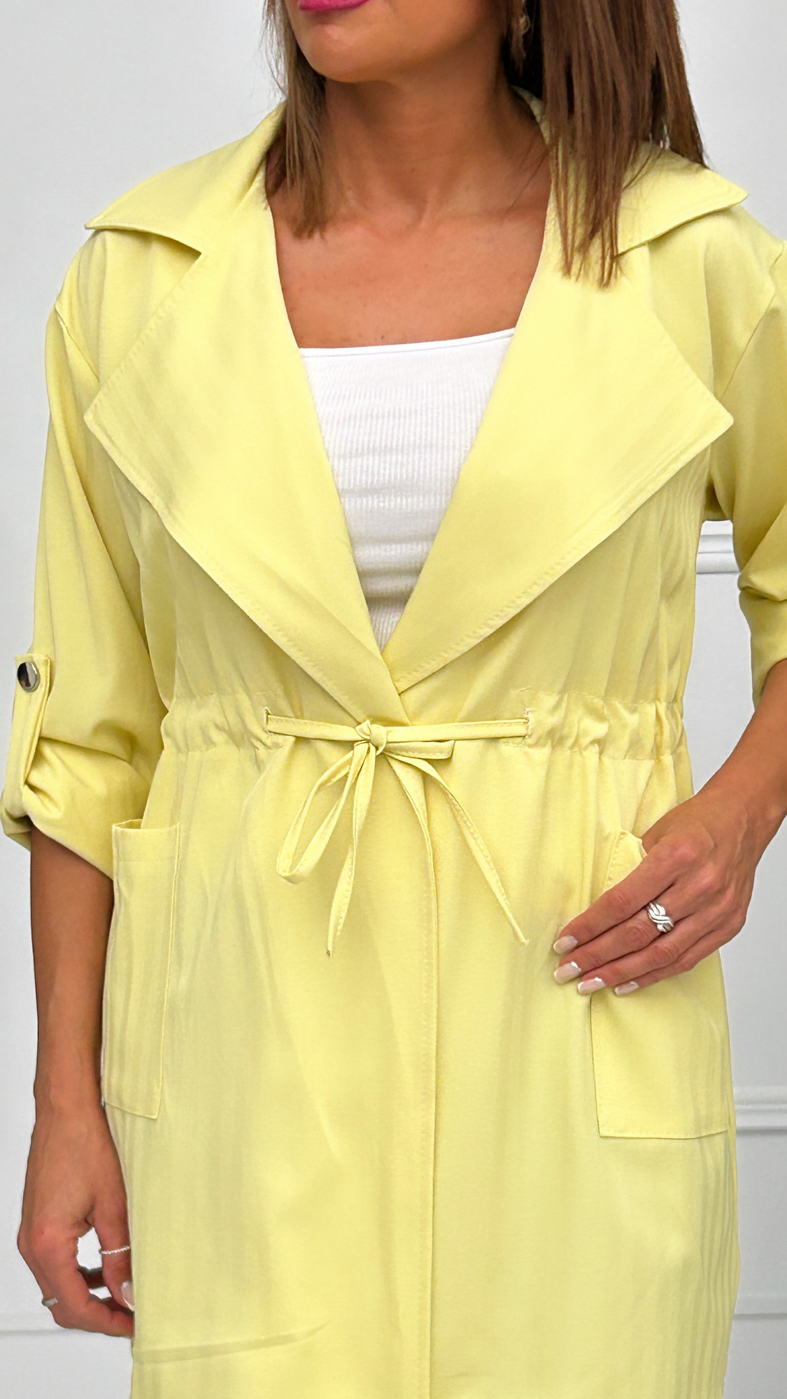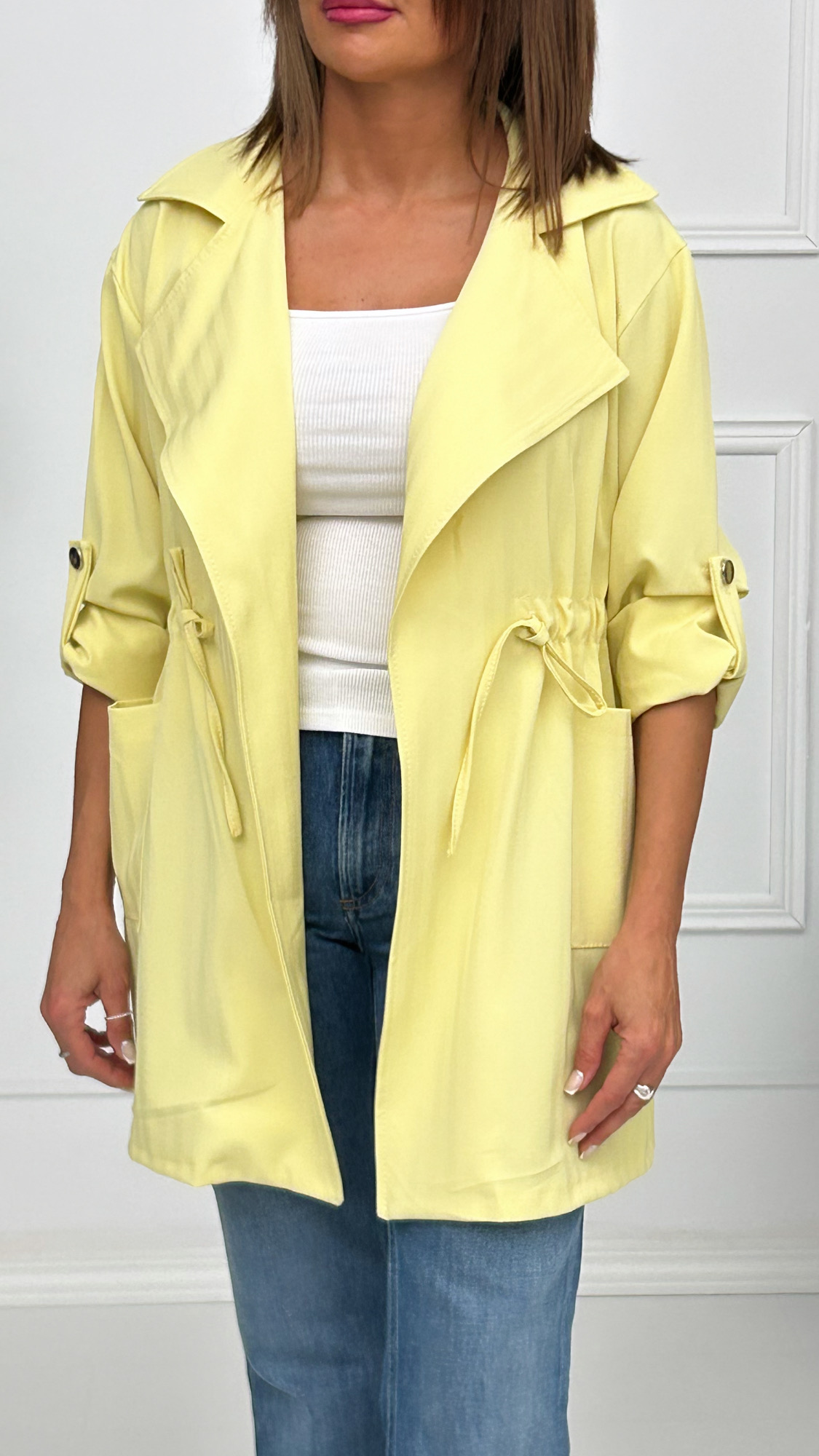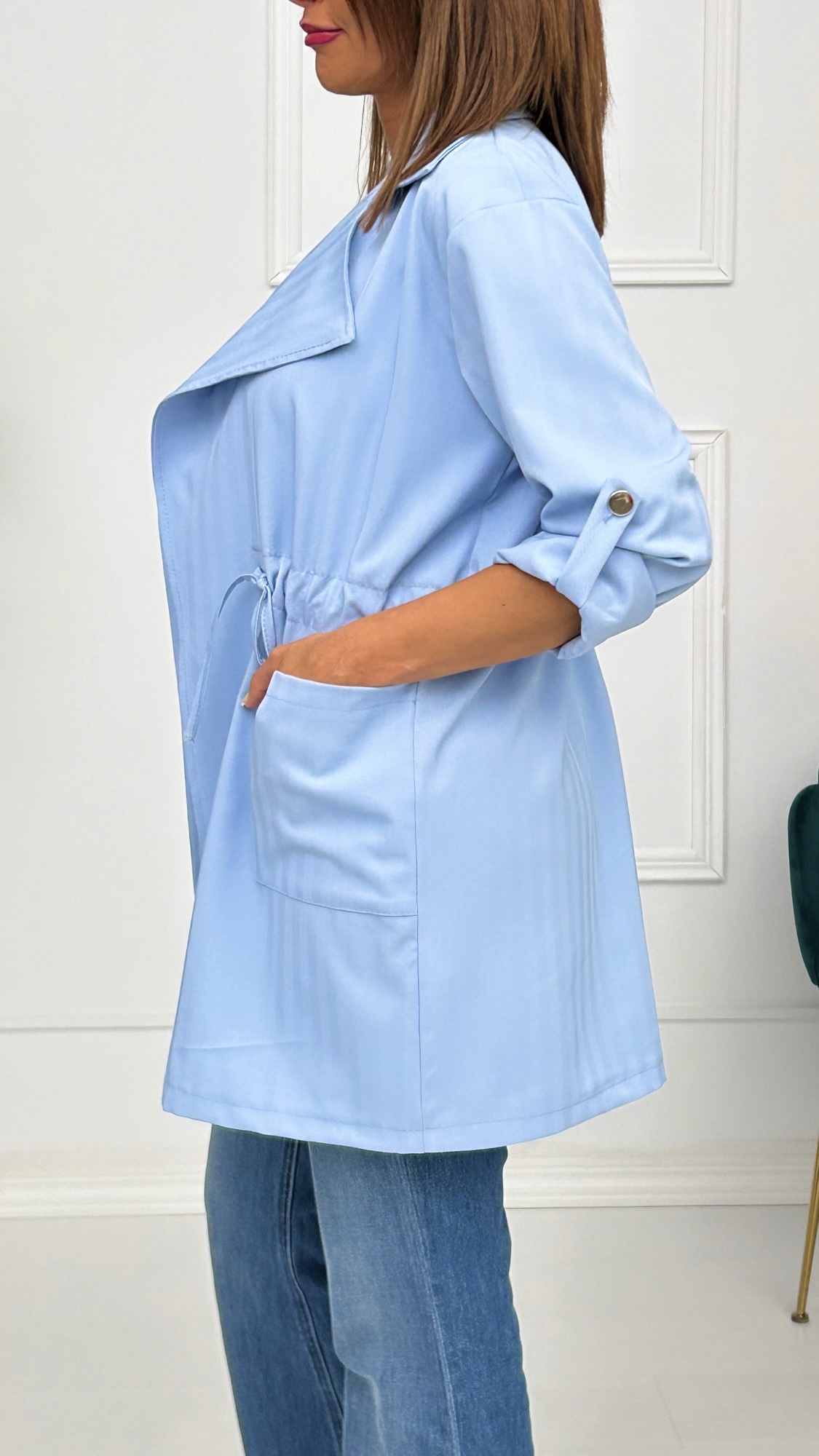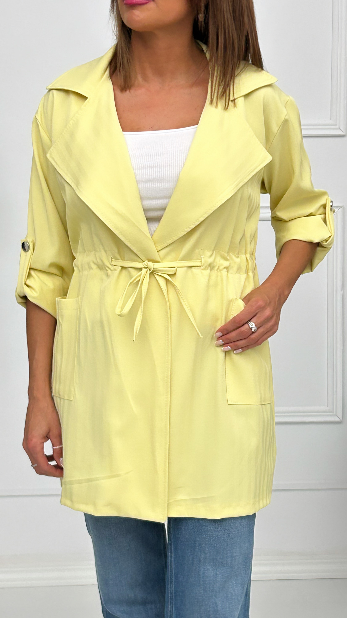 Chaqueta fina de corte recto y tejido rayado. Bolsillos cuadrados en los laterales y cuellos de solapa. Cordón para fruncir y ajustar en la cintura. Manga larga con presilla de botón para acortarla y llevar sujeta si estás más cómoda. Ideal para la primavera si quieres llevar algo de abrigo encima pero sin pasar calor.