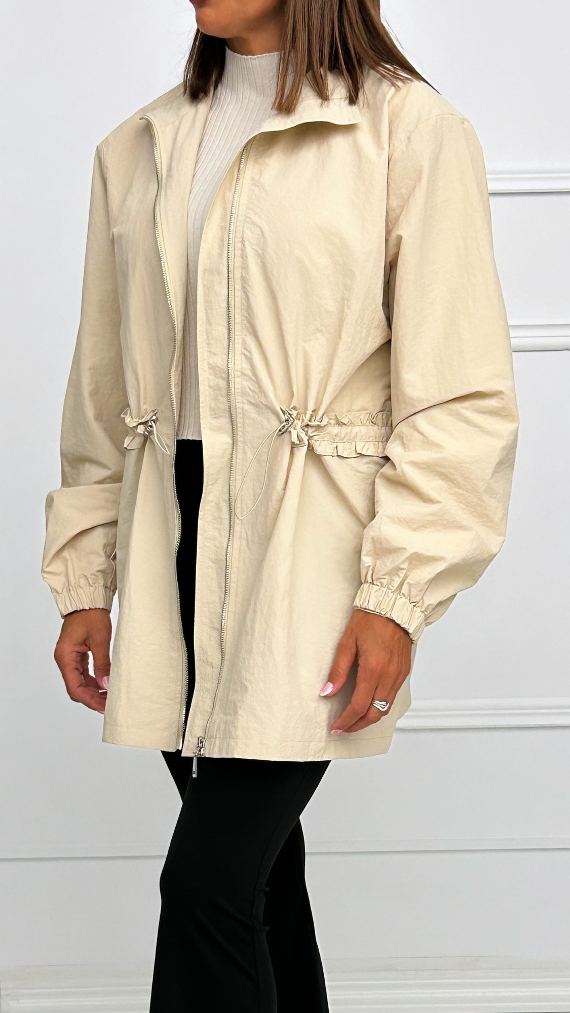 Chaqueta de entretiempo perfecta para este otoño, con un adorno en la cintura que permite fruncirla en esa zona para hacerla más o menos entallada.