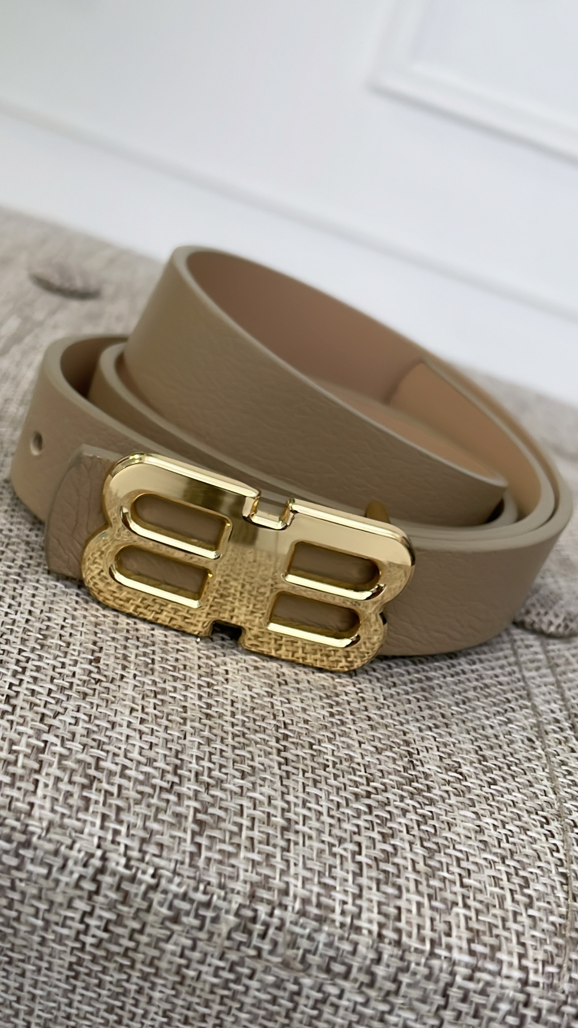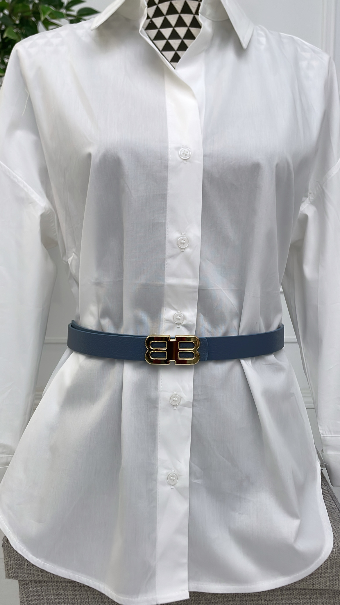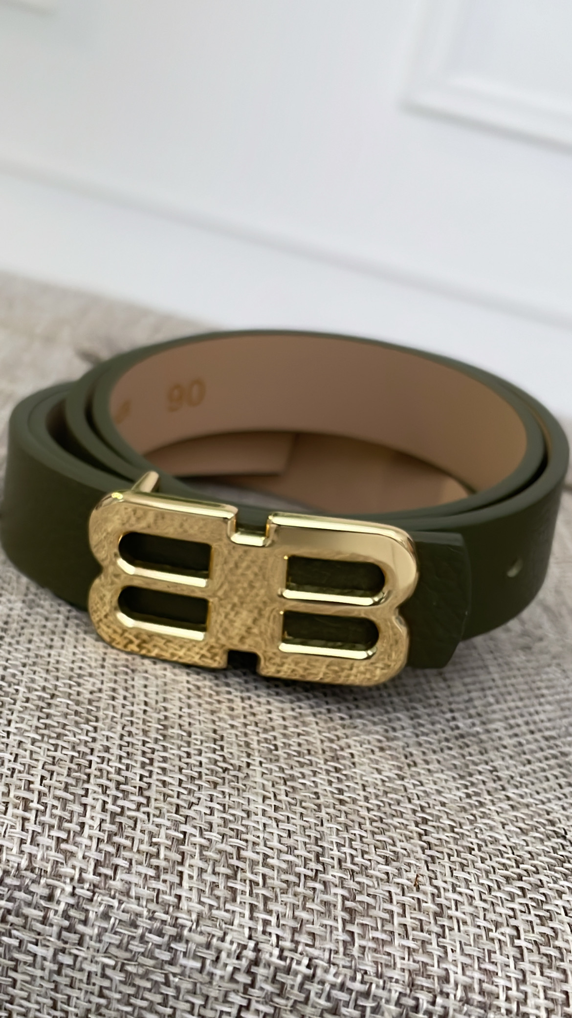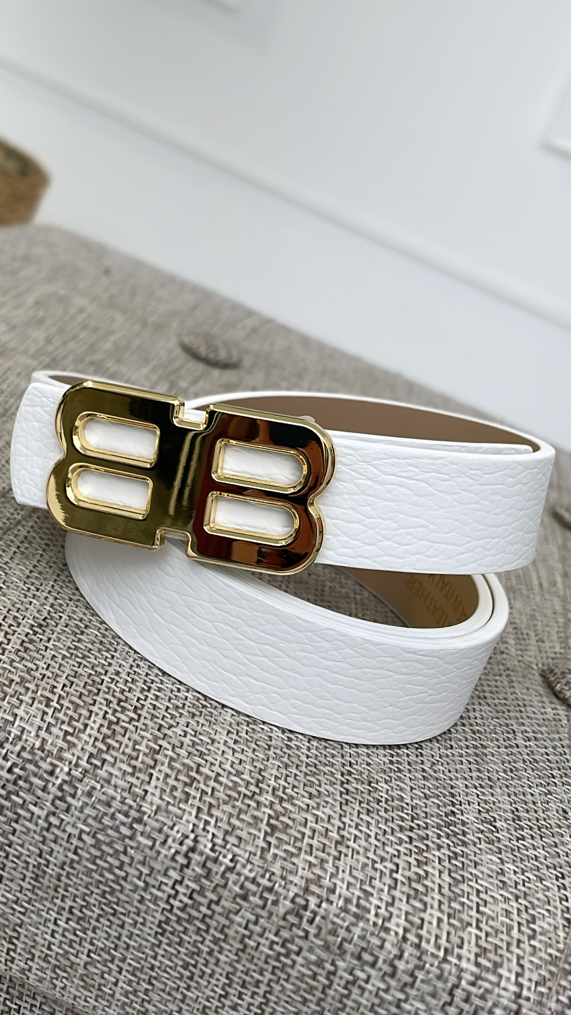 Cinturón con hebilla dorada en forma de B.