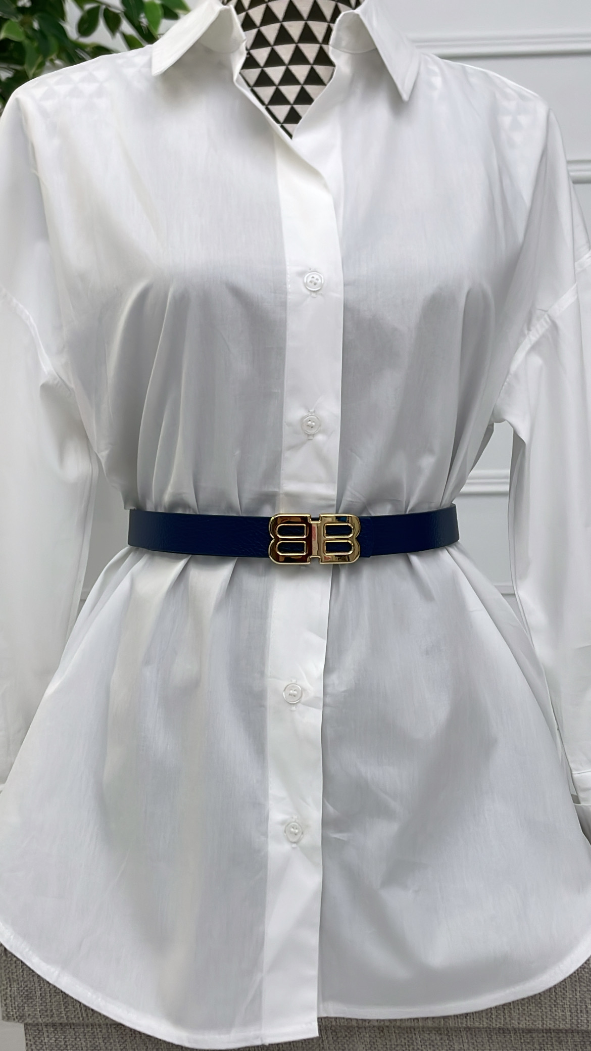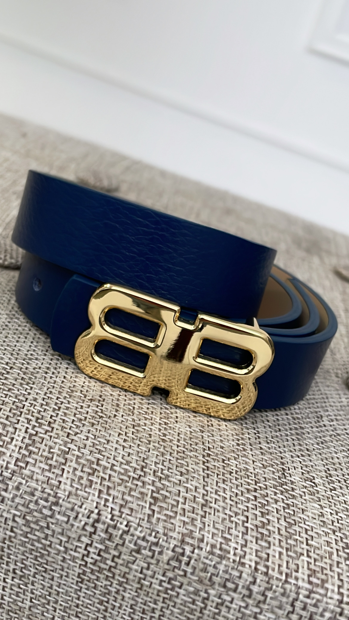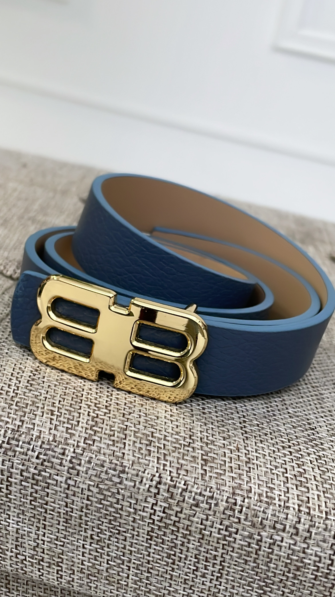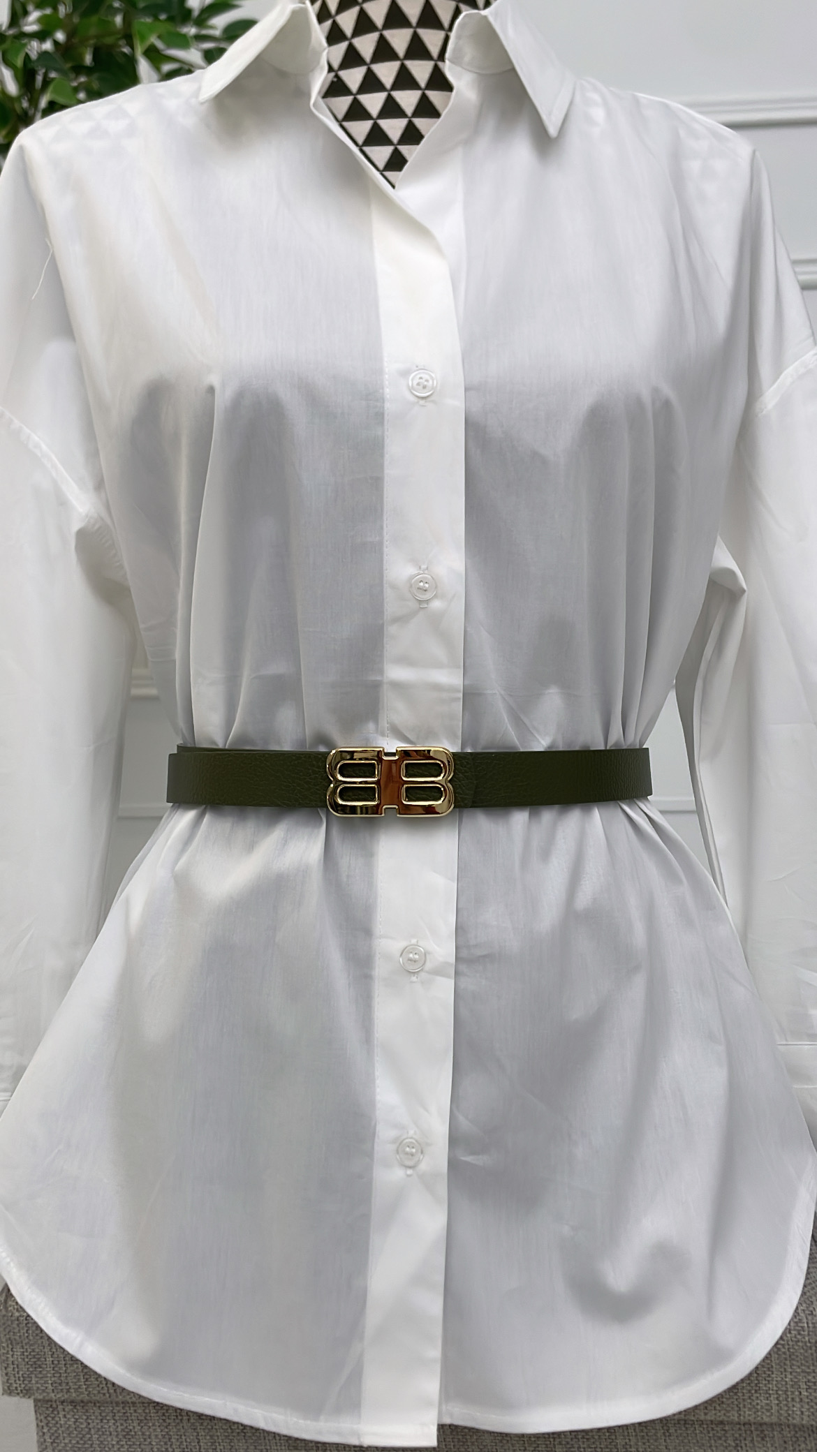Cinturón con hebilla dorada en forma de B.