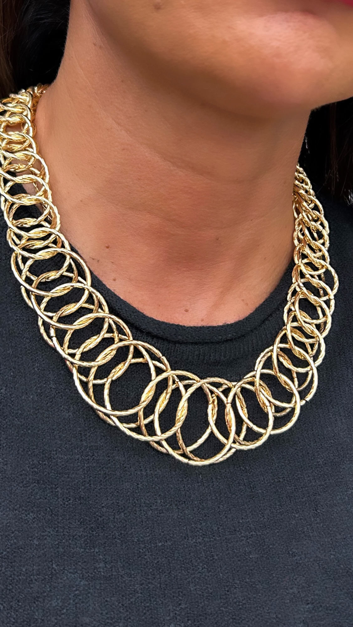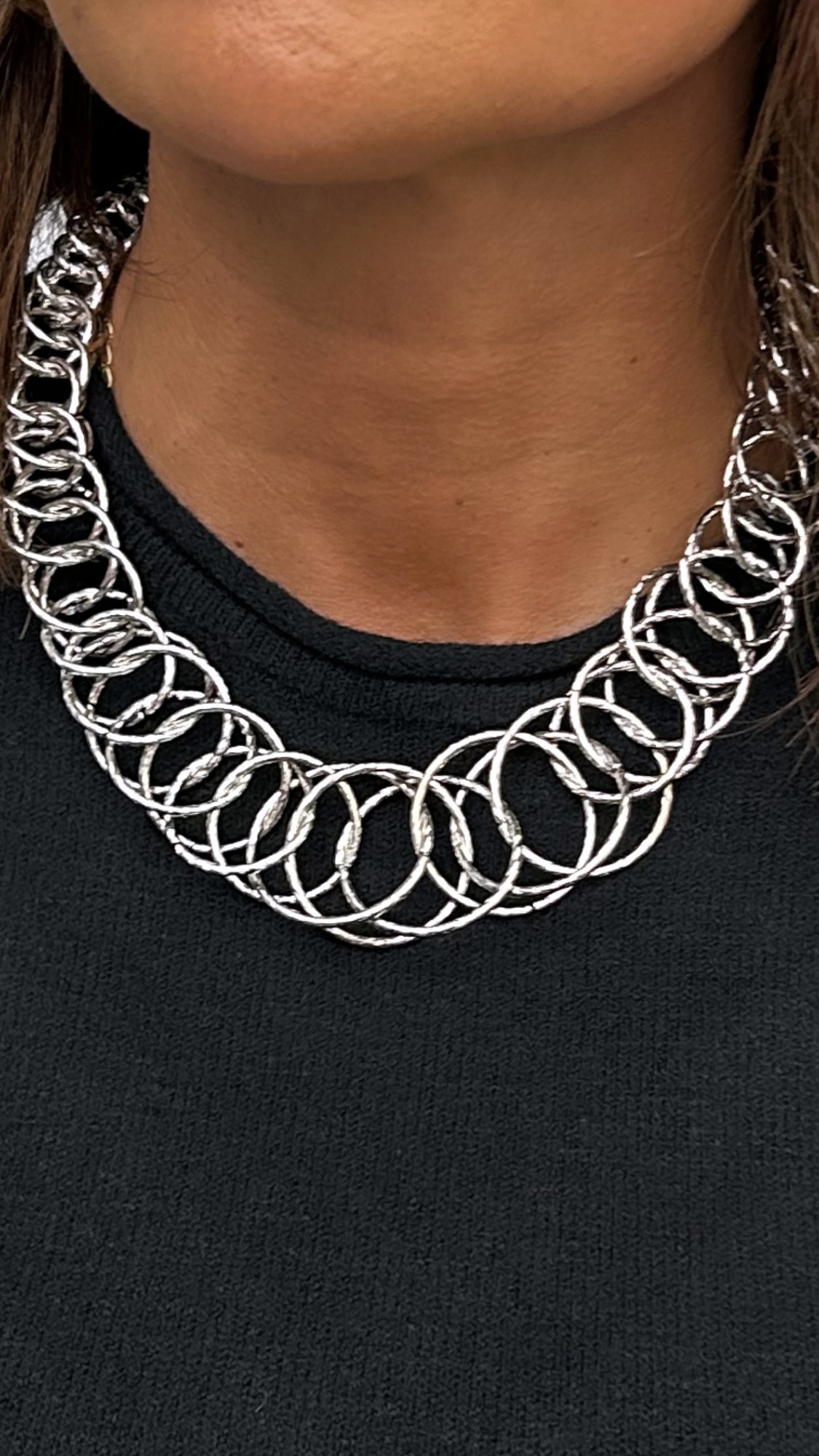 Collar de aros de diferentes tamaños engarzados entre sí disponible en dos opciones, dorado y plateado para que elijas el que más te gusta. Cierre clásico de enganche con diferentes medidas. Es de aleación y no pesa nada por lo que te resultará súper cómodo e irás divina!