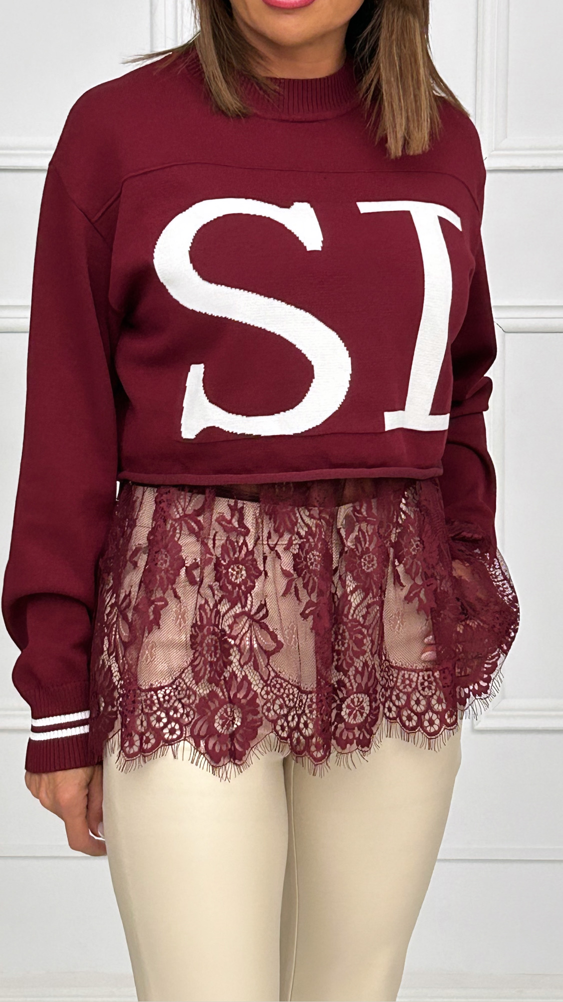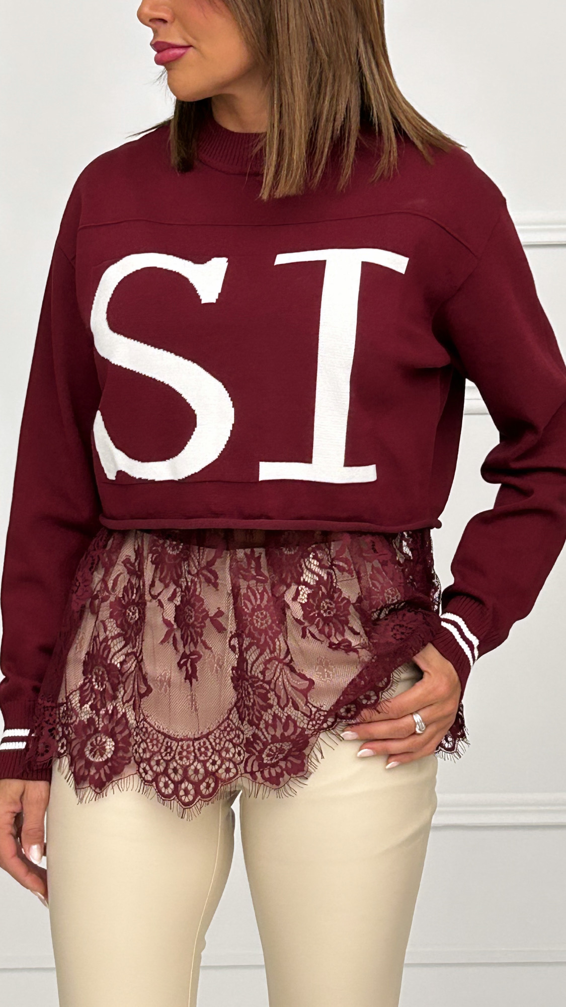 Conjunto de camiseta de tirantes con el bajo lencero y para poner encima un jersey estilo oversize corto con la palabra «SI» en diferente tono.