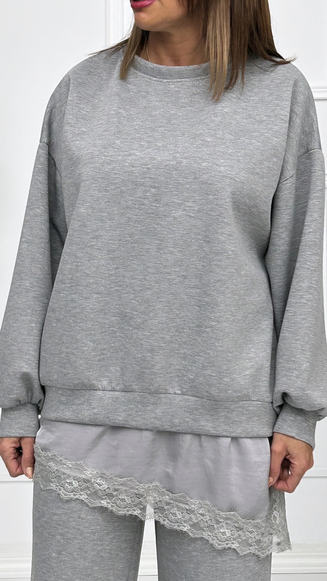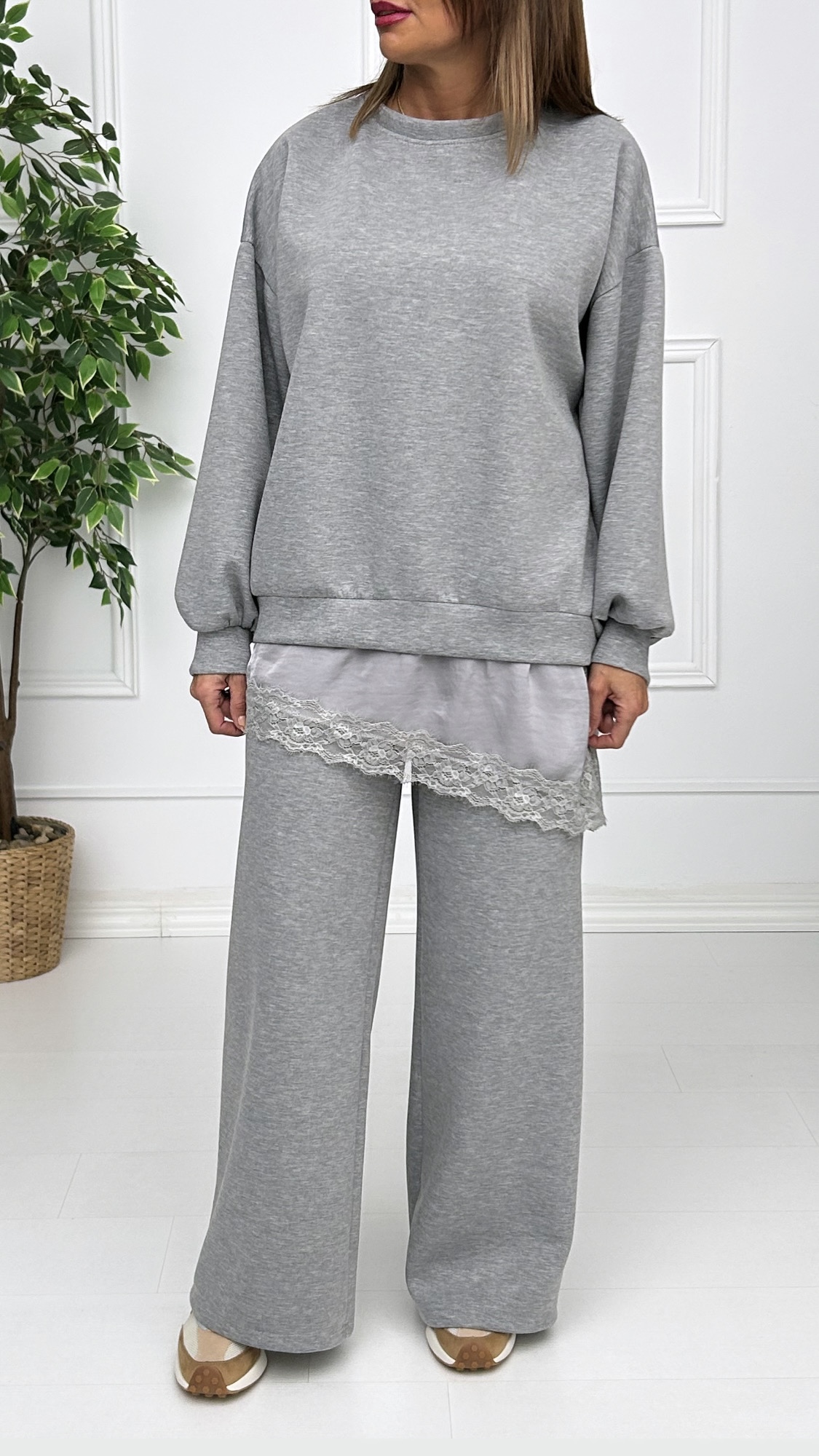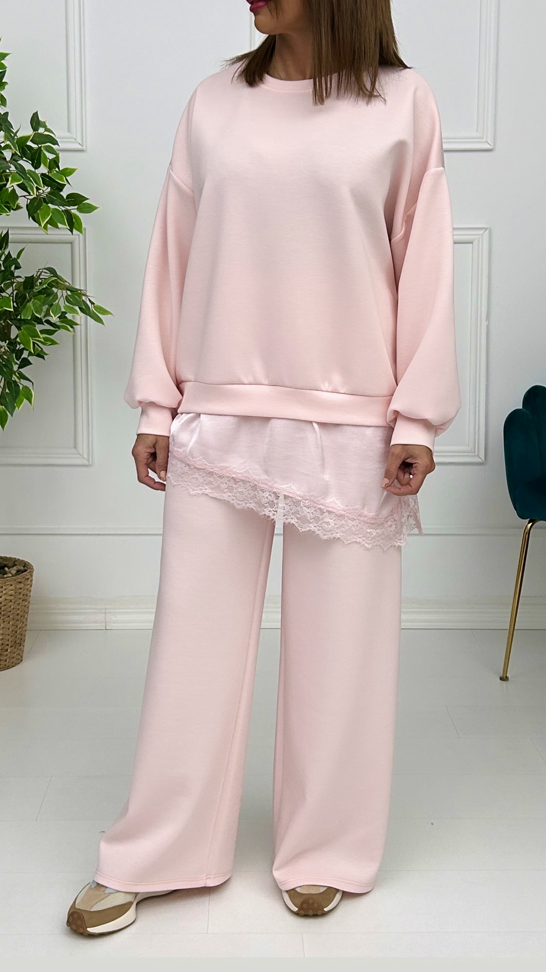 Conjunto de dos piezas de estilo deportivo. Muy cómodo, en tejido de capa de aire. Pantalón ancho de corte recto con goma en la cintura que combina con jersey de manga larga y cuello redondo. Lleva un añadido en el bajo simulando una lencera asimétrica con abertura en los laterales y ribete de encaje en el mismo color.