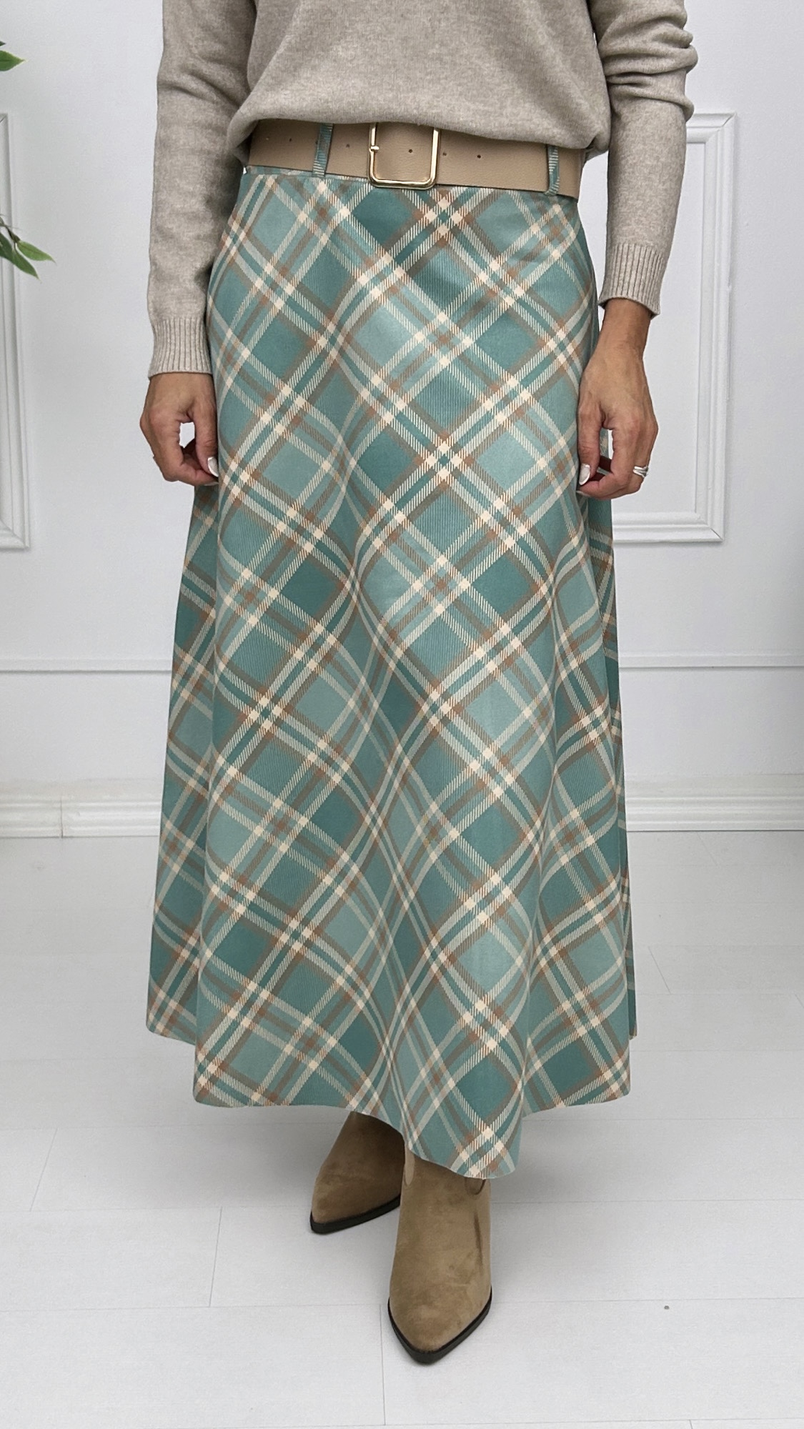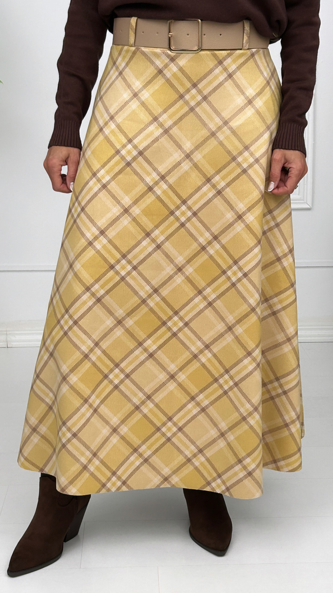 La falda de cuadros que está de súper tendencia llega a Arancha Konde! De corte evasé y estampado de cuadros en diferentes combinaciones de colores. Tejido muy suave, de antelina. Goma en la cintura para adaptarse a tu talla y cinturón incluido con hebilla cuadrada en dorado.