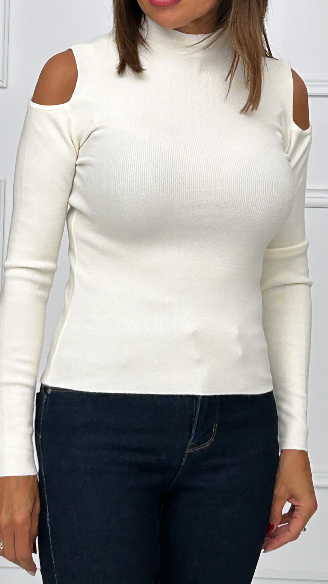 Jersey de punto fino disponible en dos colores básicos que no pueden faltar en tu fondo de armario. De manga larga, cuello redondo y con el detalle especial de los hombros al descubierto. Es un modelo que estira pero queda pegadito.