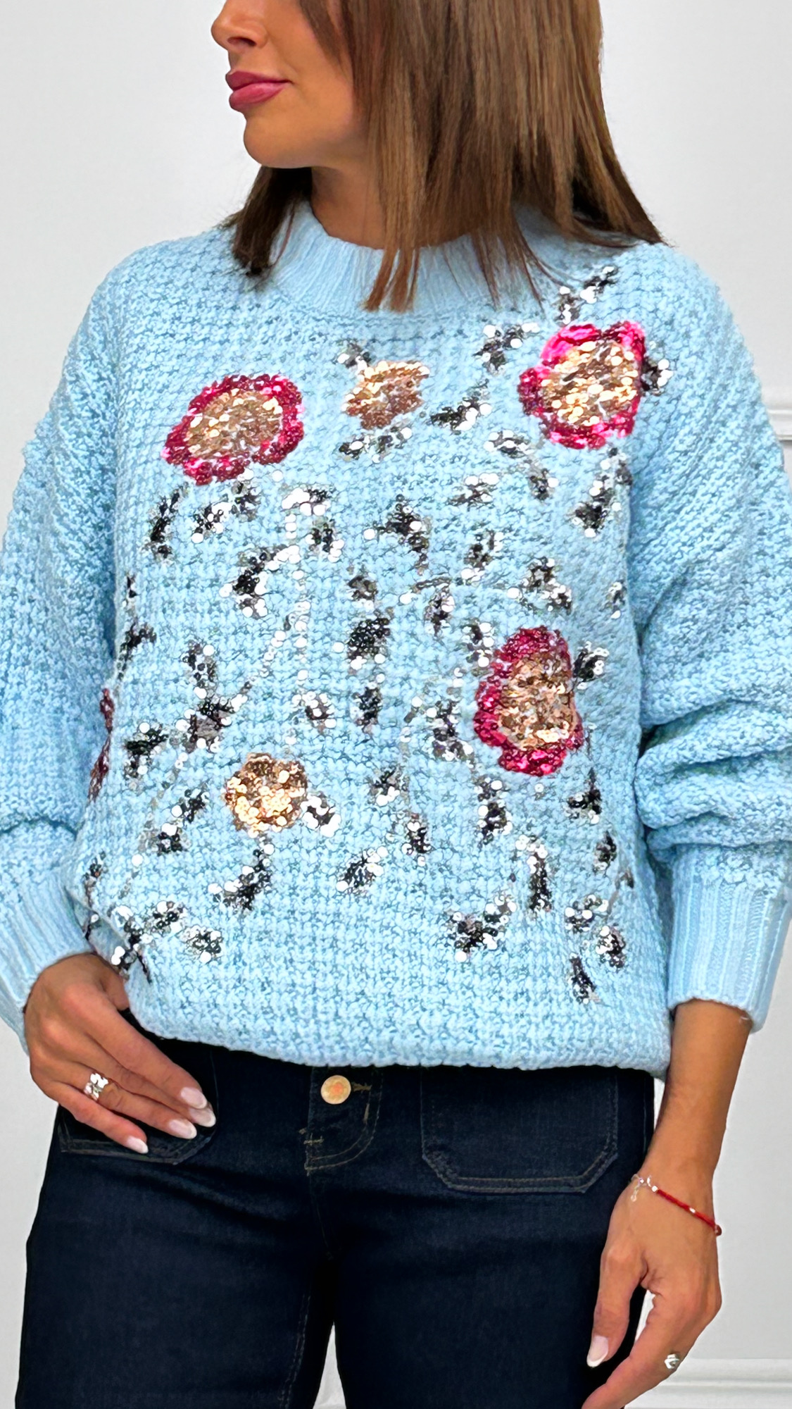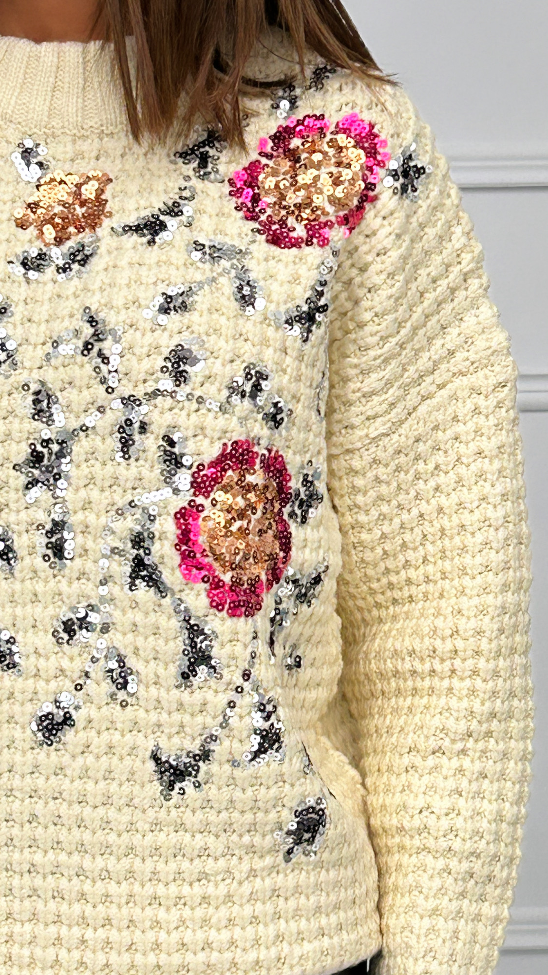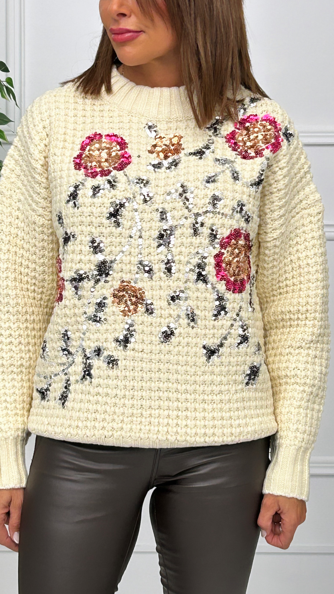 Jersey de punto gordito, con cuello redondo y puño. Un jersey que nos encanta y que está disponible en varios colores. Un detalle especial que le aporta vistosidad son las lentejuelas pequeñitas que lleva en la parte del pecho formando unas flores en diferentes tonos. Una prenda súper calentita y elegante para un día especial o para usar con tus vaqueros favoritos de un modo más informal.