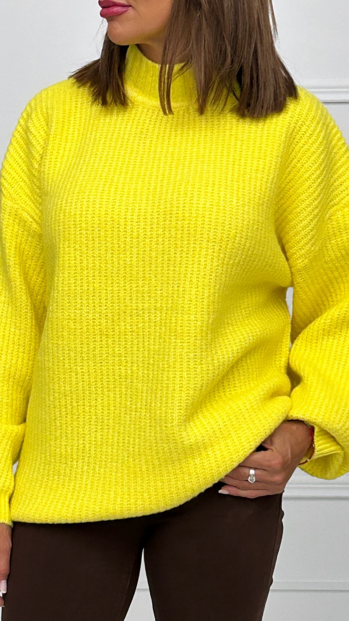 Jersey de punto grueso con cuello chimenea perfecto para la nueva temporada. Estilo ancho ideal para todo tipo de cuerpos. De colores súper vibrantes para dar luz a nuestros días mas otoñales.