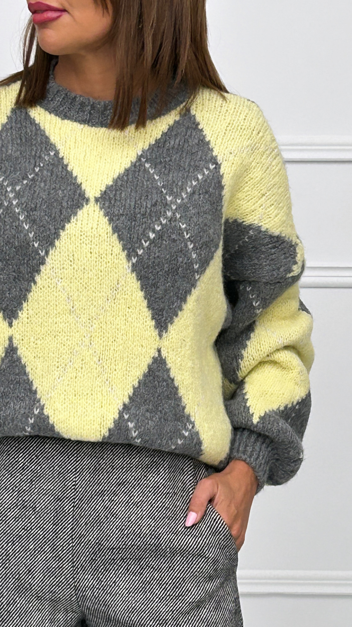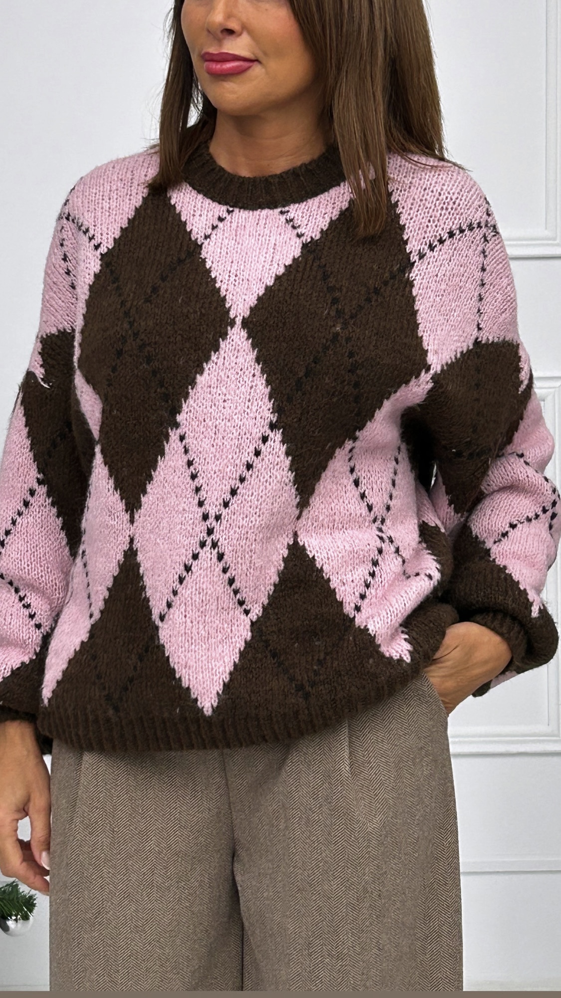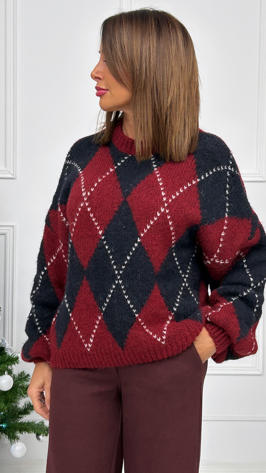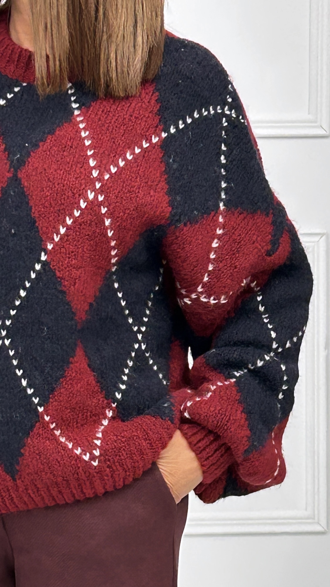 Jersey de punto perfecto para el invierno, de cuello redondo y manga ancha. Con estampado de rombos en dos tonos súper bien combinados para lucir radiante.