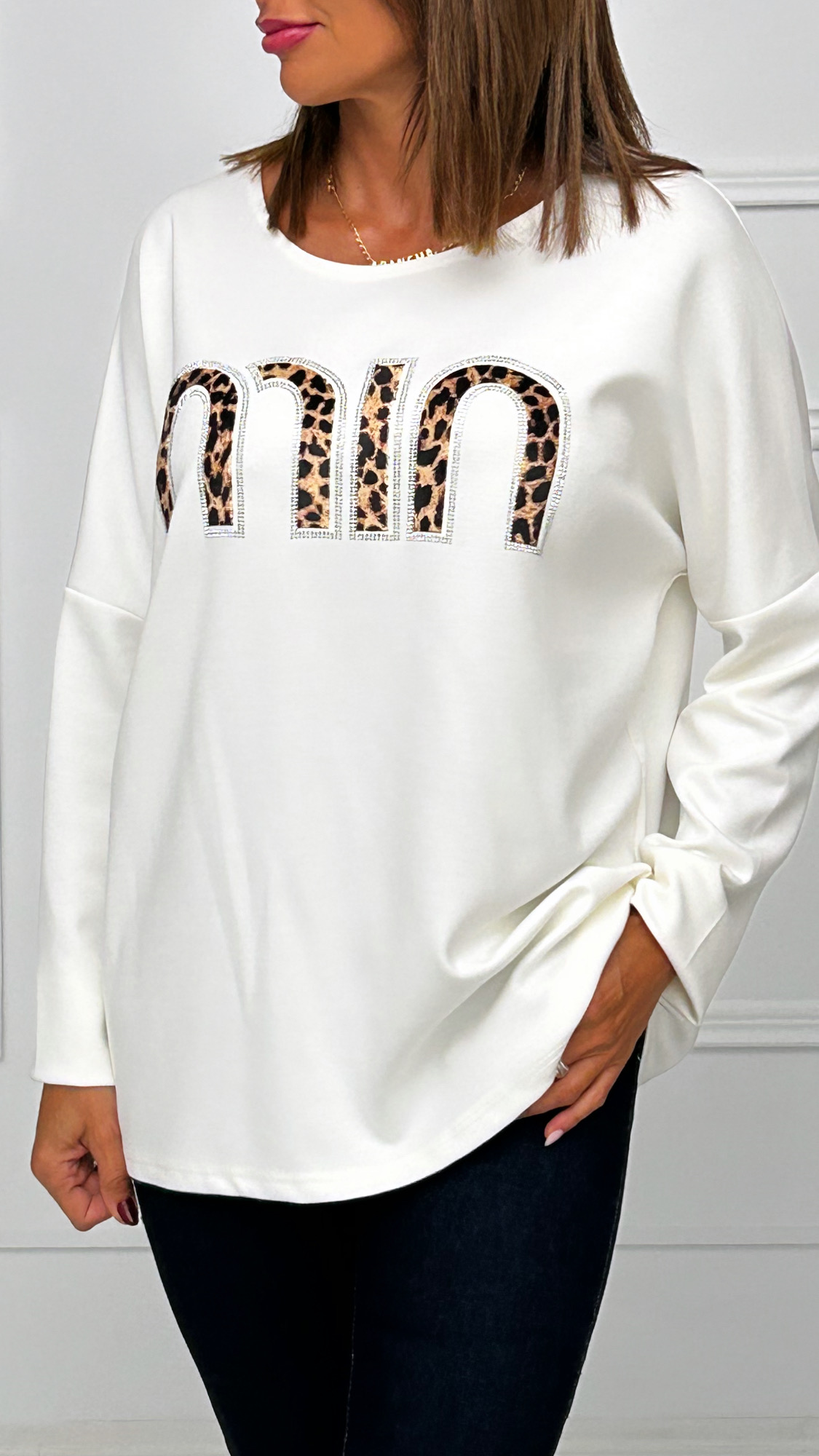 Jersey de tela de sudadera con cuello redondo y manga larga. Diseñada con la palabra MIN en leopardo aterciopleado con brillos plata a su alrededor dándole un toque luminoso y precioso a esta prenda.