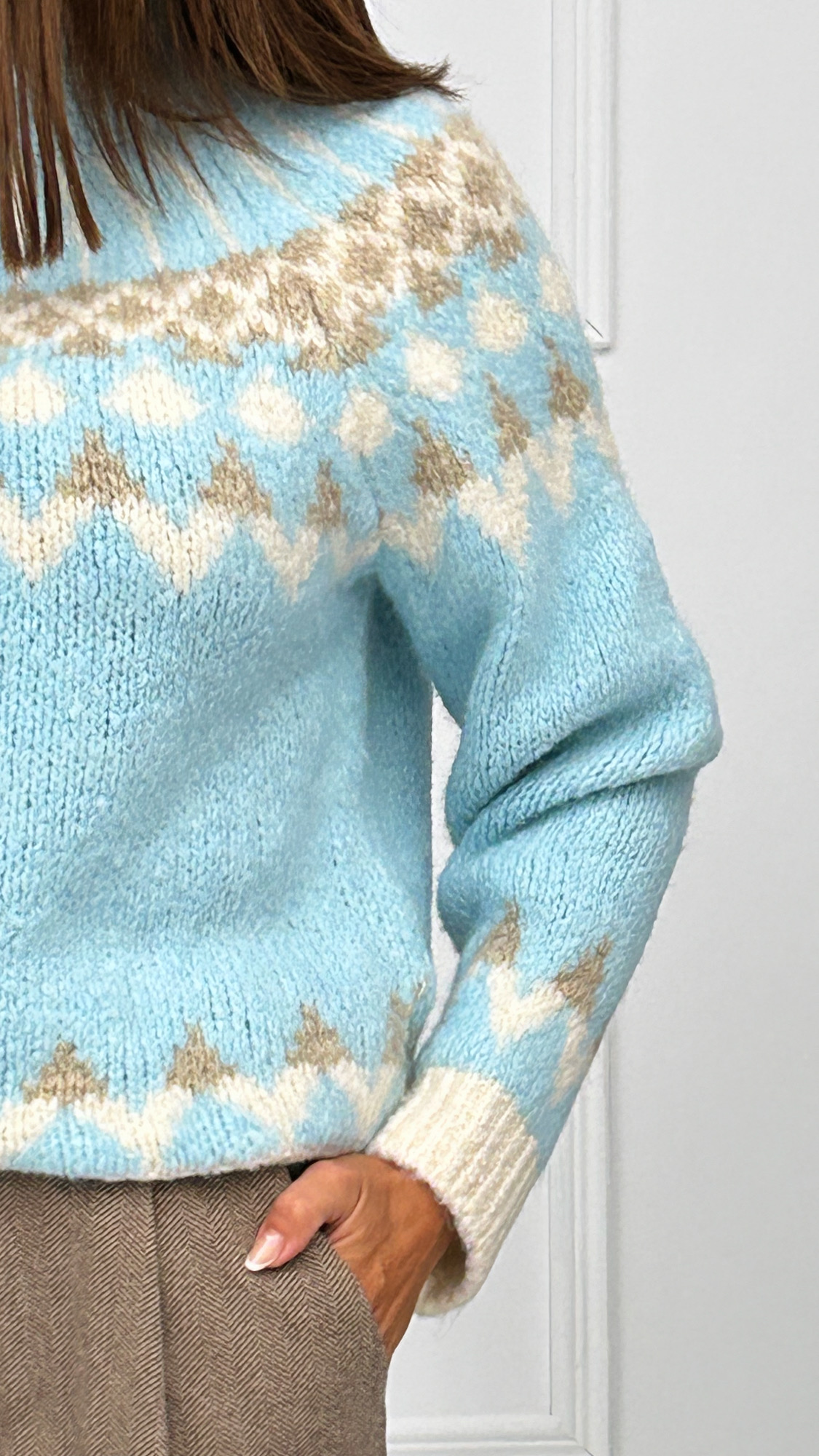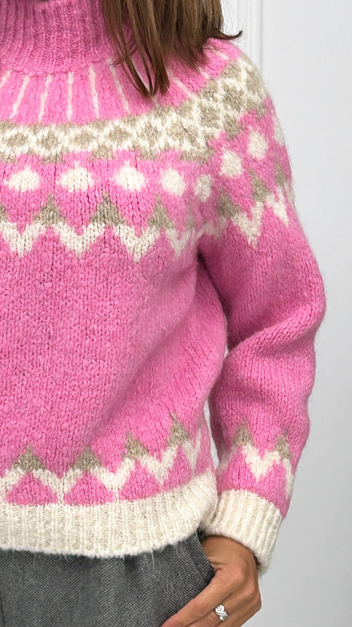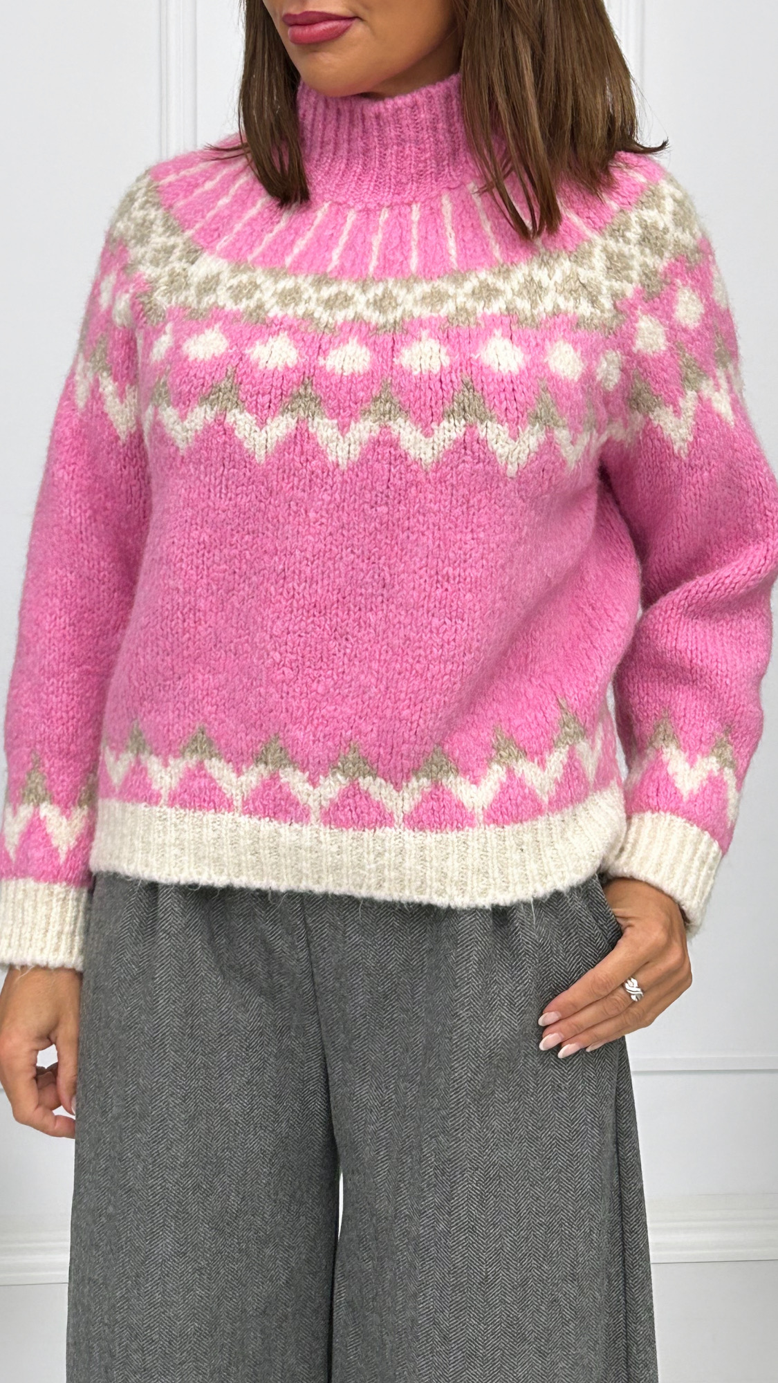 Jersey de punto gordo, perfecto para el invierno. De cuello subido y diseñado con grecas en diversos colores dándole un toque muy bonito a la prenda.