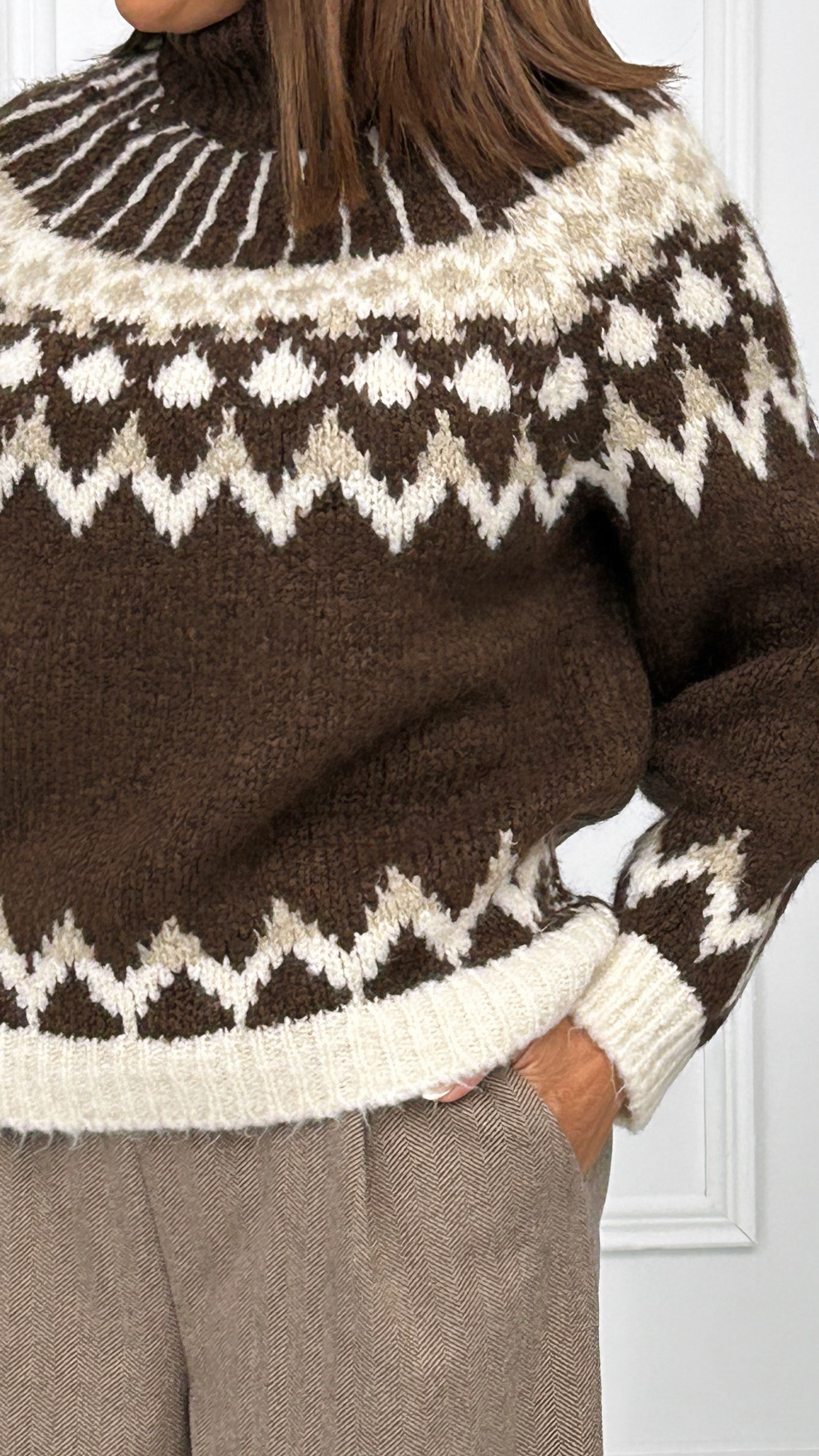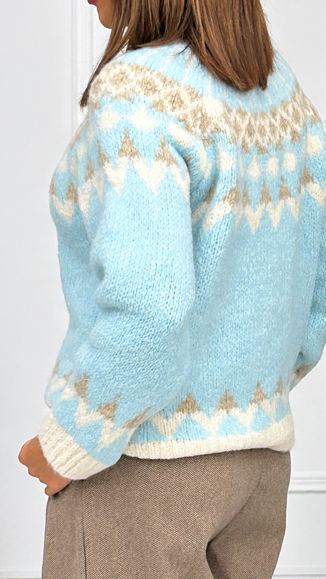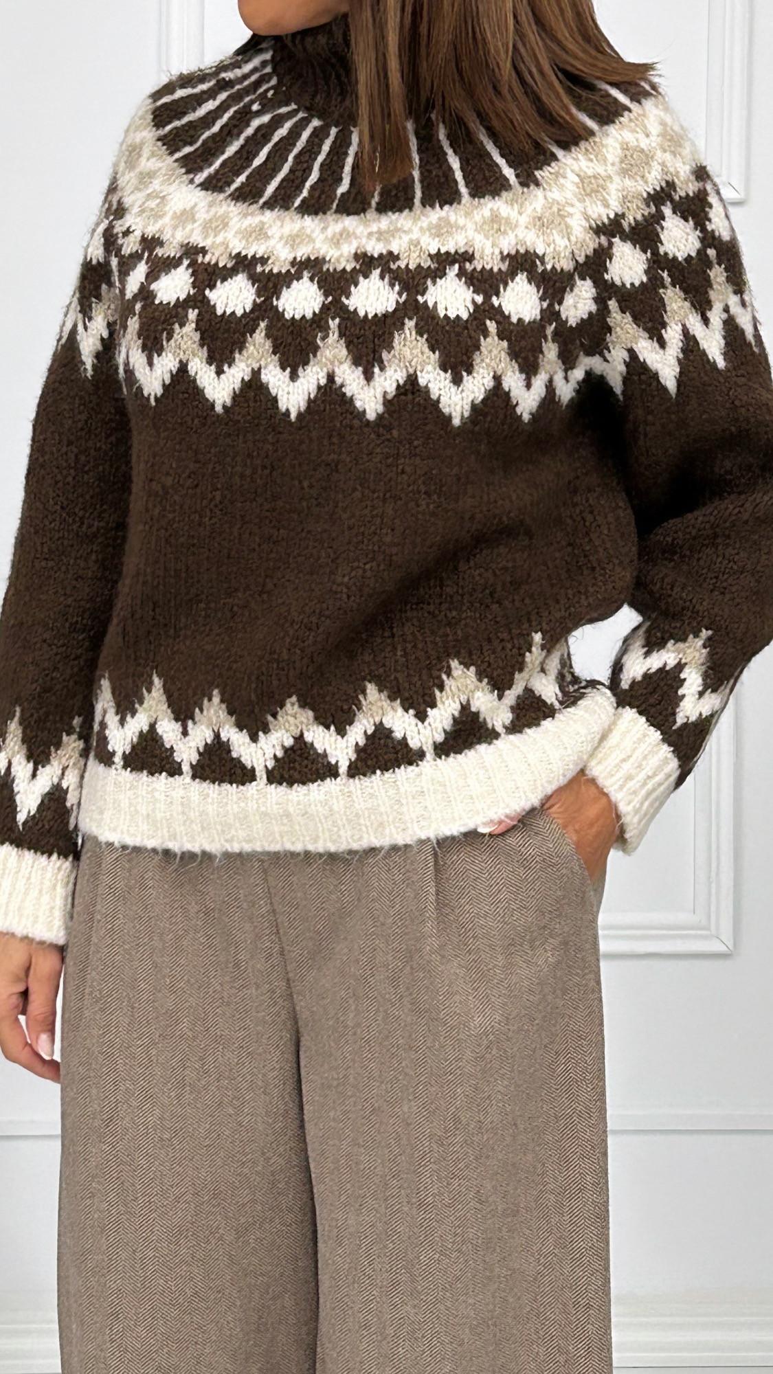 Jersey de punto gordo, perfecto para el invierno. De cuello subido y diseñado con grecas en diversos colores dándole un toque muy bonito a la prenda.