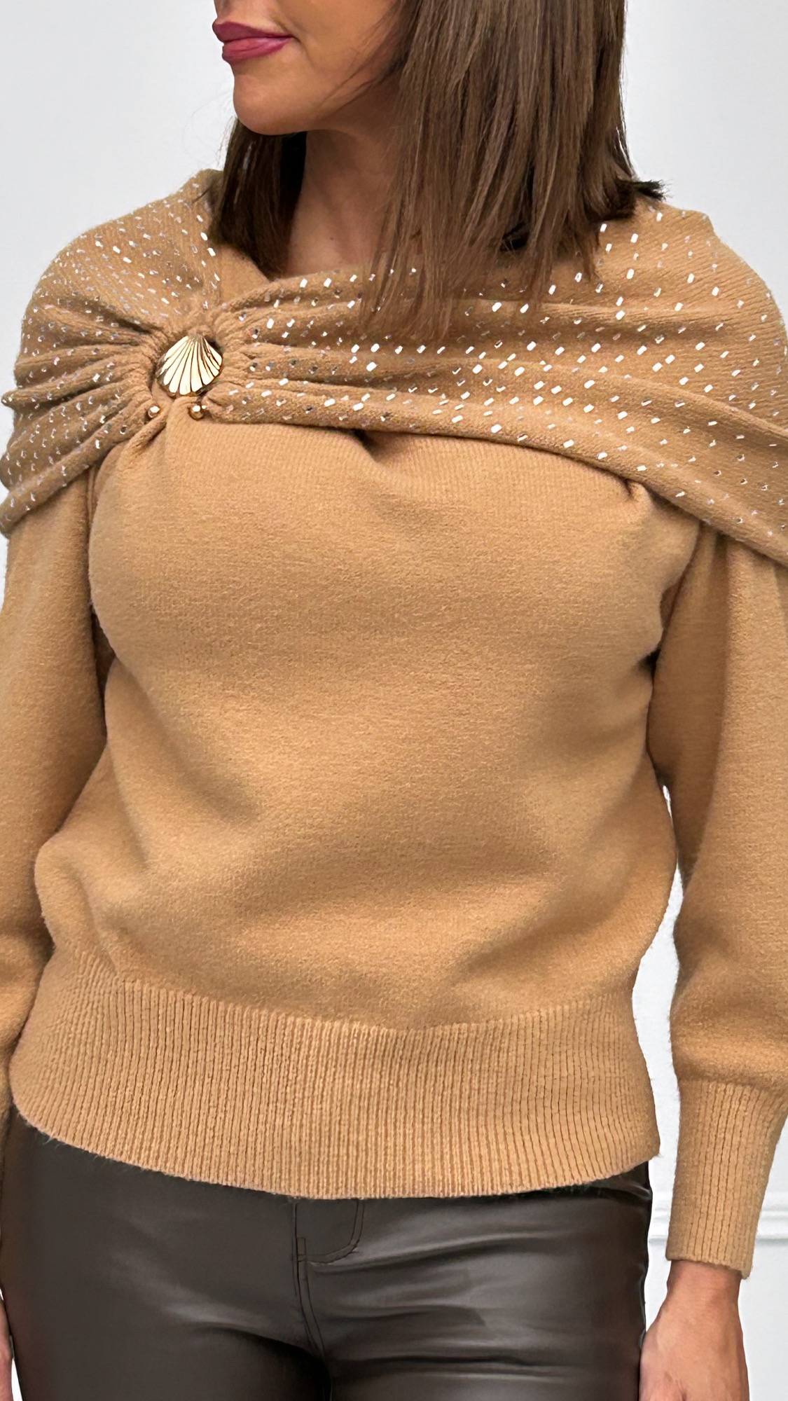 Jersey de punto súper especial disponible en dos colores muy combinables. Lleva escote Bardot con una especie de capa súper puesta que puedes llevar con los hombros al aire o tapados si estás más cómoda y te gusta más. Tiene como detalle especial en toda la parte del escote cristales tanto en la parte delantera como en la espalda. Un detalle más es la concha en dorado que lleva hacia un lateral haciendo un pequeño fruncido.