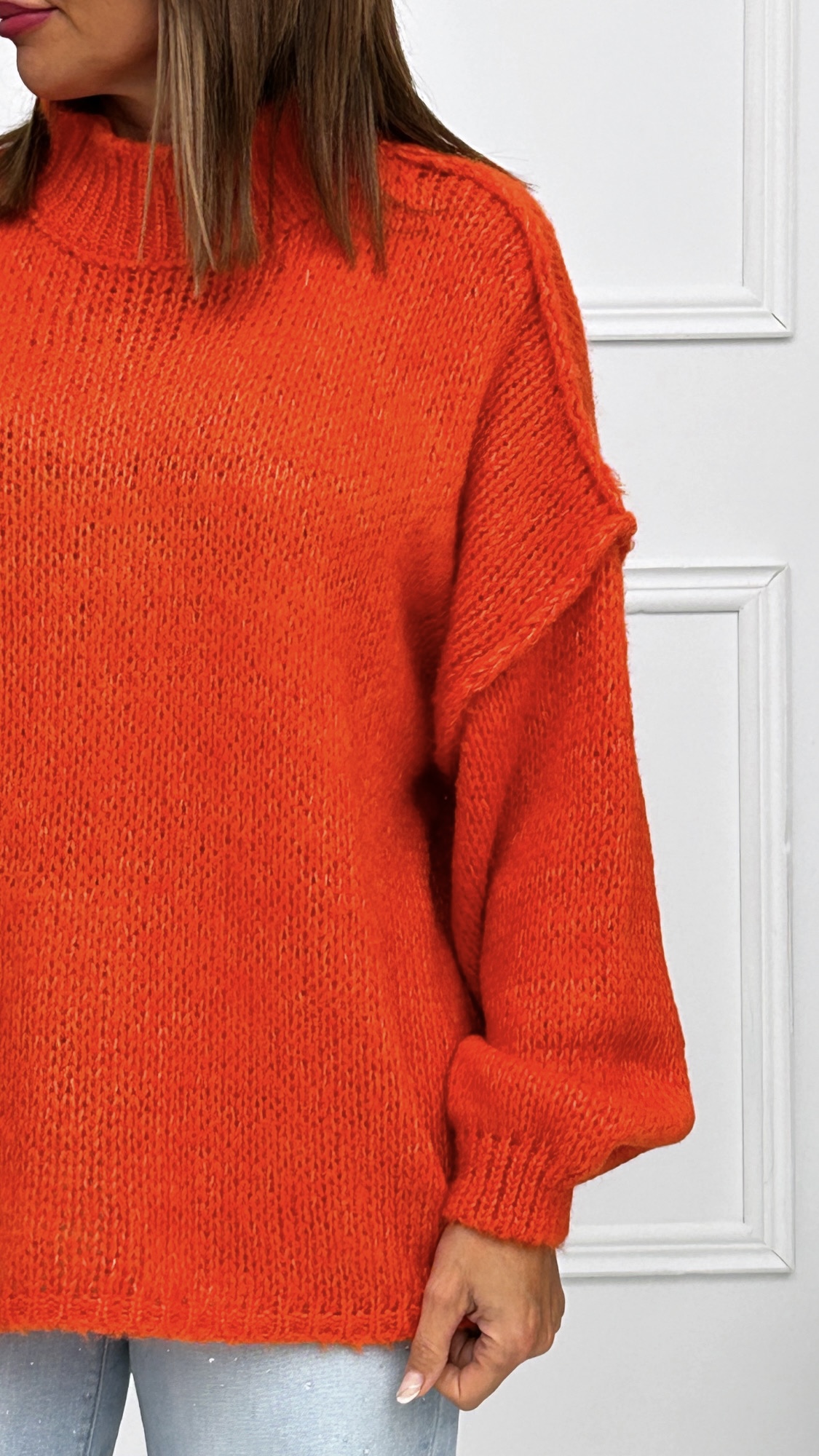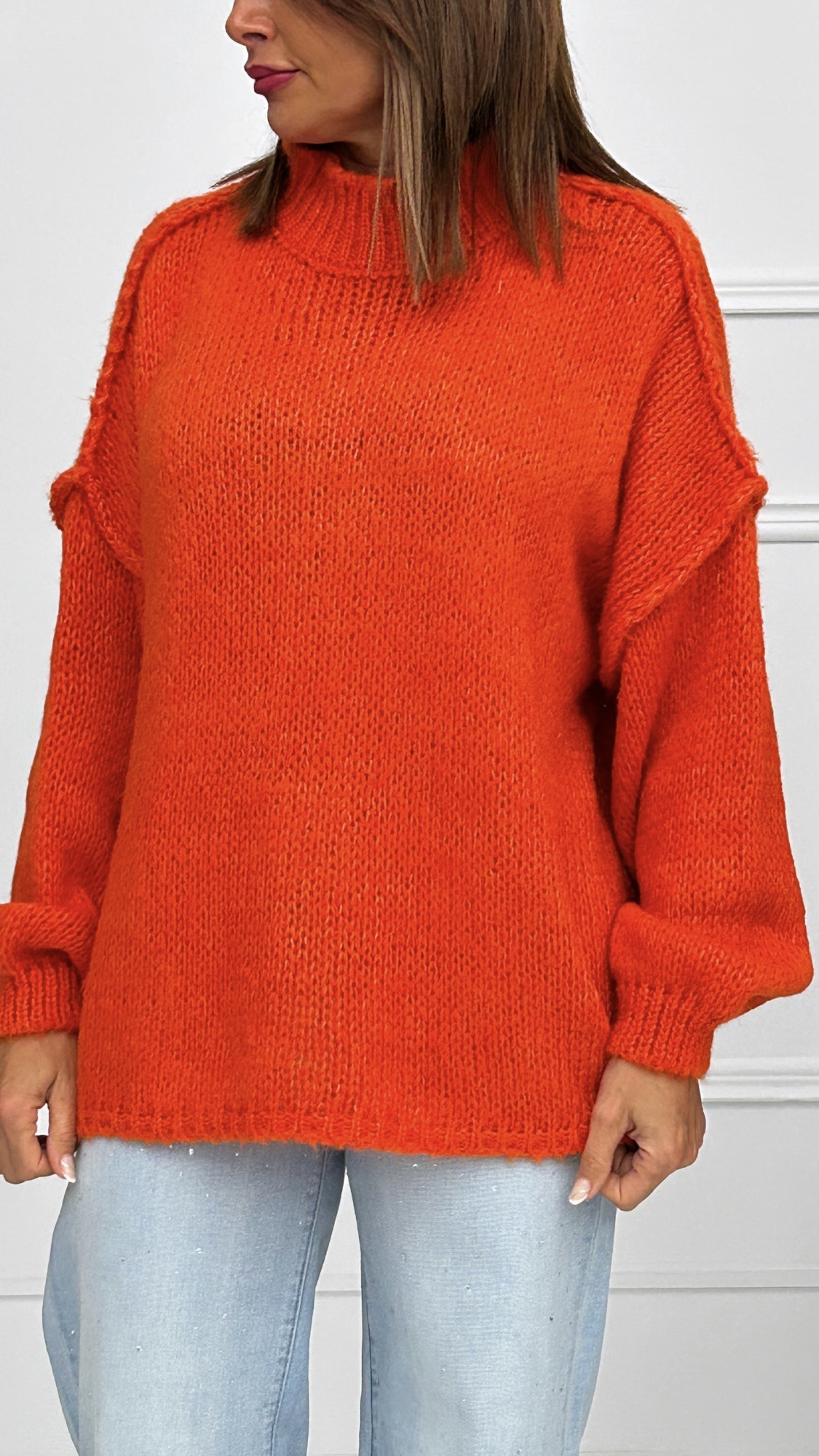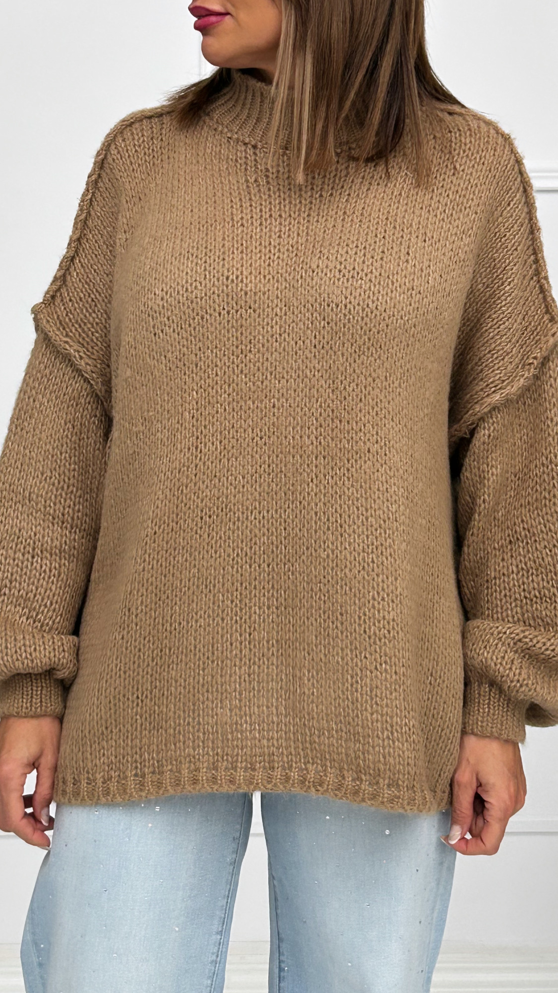 Jersey de punto gordo estilo oversize con originales costuras voluminosas. Cuello chimenea y manga larga para ir bien abrigadas. Talla única.