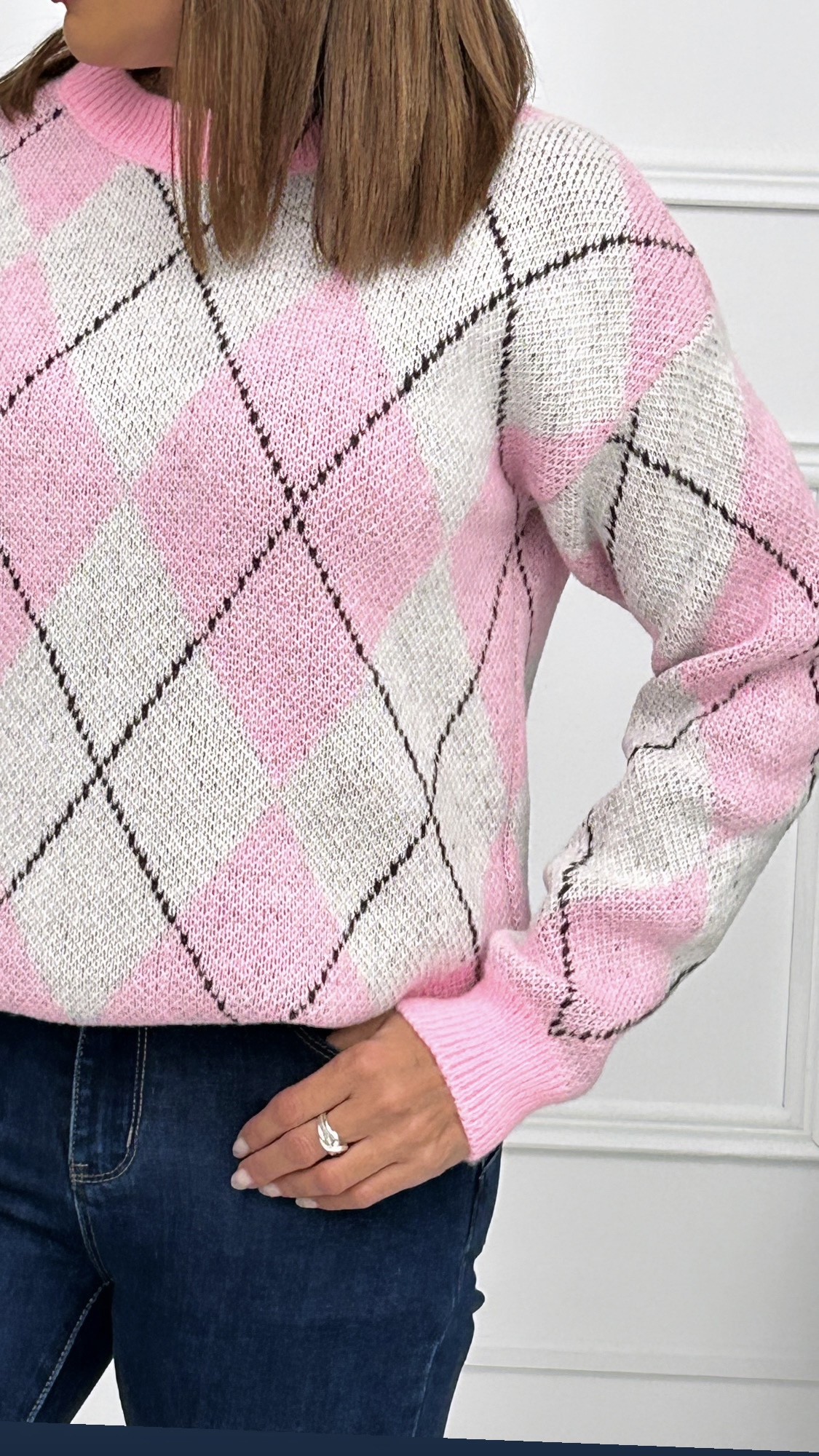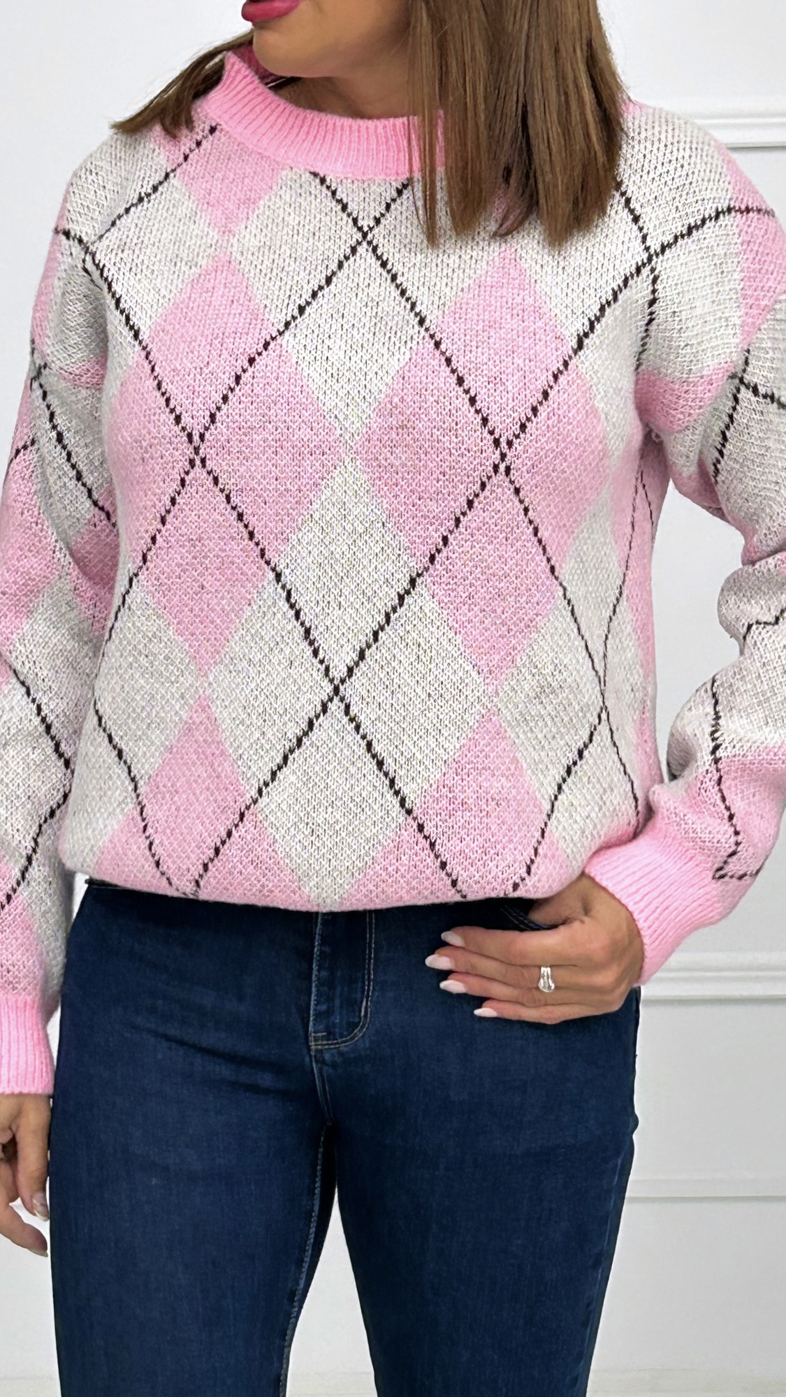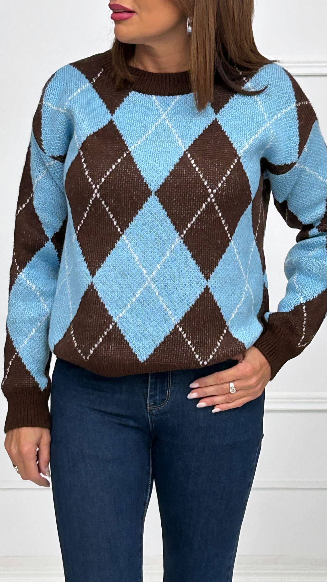 Jersey de punto diseñado en rombos con dos tonos, perfectos para nuestros pantalones de temporada. De cuello redondo y manga larga.