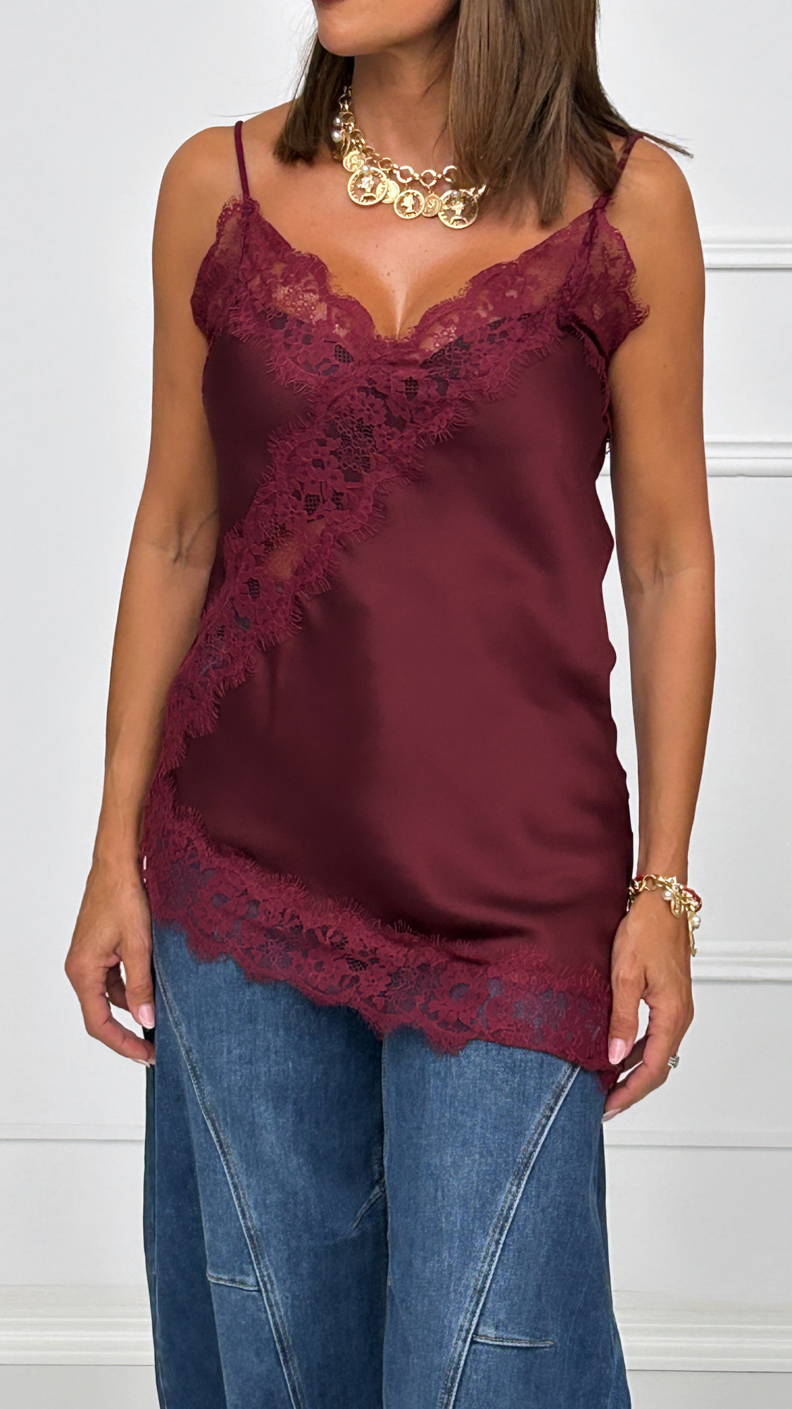 Lencera asimétrica con tirante de cola de ratón y transparencia en la zona de la puntilla que rodea el cuerpo. Una prenda súper elegante que nos hará llevar un look espectacular.