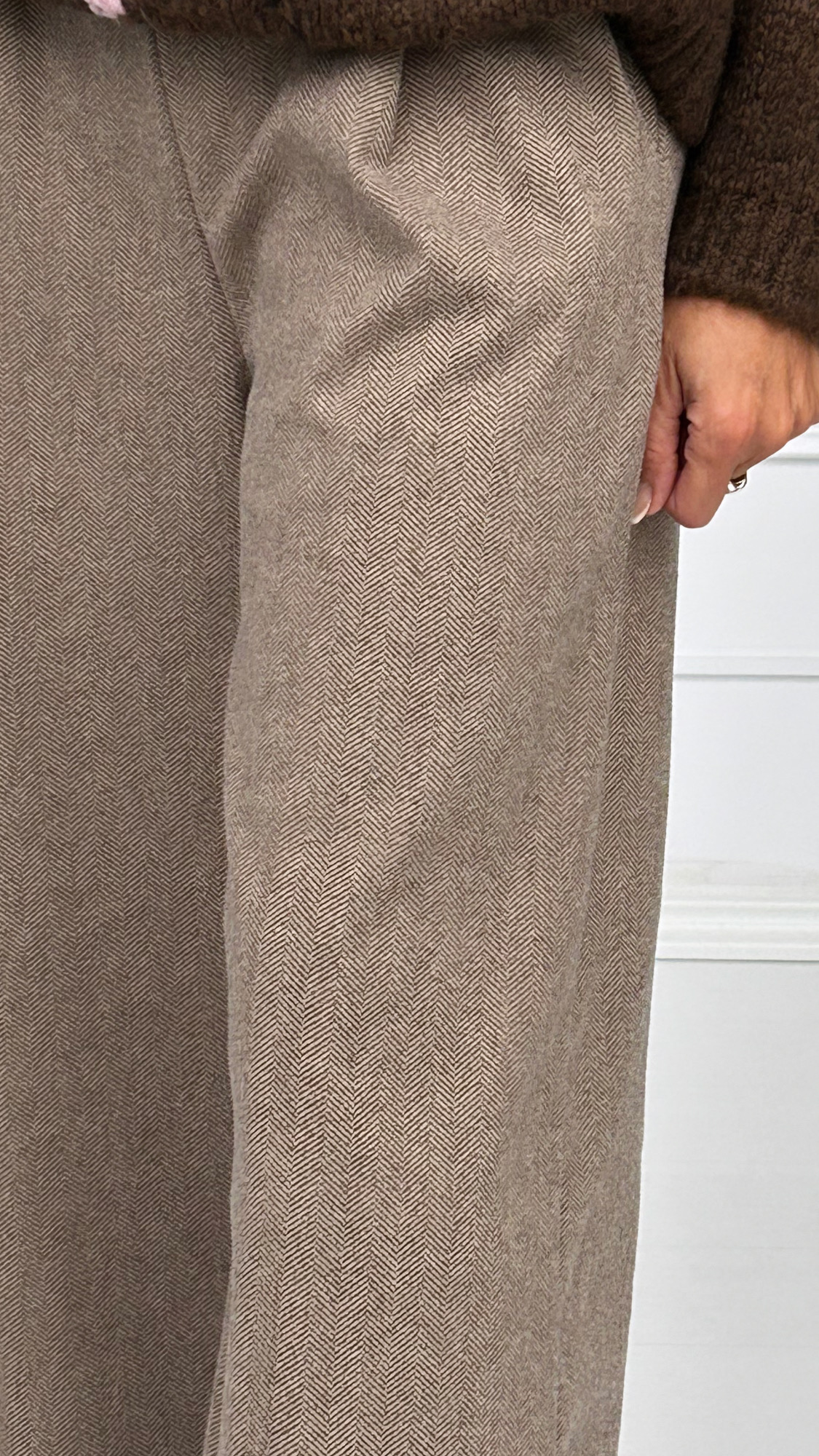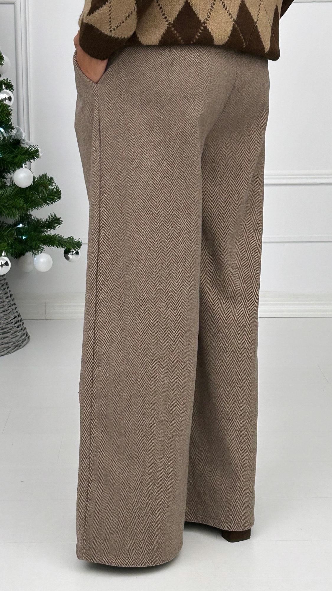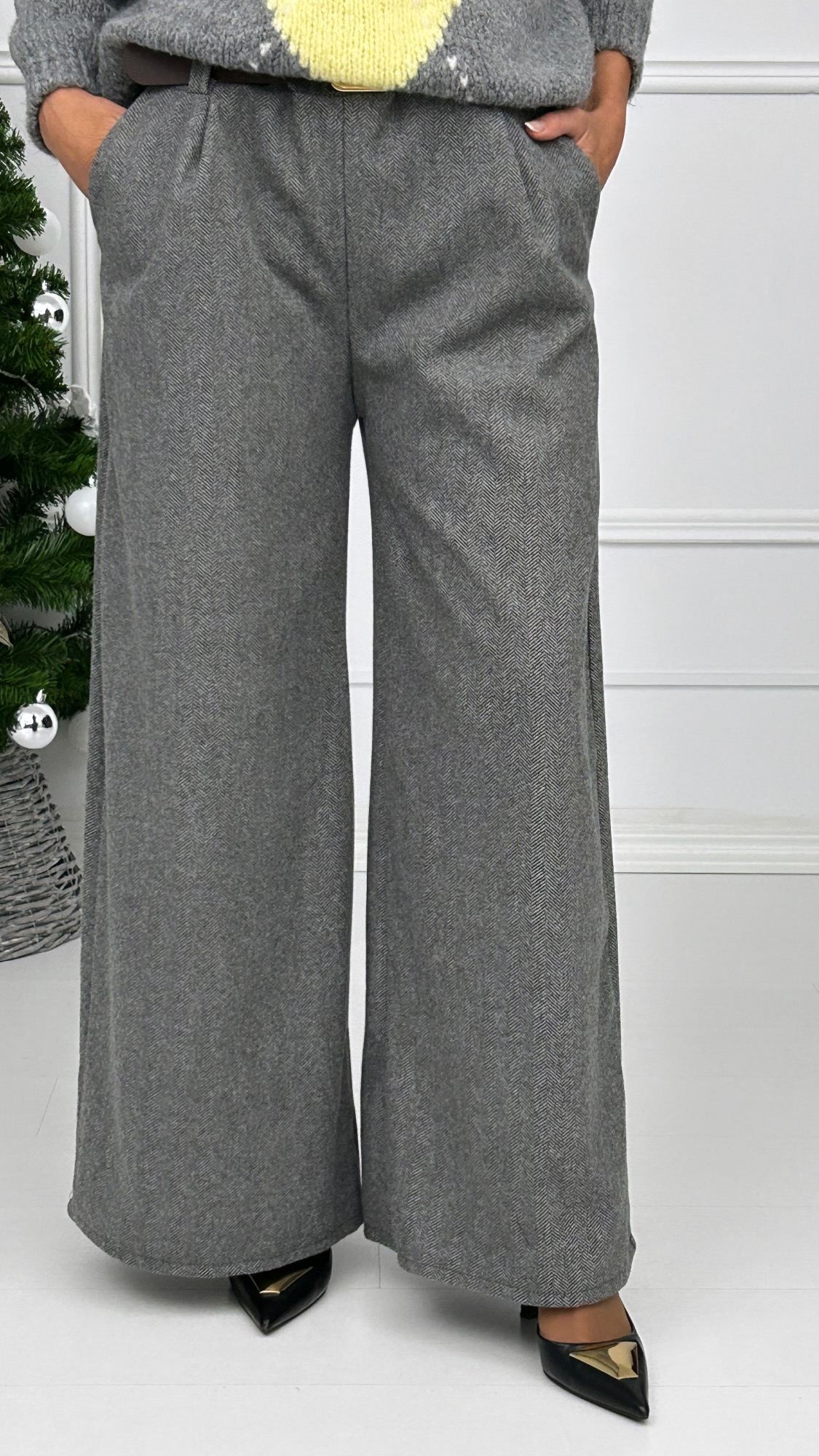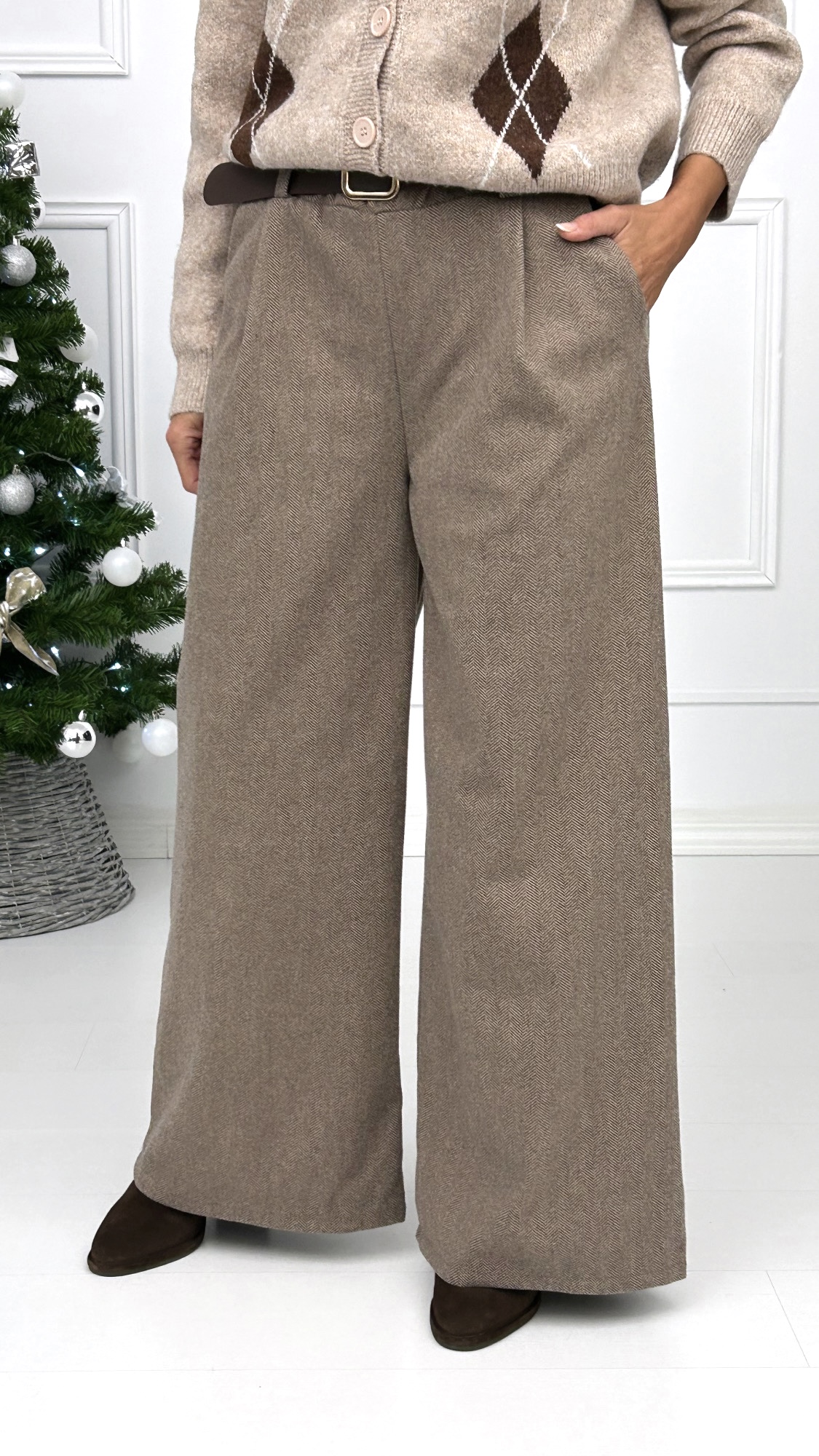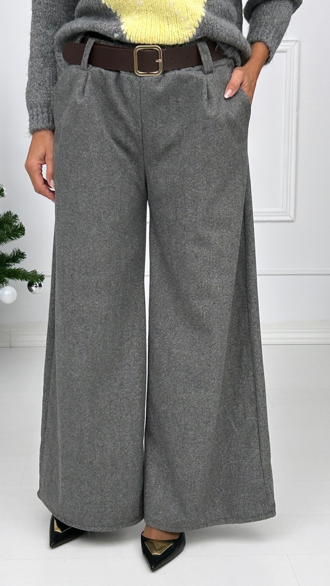 Pantalón de pierna ancha disponible en varios colores muy combinables con el clásico estampado de espiga. Tiene goma en la cintura y bolsillos laterales. Lleva dos pinzas en la parte delantera e incluye un cinturón ancho con hebilla cuadrada en dorado. Tejido súper suave y elegante para esta temporada!